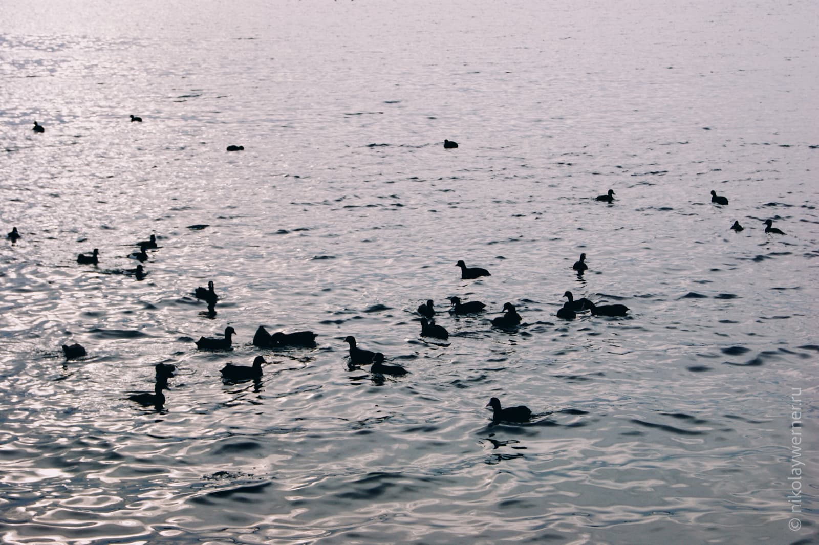 Птицы качаются на волнах, скрываясь от зимних холодов в Геленджикской бухте.