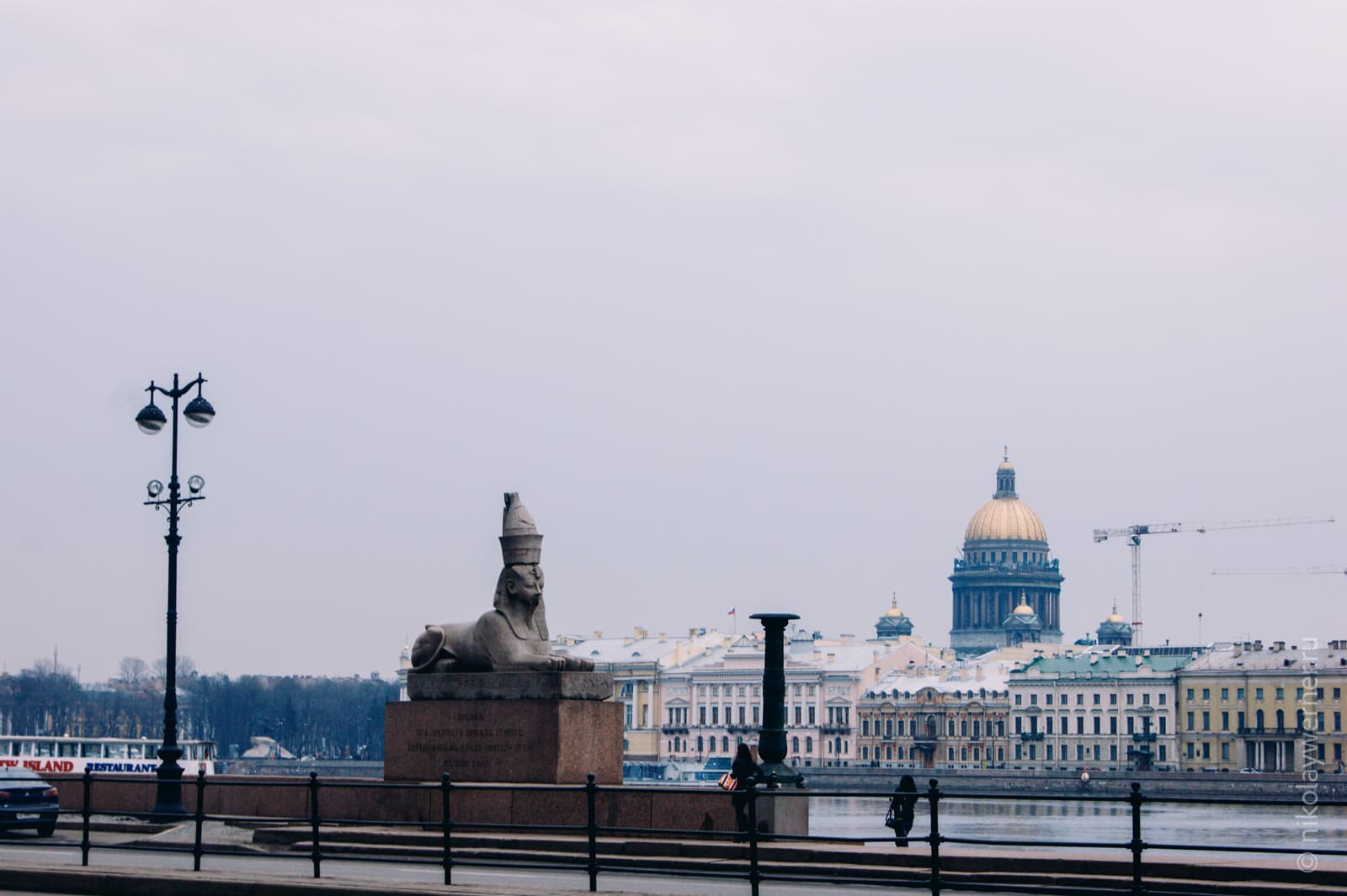 Сфинкс на Университетской набережной и купол Исаакиевского собора вдали.