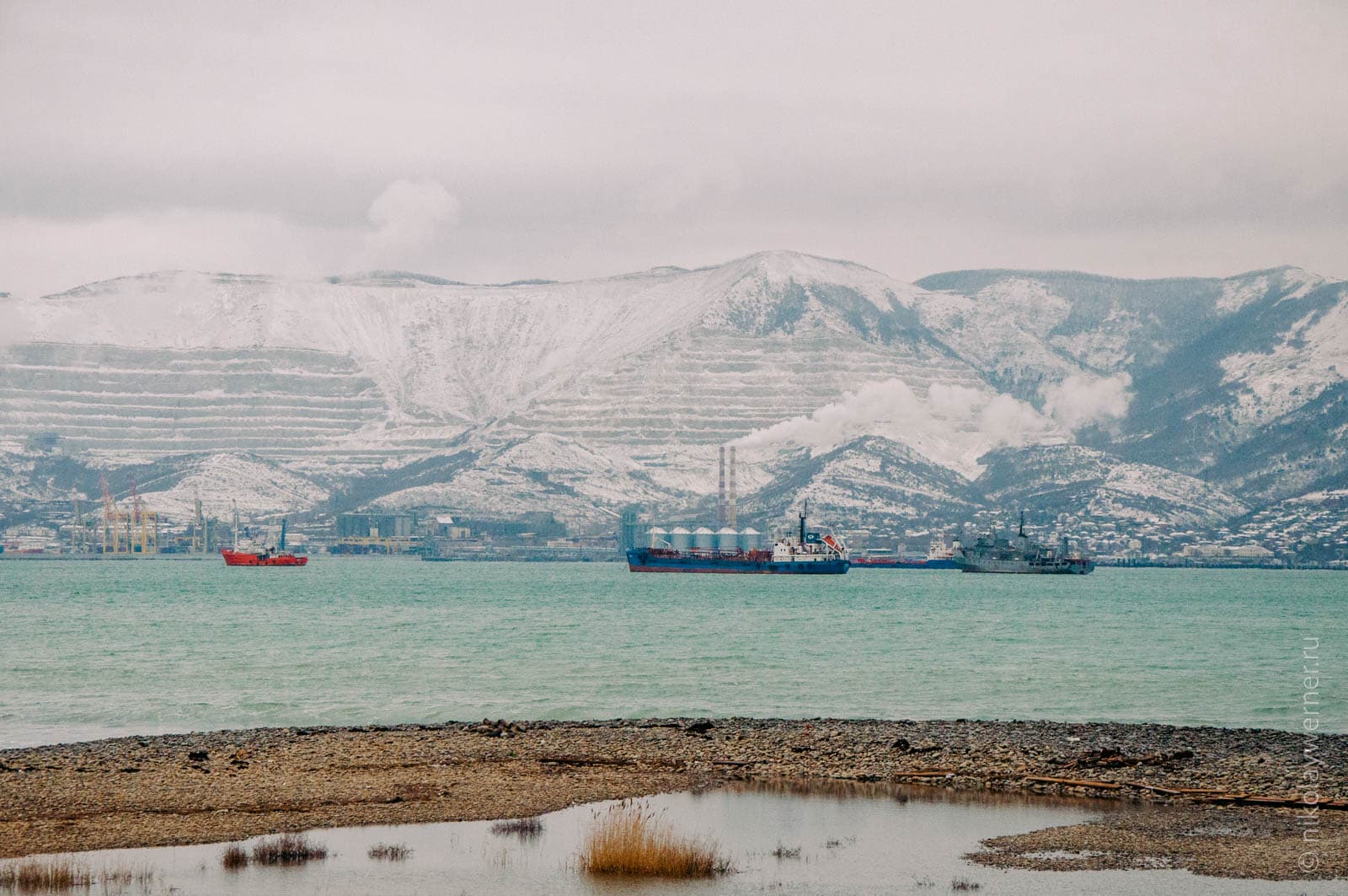 Бухту плотным полукольцом окружает стена гор. Склоны присыпаны снегом, свинцовый полог облаков местами обволакивает вершины. Пейзаж создал иллюзию, что я вовсе не в черноморском городе, а стою среди Норвежских фьордов.