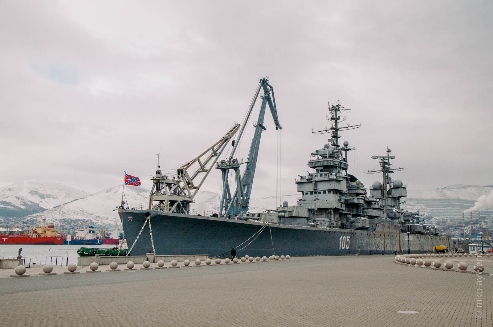 Дальше путь лежал на центральную набережную. На вечном приколе стоит махина крейсера «Михаил Кутузов». Говорят, что его огневой мощи хватит чтобы за 3 часа сровнять с землей весь Новороссийск.