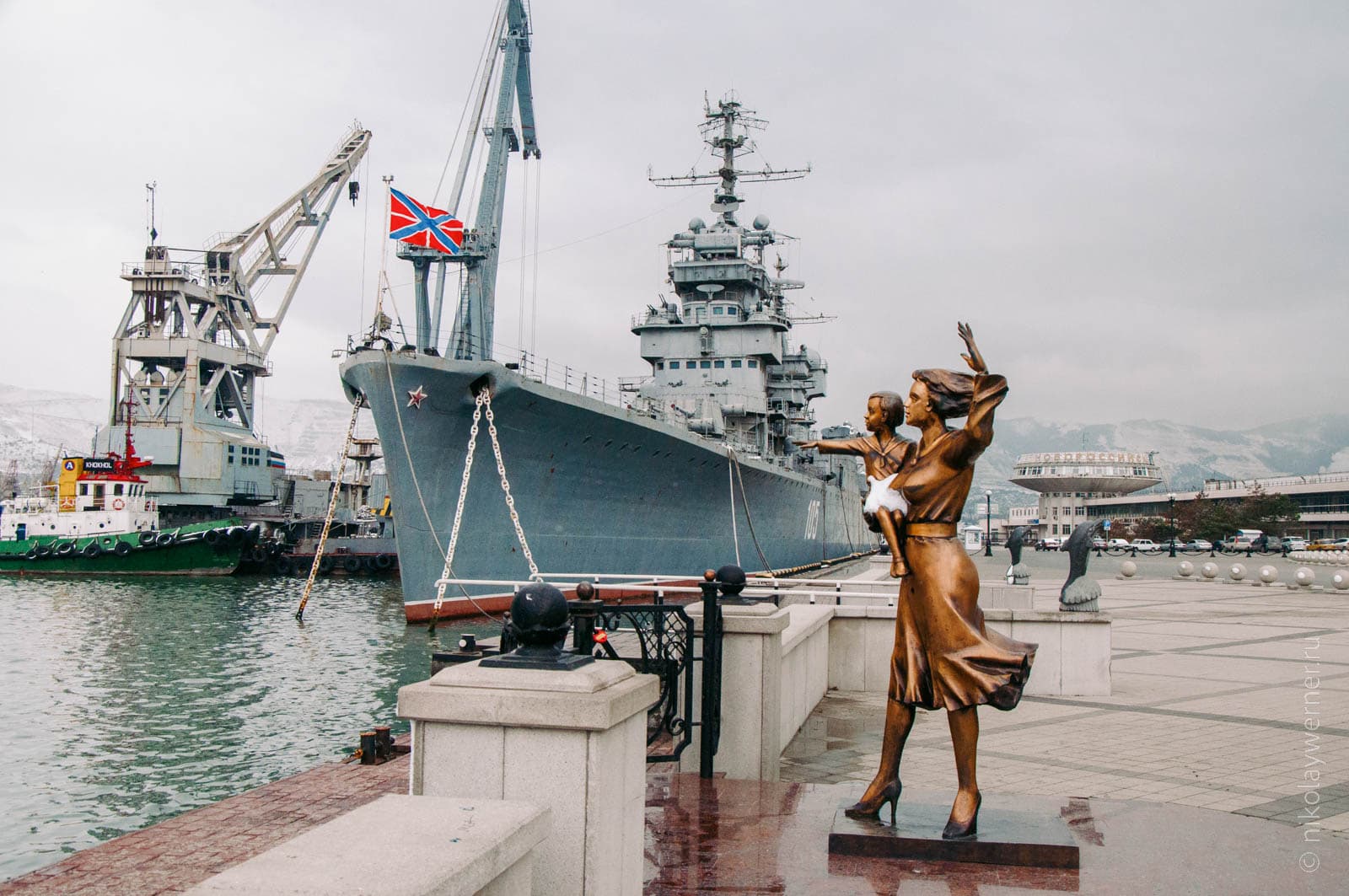 Возле крейсера новоделанная скульптура. Бронзовая женщина показывает такому-же бронзовому ребенку море и порт. Скульптура хороша, но по мне эффектней было если она смотрела бы не в порт, а в открытое море.
