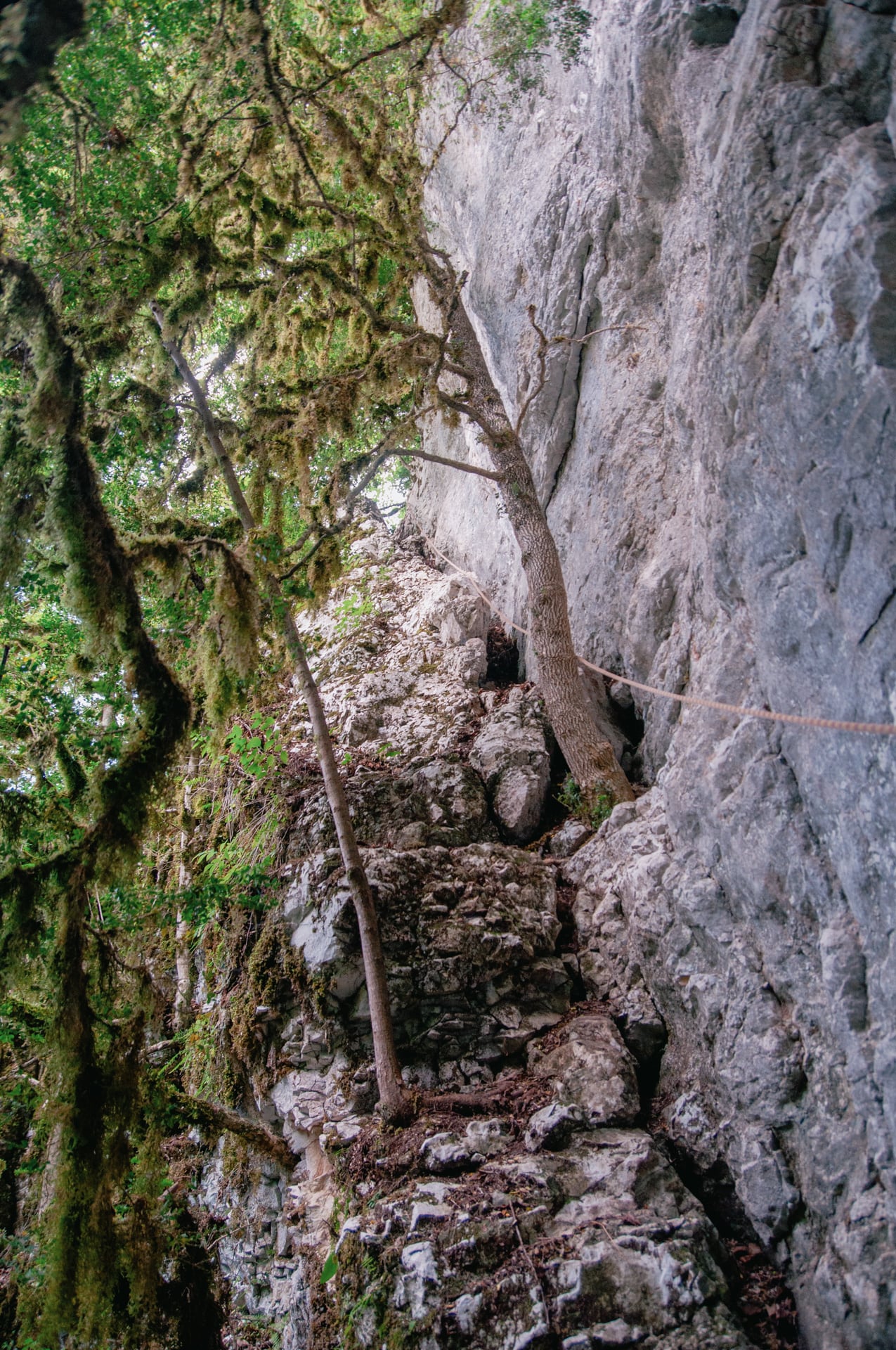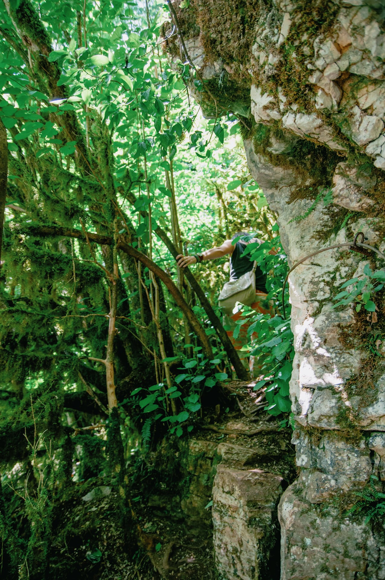 Мы вышли на ровную как тротуар полку. Жалко что она была коротка. Тропа нырнула вниз, мы поползли по землистому, угрожающе крутому склону. Лезли аккуратно, цеплялись за деревья, повязанный добрыми людьми трос, под конец даже немного попрыгали по камням и в итоге спустились к реке.
