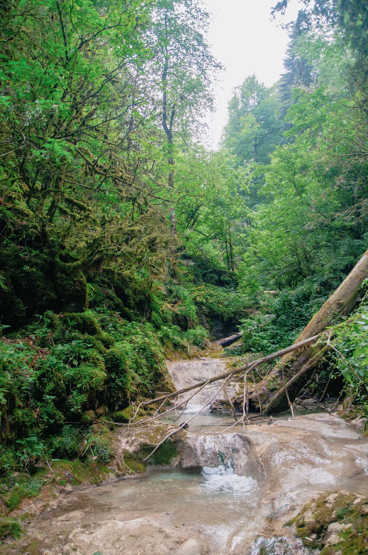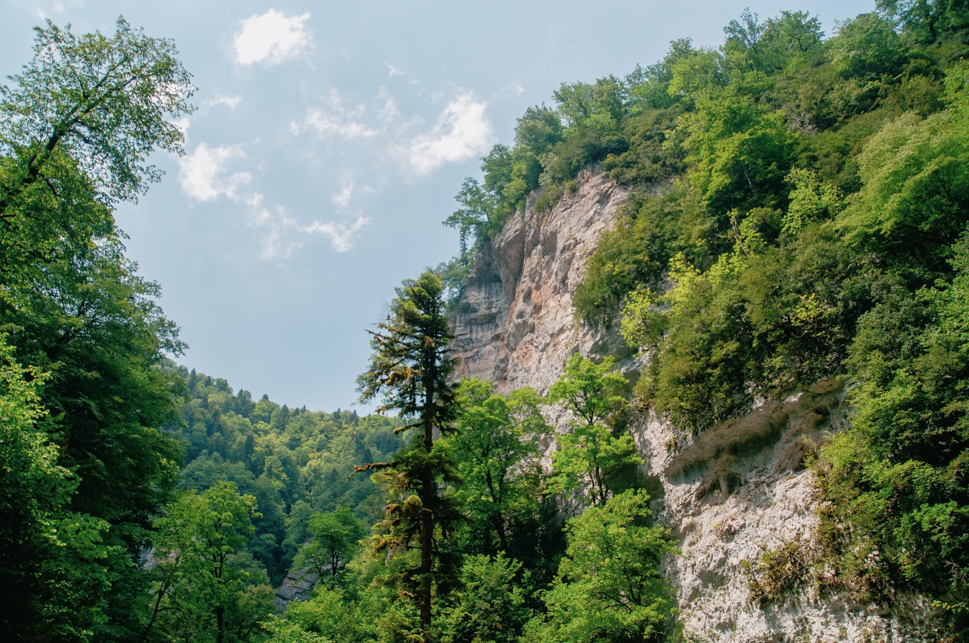 Виды захватили дух. Вниз по течению уходят залитые ярким дневным солнцем склоны. Вековые буки и пихты скрывают кронами неприступные кручи. Река то бурлит между валунов, то разливается заводями цвета лазури. Она скрывается за поворотом — течёт на встречу с Курджипс. А бежит она оттуда, где зелень наливается синевой, деревья не в силах скрыть отвесные скалы, которые могучими бастионами поднимаются ввысь и сжимают реку. Меж ними темно и только в вышине горят на солнце кроны.