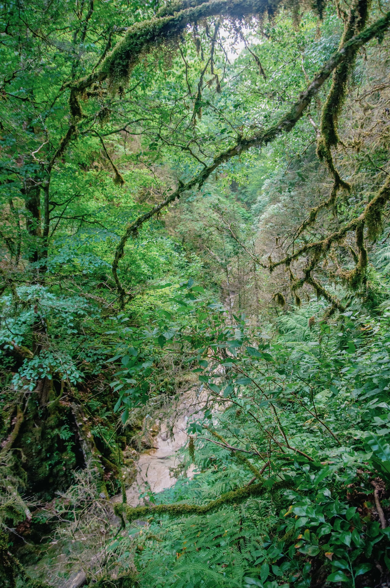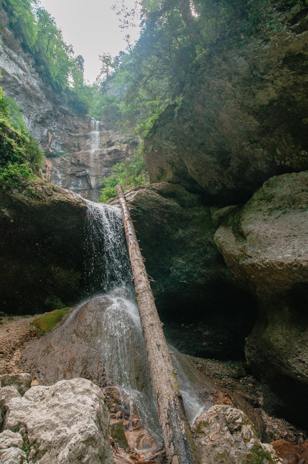 Склоны ущелья принимают отрицательный уклон, мощные карнизы почти смыкаются над головой, редкий куст удерживается на таких неприступных скалах. Просвет неба горит где-то в десятках метров в вышине, солнечный свет не доходит до дна, тут практически вечные сумерки. Чувствуешь себя песчинкой.