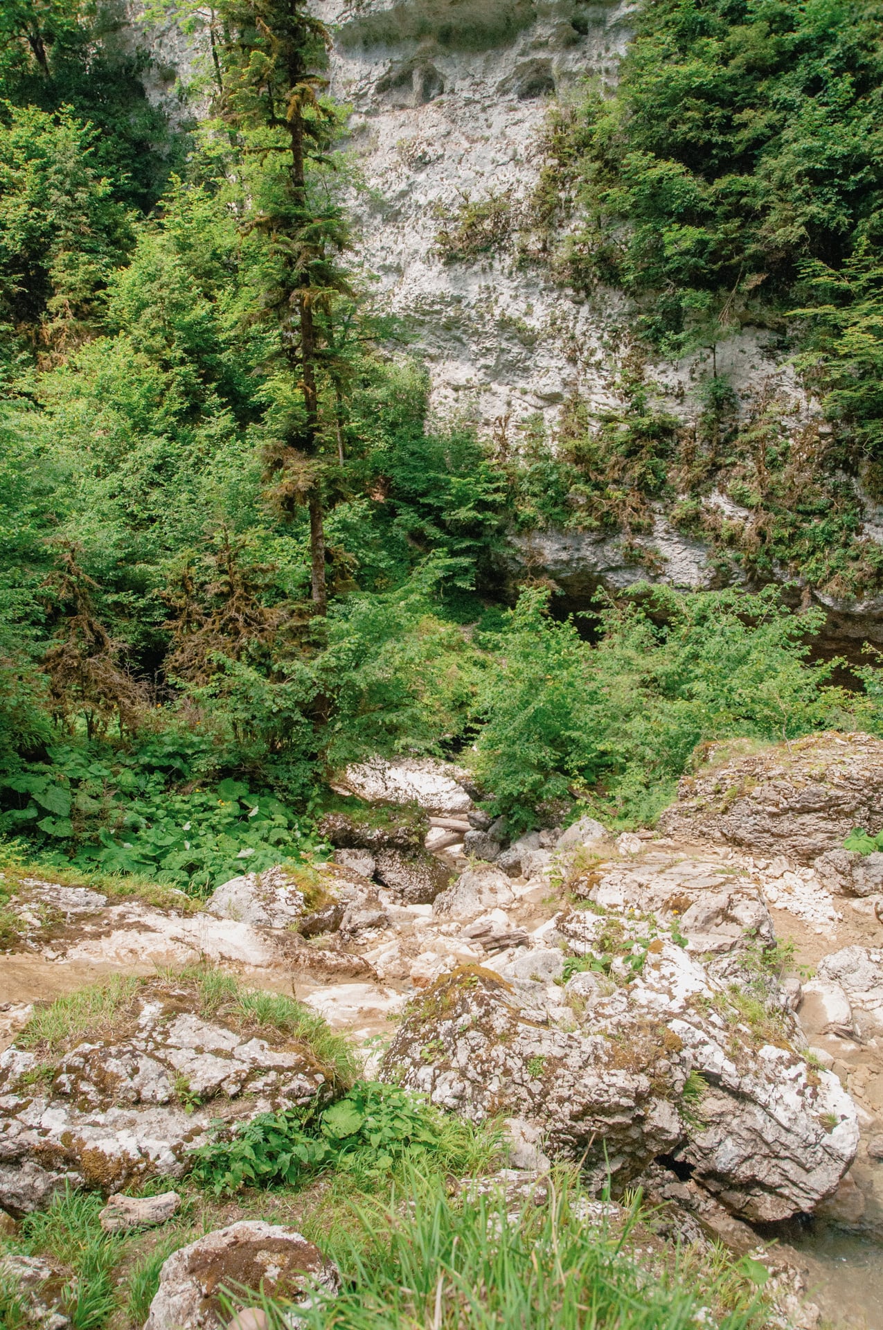 Сложные пороги остались за спиной и мы полезли вниз. На крутом склоне снова помогали деревья: самшиты, поросль бука и граба. У самого подножия вовсе пришлось катиться на пятой точке.