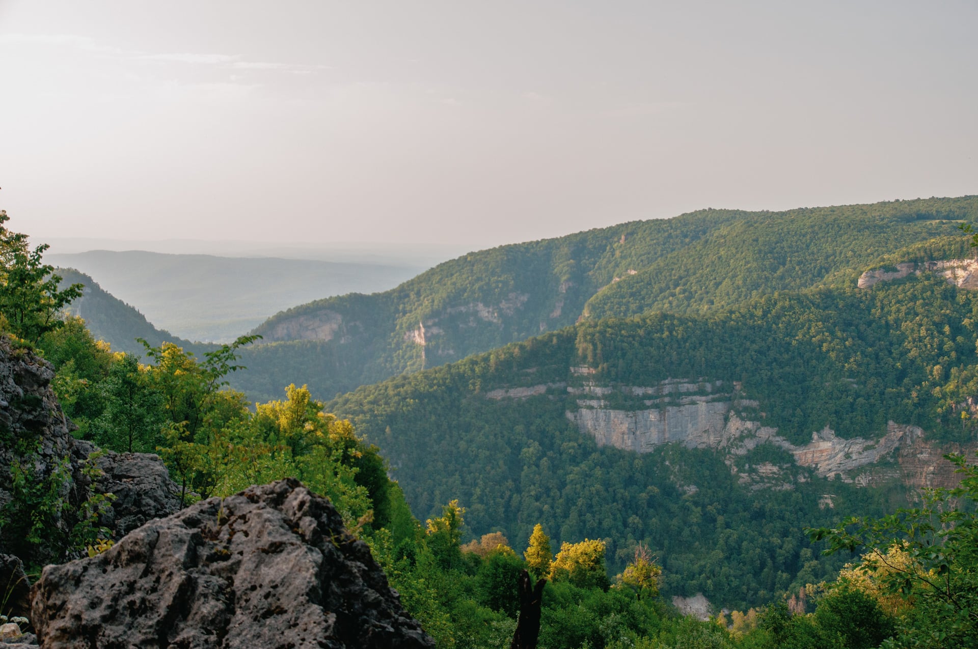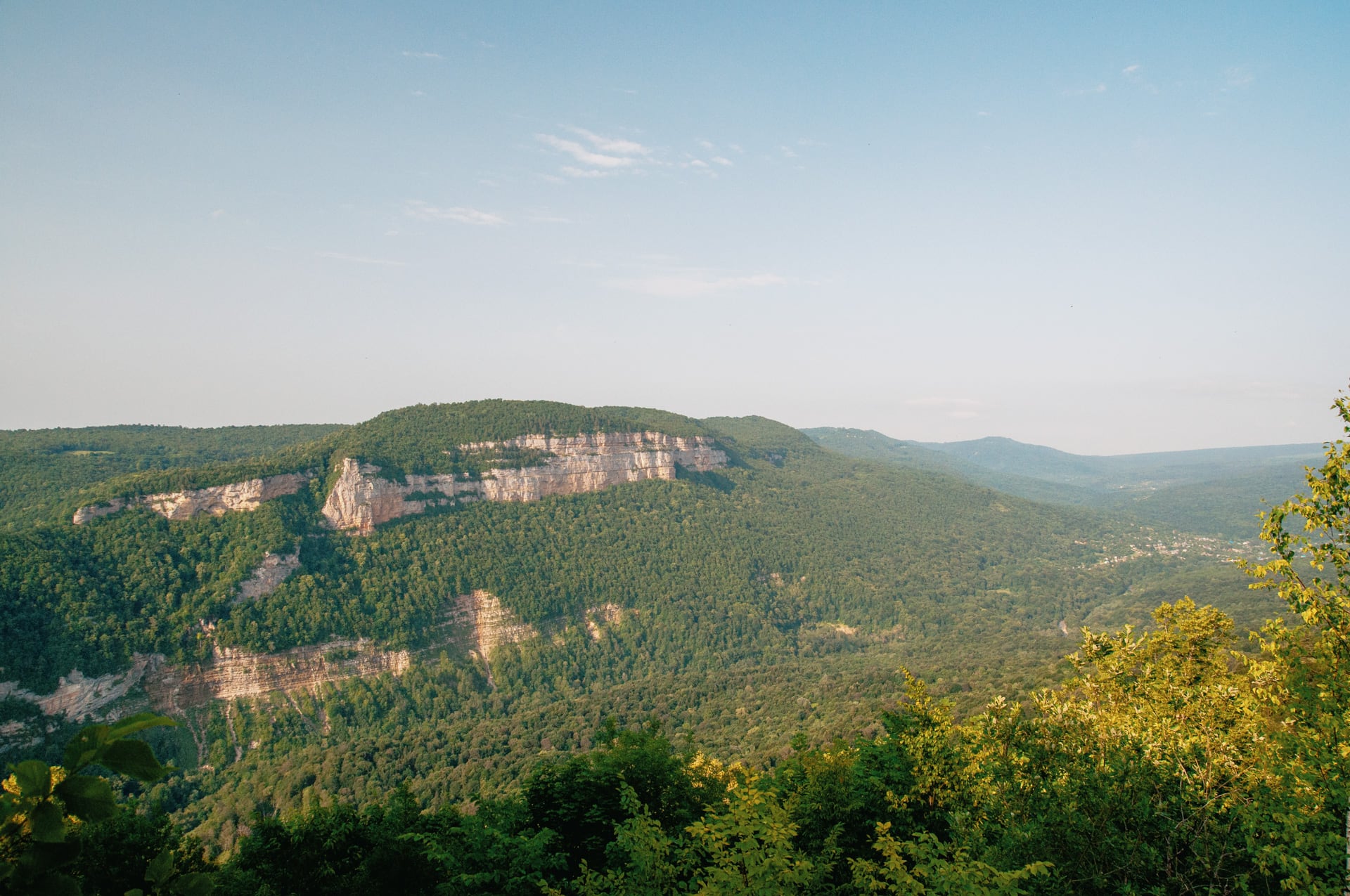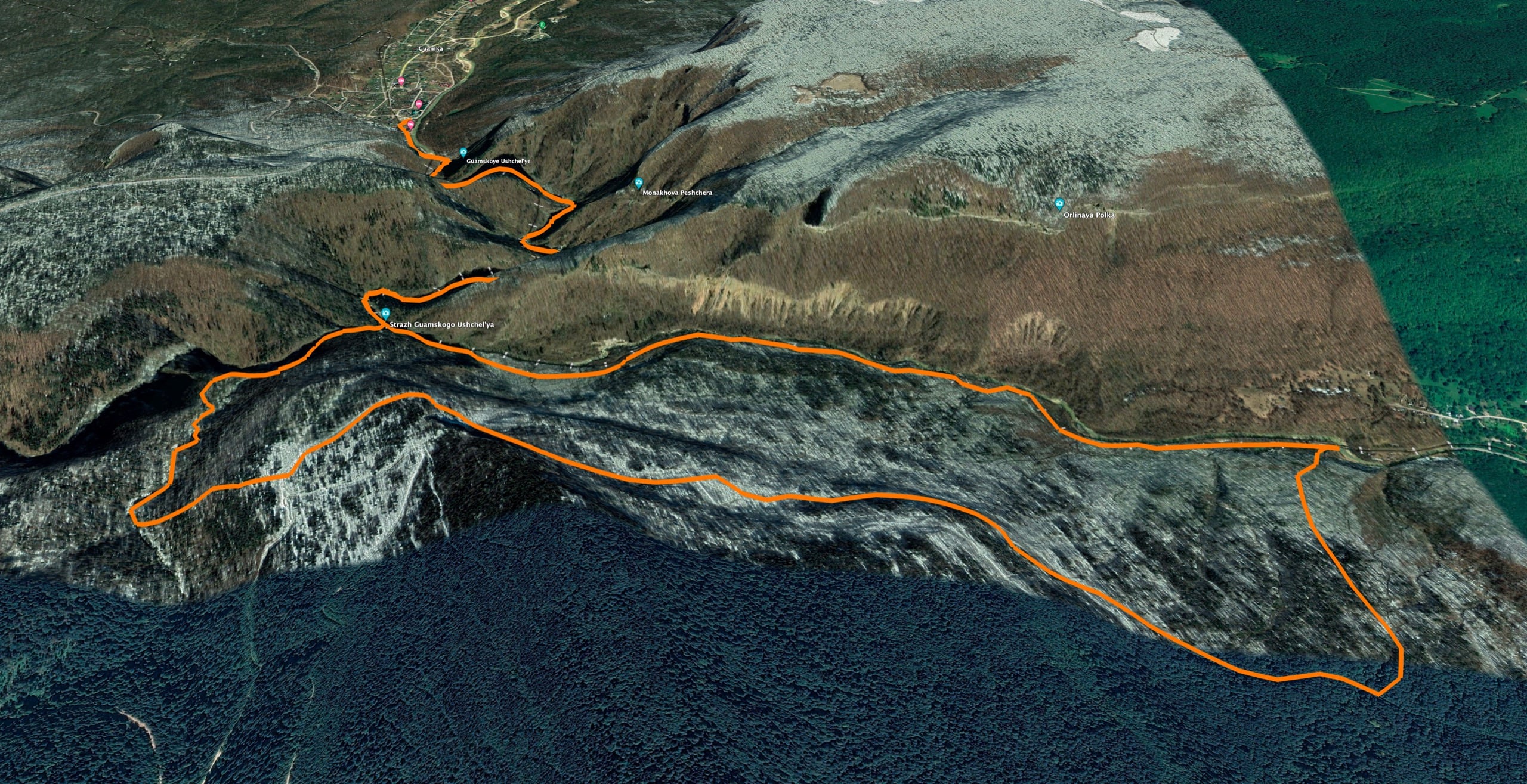 Перед нами расстелилась Мезмайская долина. Справа вдали стоит посёлок, в разрывах леса блестит непокорная Курджипс. Орлиная полка и скала Ленина расположились напротив, в дымке и лучах закатного солнца — это всё хребет Гуама. Слева в мутной пелене затерялся разрез Гуамского ущелья. Место, на котором мы стали, называется Мезмай-камень.