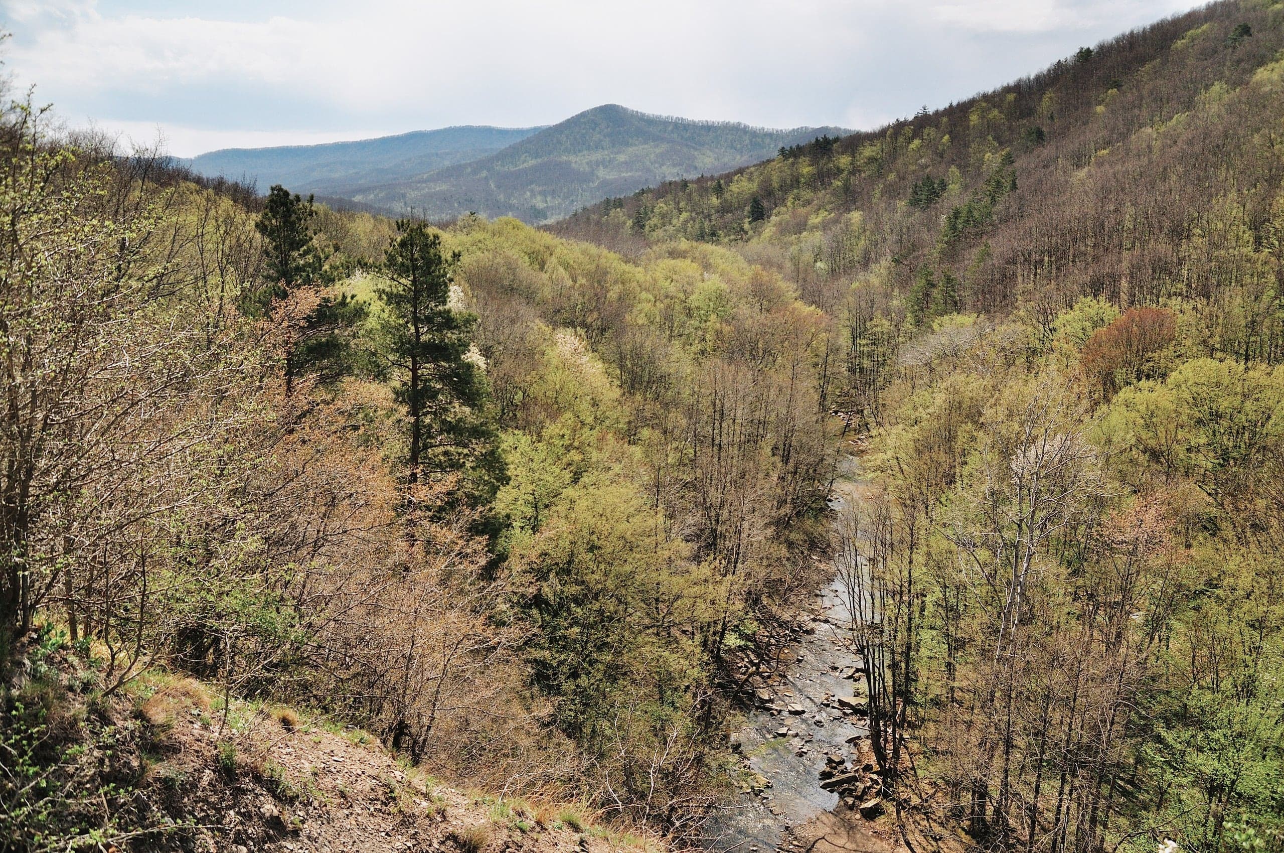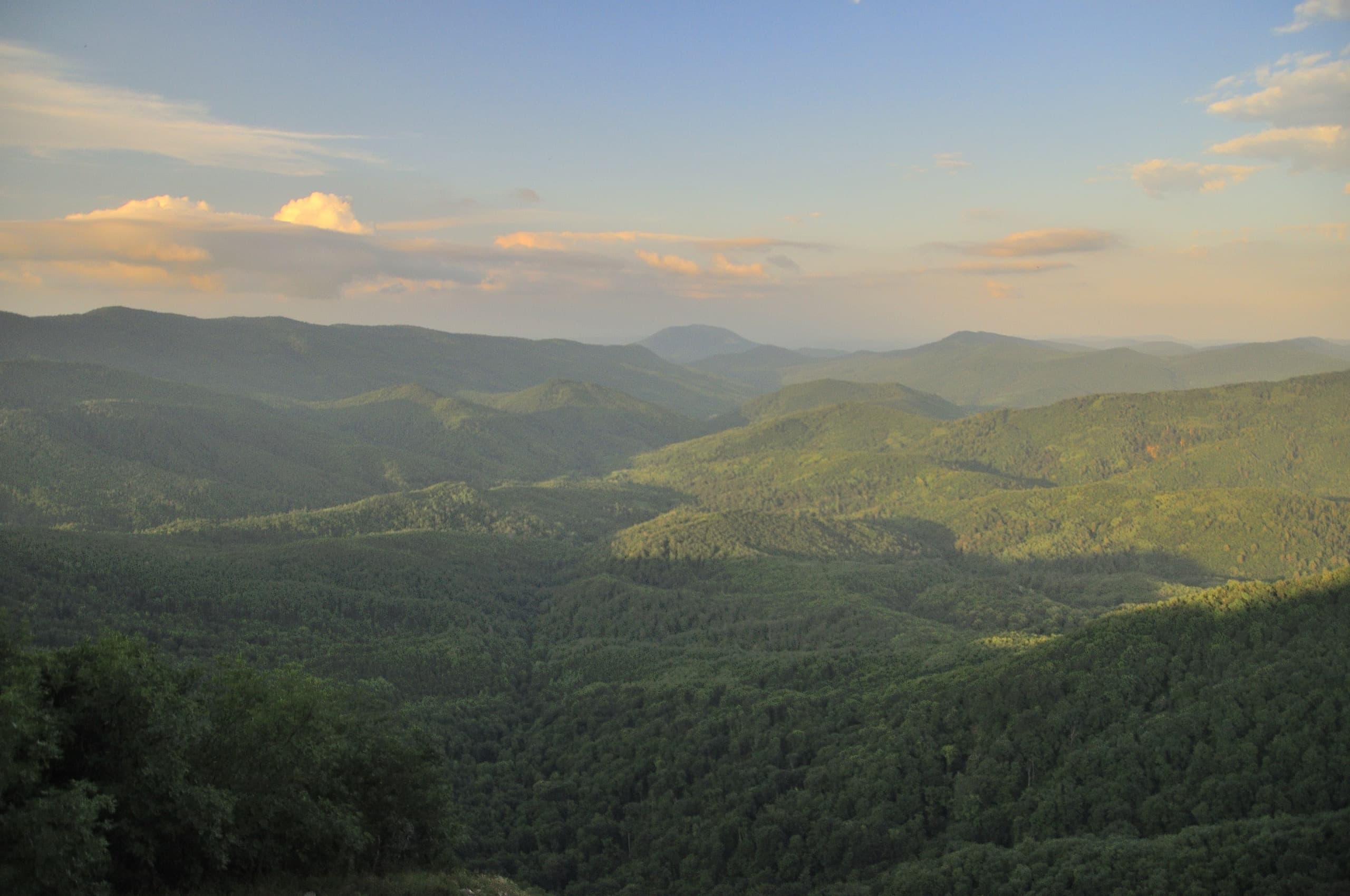 Лес, дорога, лес, дорога, лес дорога, «Нива» пролетела, подняла облако пыли, и снова — лес, дорога, лес, дорога... На полпути к Дубраве открылся симпатичный вид. Дорога забирает выше, склон обрывается, лес разрывается и получается милая обзорная площадка, с которой видно долину Убина, гору Шишан, высотой в 554 метра и Мачмалов хребет. Помнится, в апреле мы выбирались в это место поматрасить в первые тёплые весенние дни, когда лес только начал примерять зелёное платье. Тот вид был интереснее: сквозь голые кроны проглядывалось русло Убина, коричневые камни и земля играли со свежей зеленью и всё это заправляло сочное синее небо. А в июле тоже красиво, но не так — сверху тусклая синева, снизу зелень и дневной летний свет делает всё плоским.