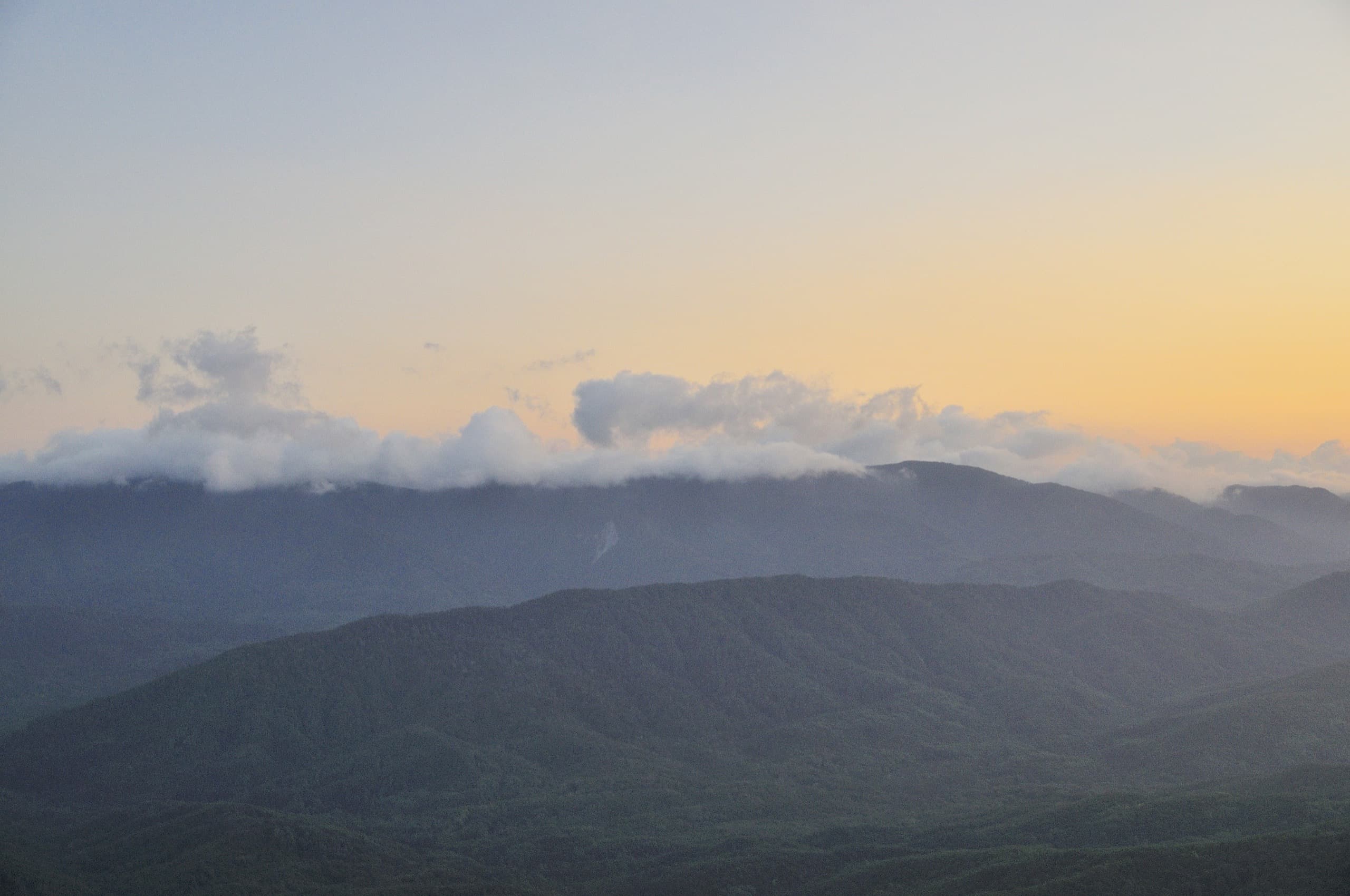 И погода благоволила. От дневной мороси не осталось следа, над головой висело чистое небо и мягкий вечерний свет устилал золотом хребты и долины. Только на северо-западе за хребтом Коцехур клубились облака. Из лёгкой дымки они начали превращаться в тяжёлые свинцово-серые тучи. Облачный фронт рос, силился броситься на нас, но ничего у него не вышло. Мы своими глазами наблюдали как горы влияют на погоду. За главным водоразделом, на берегу моря бушевала непогода, но хребет не дал ей пройти в нашу сторону.