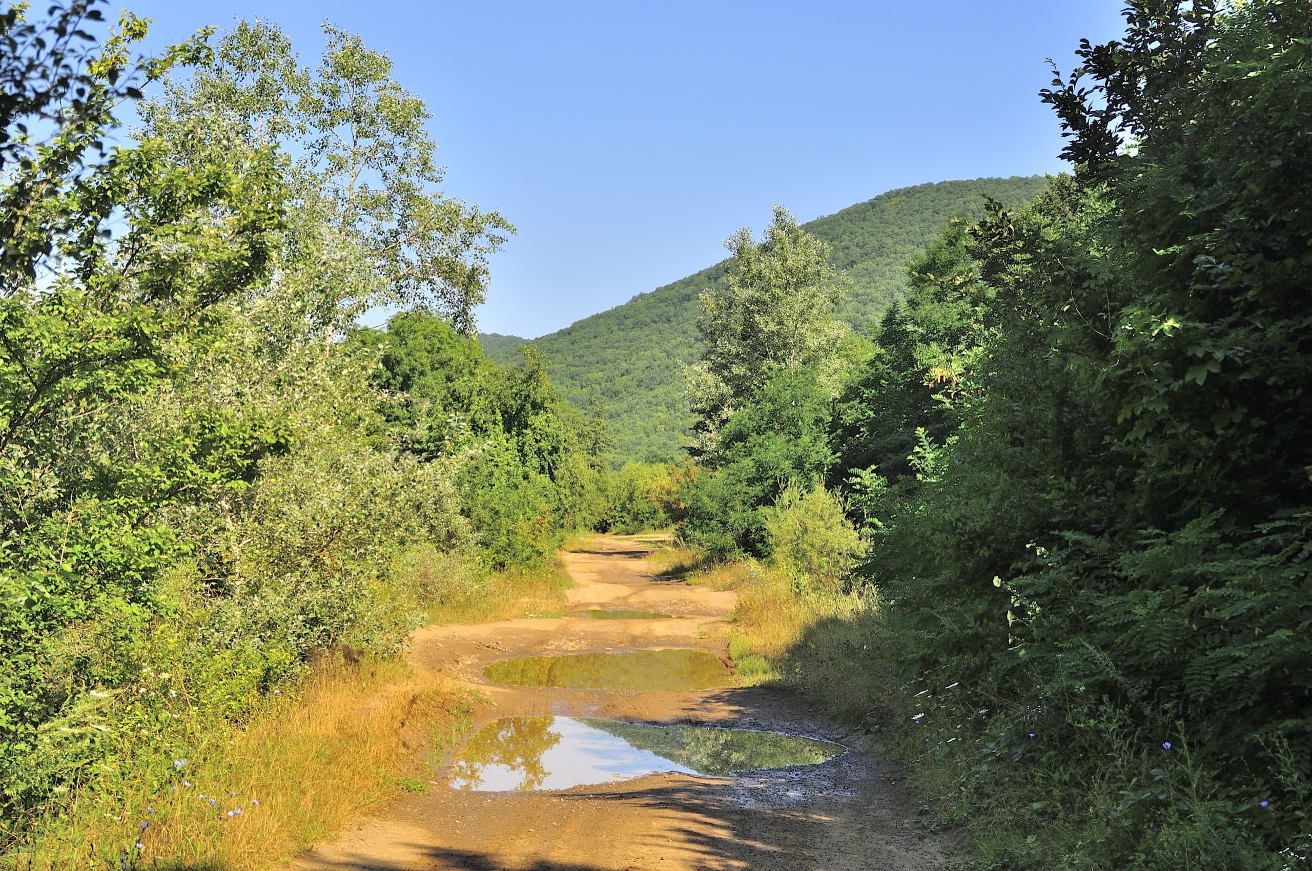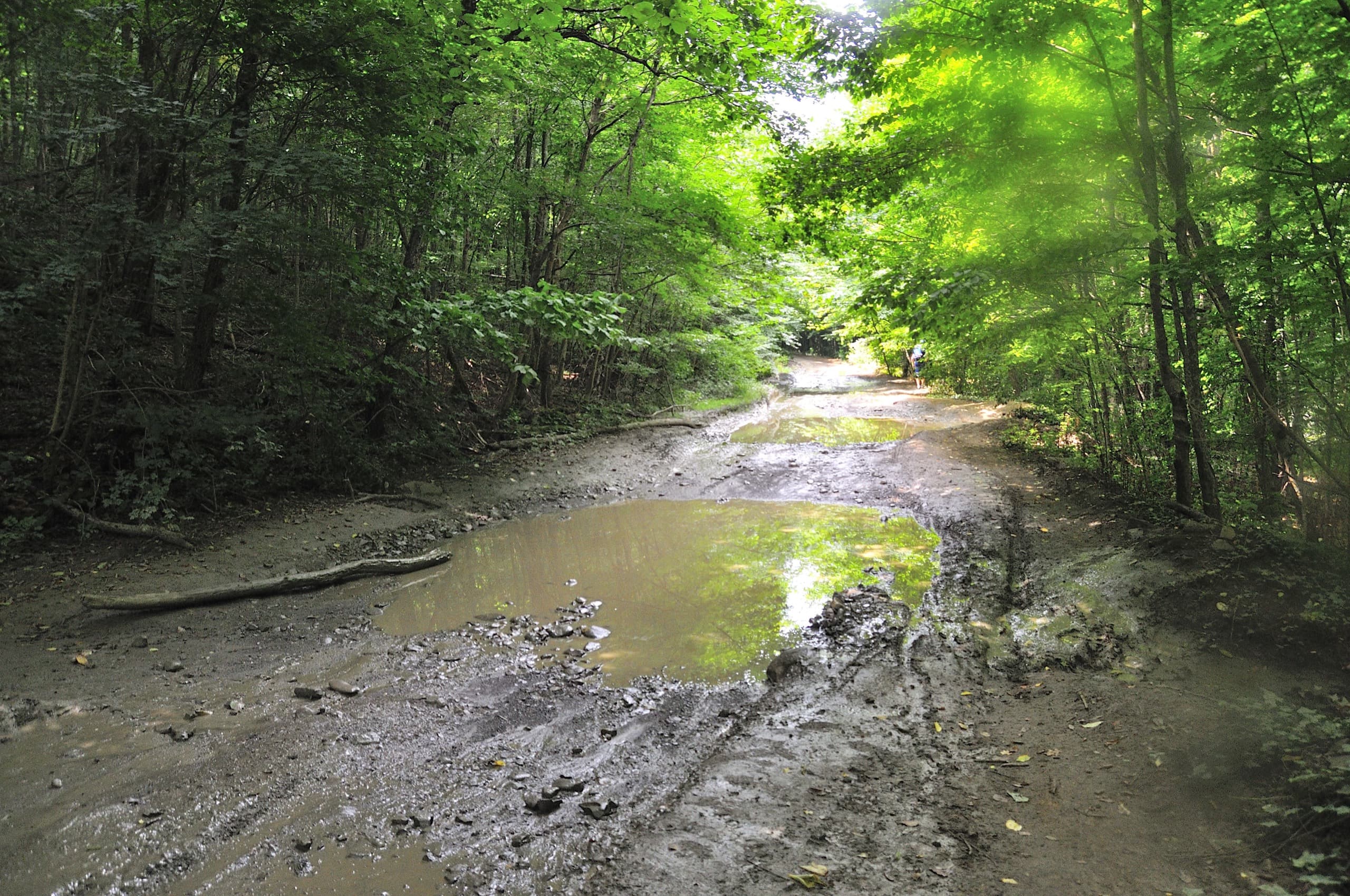 Этот участок ничем не примечателен — обычная походная работа, которую нужно выполнить ради красот. Лес, грязная дорога, лес, грязь, лес, грязь. На спуске дорога более-менее сносная, но стоило нам выйти к реке и началась полная задница. Дорога из Нового настолько разбита, что некоторые участки выглядели как непроходимое болото. Добавим к этому сырость, лесной полумрак и тучи комаров — настоящая походная романтика!