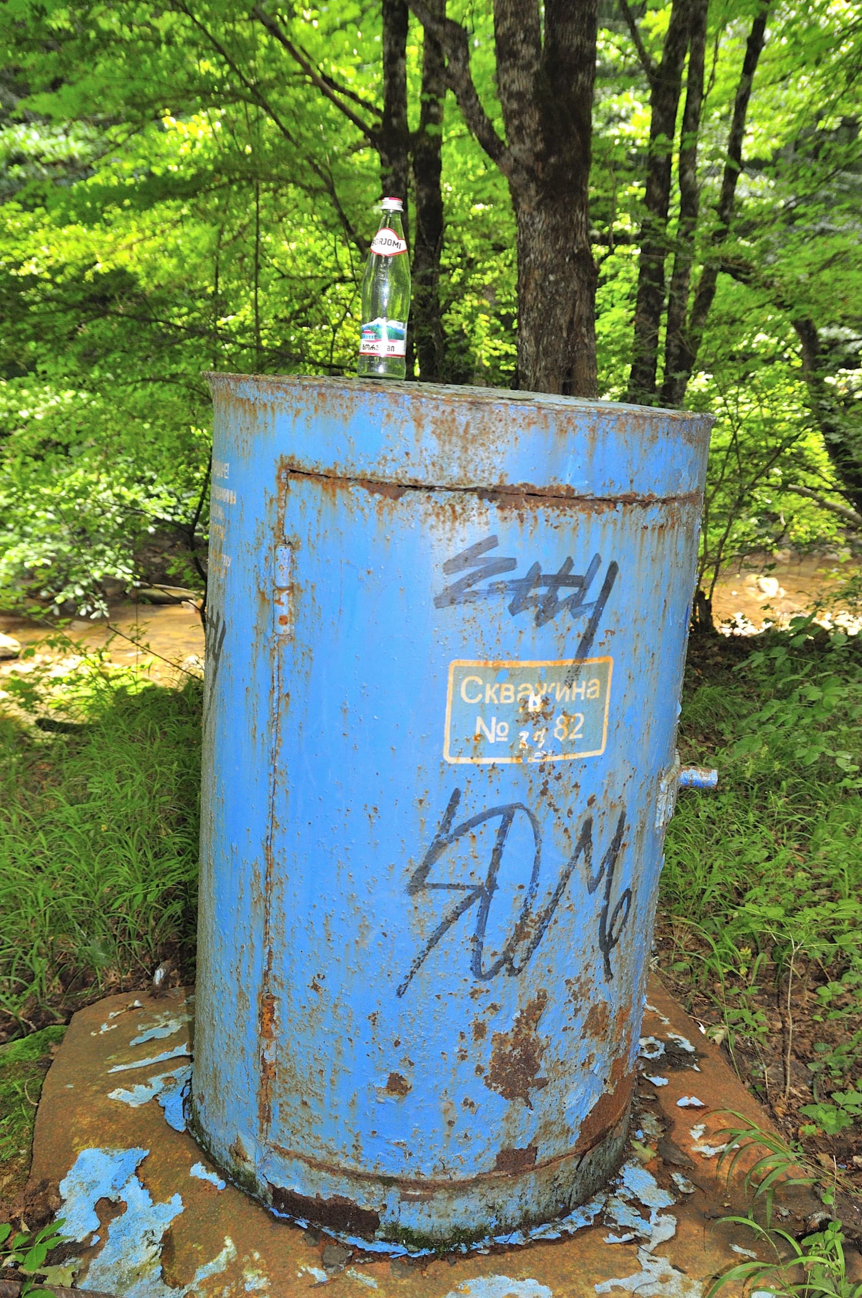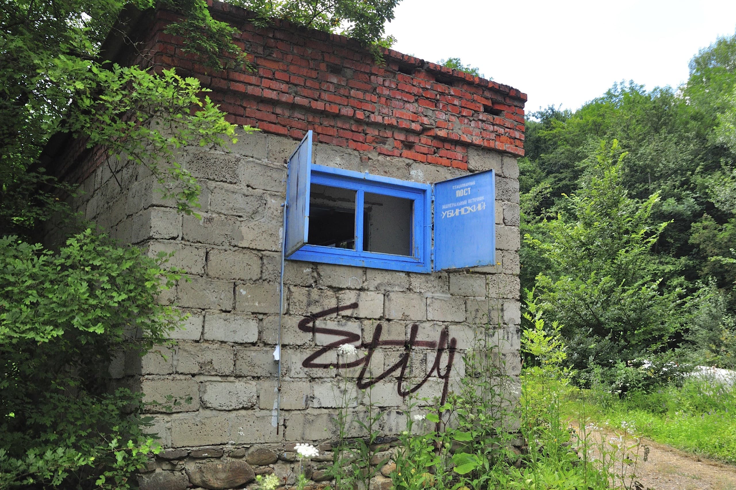 Перекусили, окунулись в речку и продолжили путь. В тридцати метрах за стоянкой остов скважины 82 намекает, что минералка в здешних краях не просто так течёт, а её раньше пытались качать. Около километра и на нашем пути возникает новое «минеральное» препятствие — Запорожский источник. Мимо пройти не получится, на дороге стоит приметное заброшенное здание с надписью «Стационарный пост. Минеральный источник Убинский» на внутренней стороне железной ставни. Источник в полусотне метров вправо по тропинке.