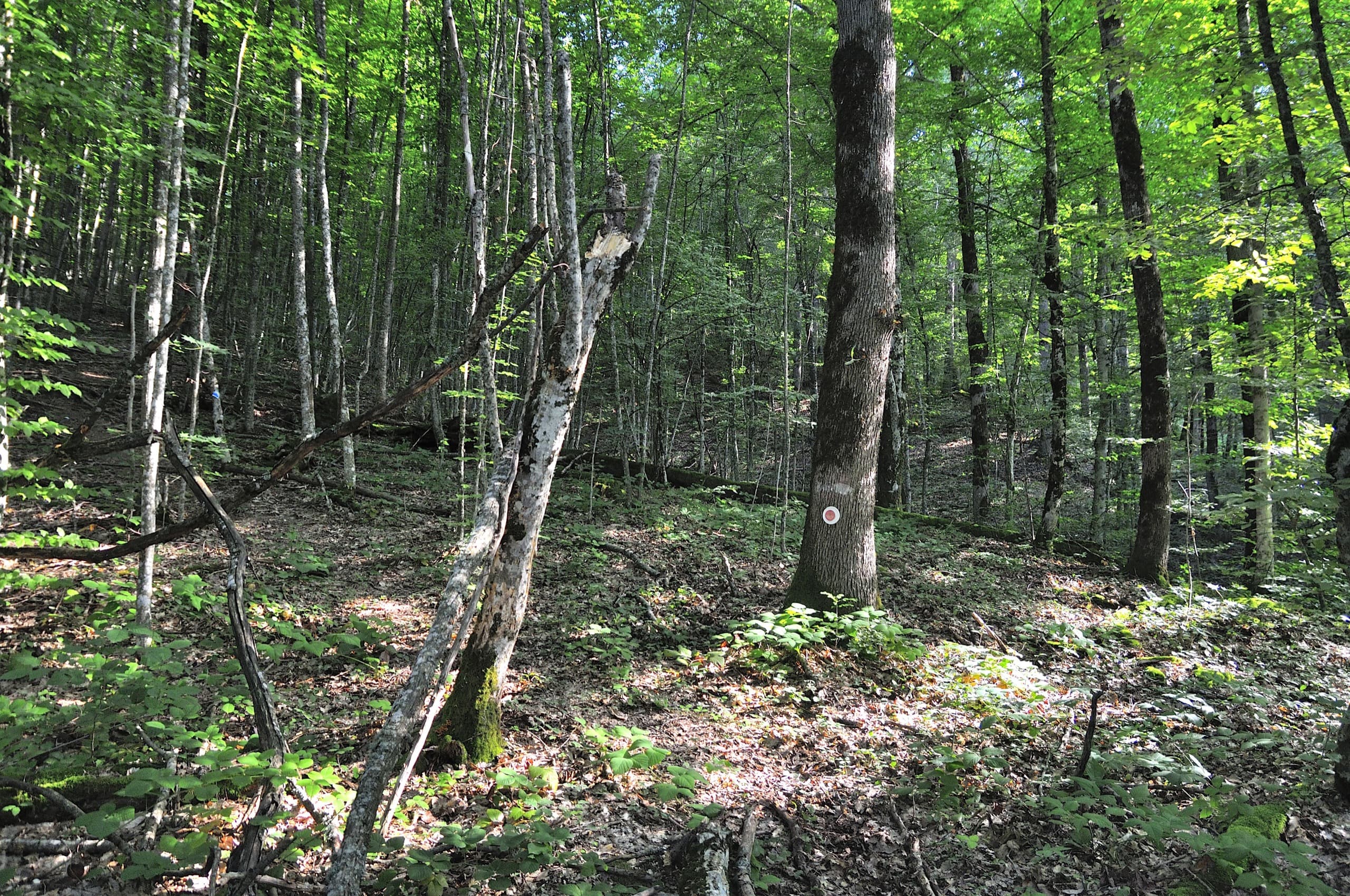 После того как покинули ручей, вышли на широкую, ясно читаемую тропу. Но, она быстро истончилась и начала теряться среди деревьев. Здорово выручали марки на деревьях, спасибо тем людям, которые не поленились и пометили маршрут.