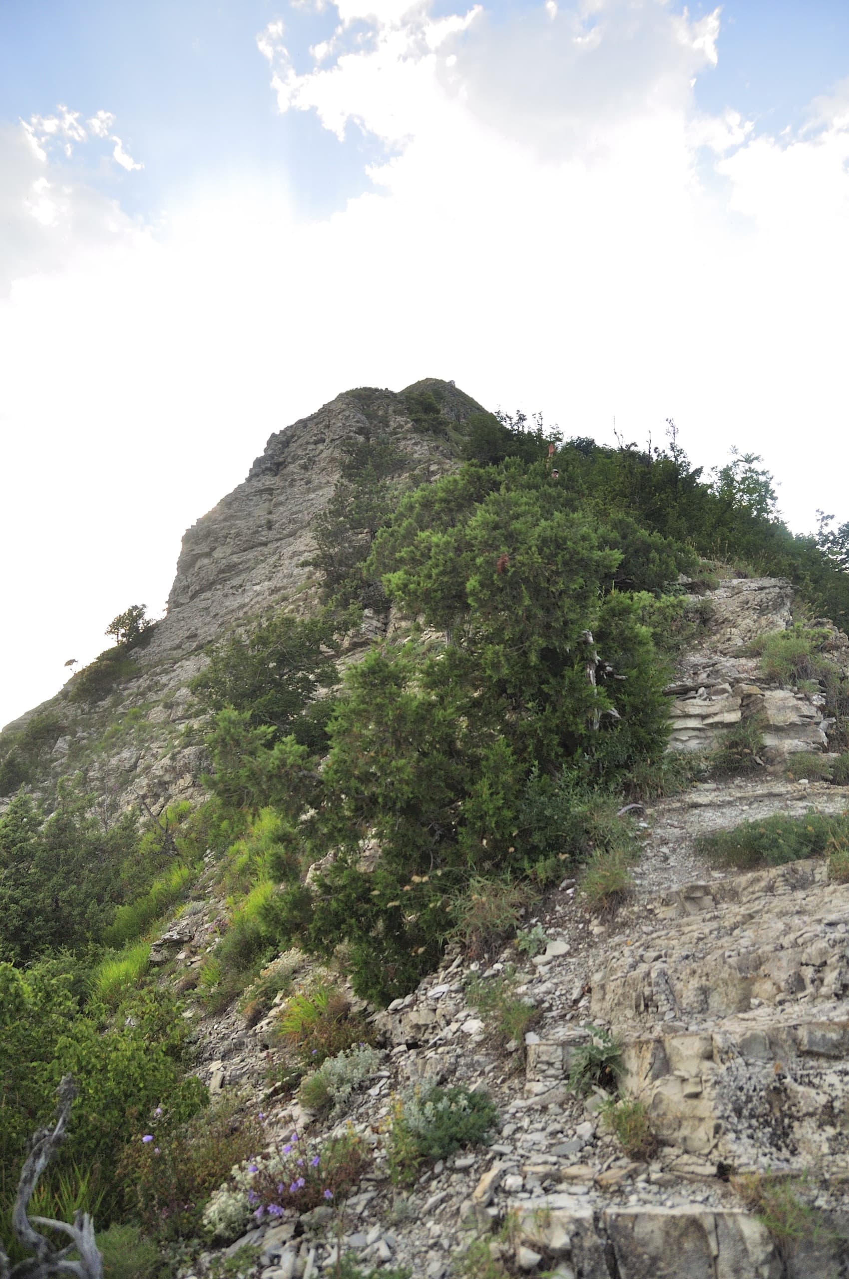 Забрались на небольшой скальный уступ и вернулись в густой лес. Здесь располагается отметка в 716 метров — Восточный Папай. Сквозь ветви начал проглядываться силуэт главной вершины. Я прозвал это место Папайской ступенью — после крутого подъёма ровный, удобный участок, за которым новый подъём, а за ним вершина.