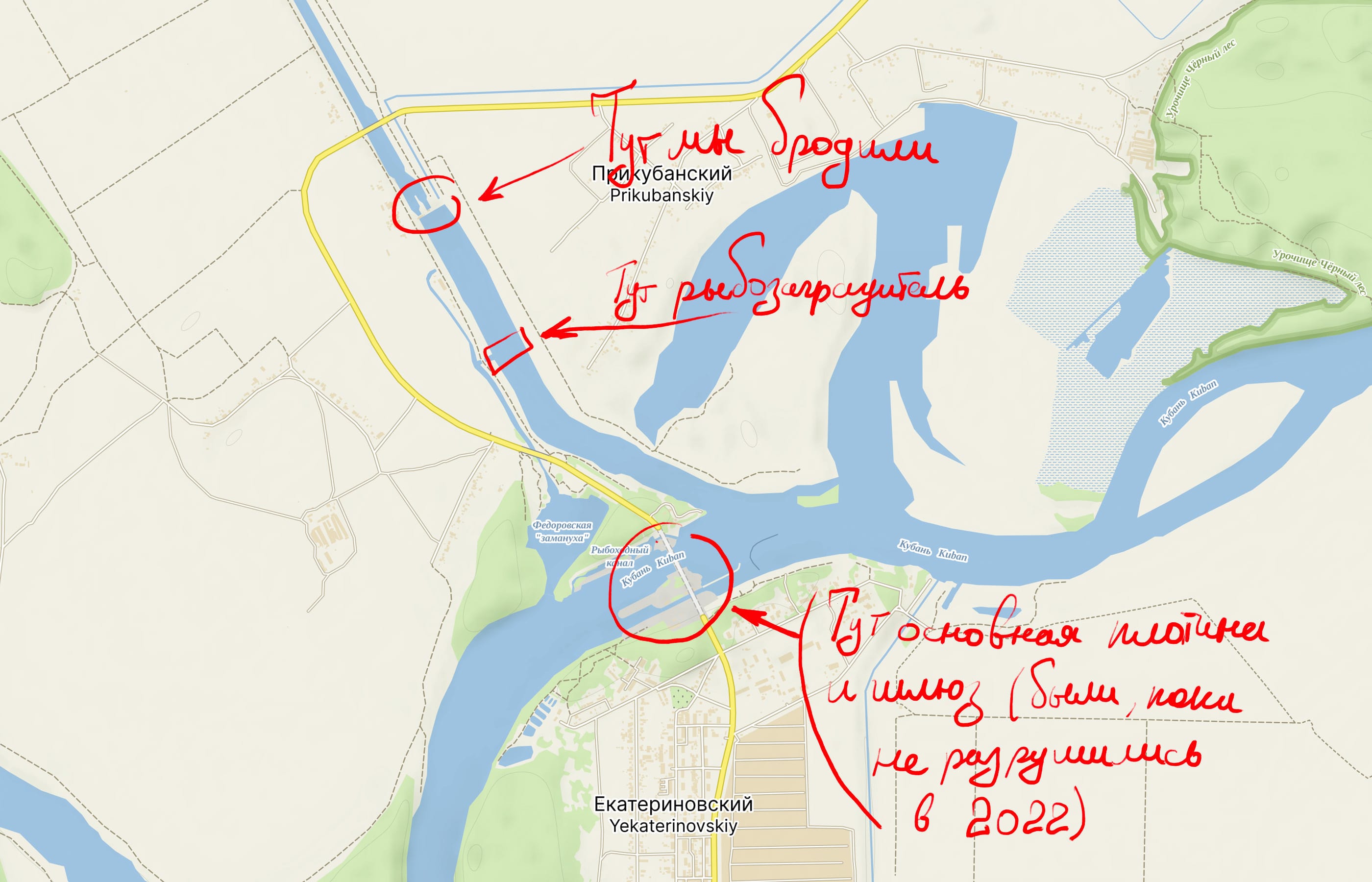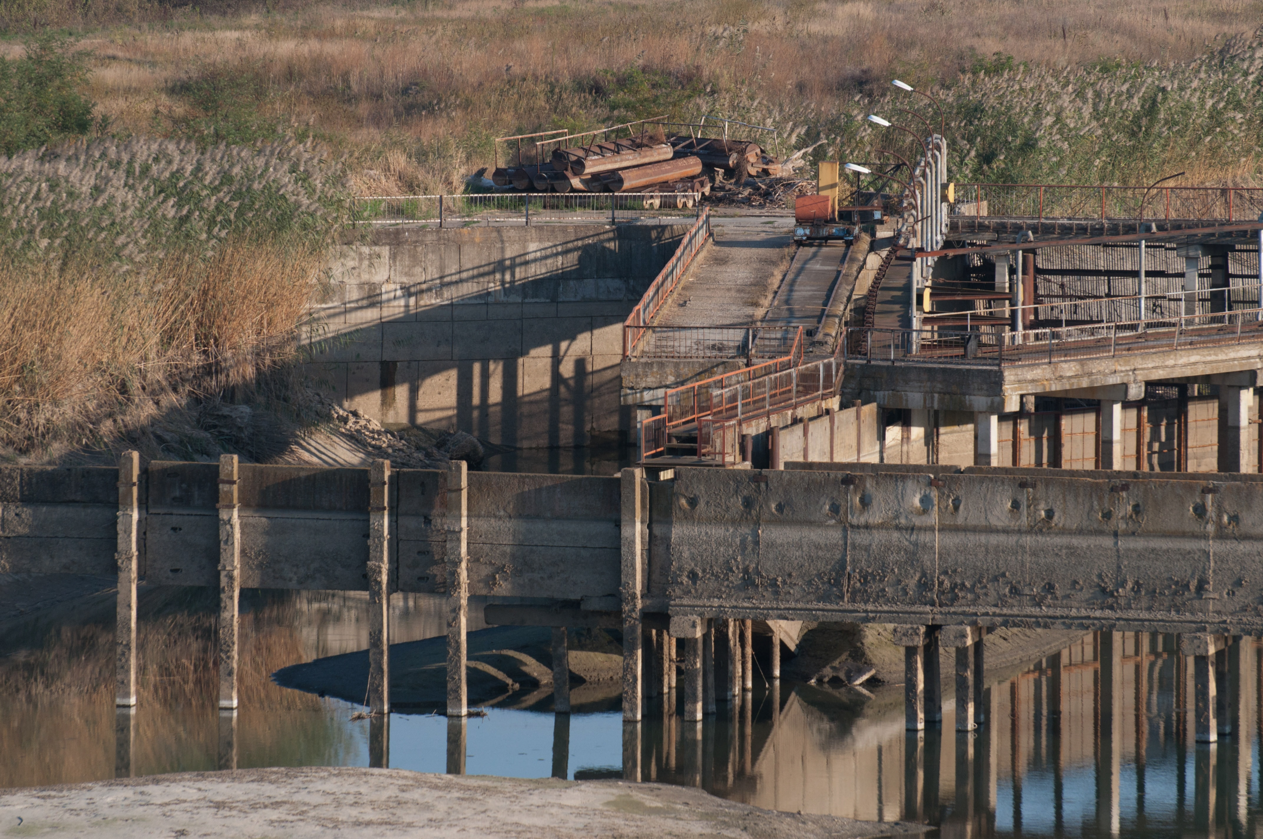 Основная плотина с судоходным шлюзом располагается на русле Кубани у хутора Екатерининский. Туда мы в этот раз не заезжали, а ограничились осмотром заброшенных зданий у хутора Прикубанский, нависших над руслом магистрального канала.