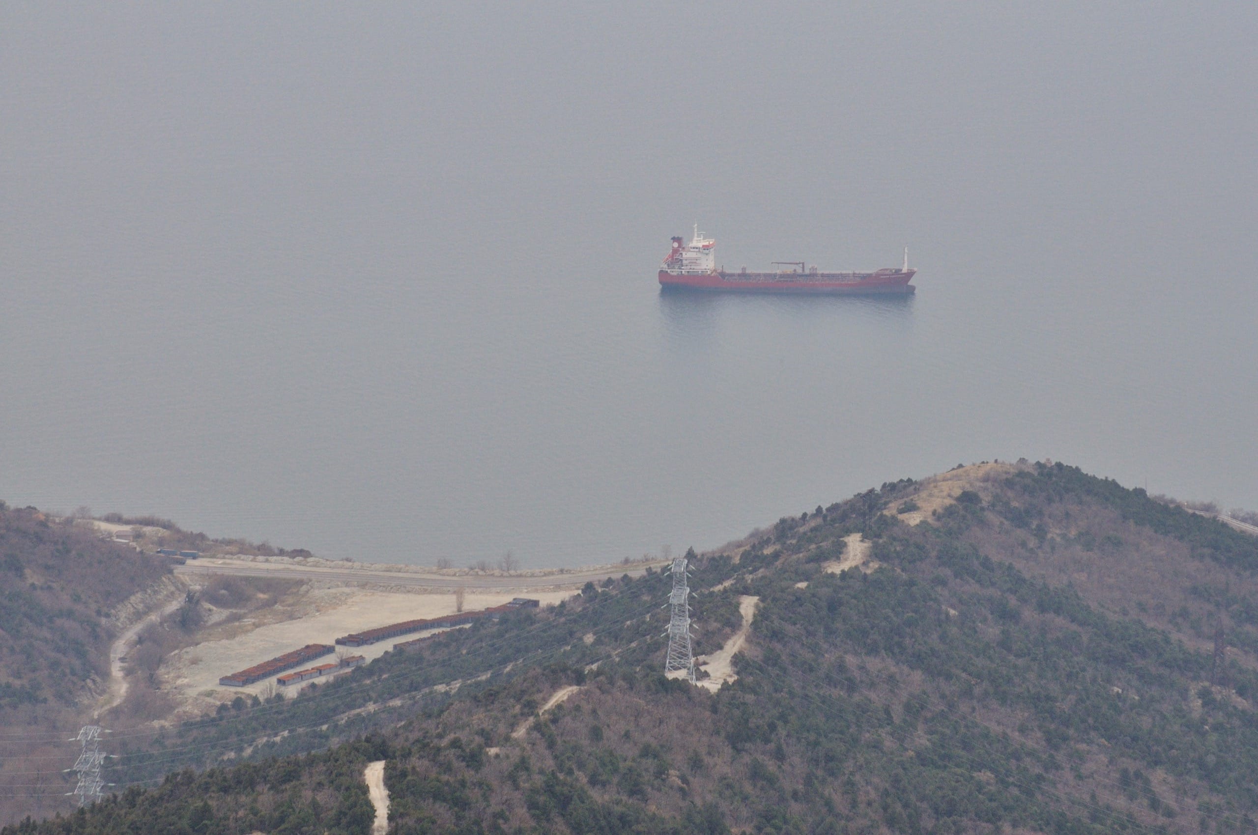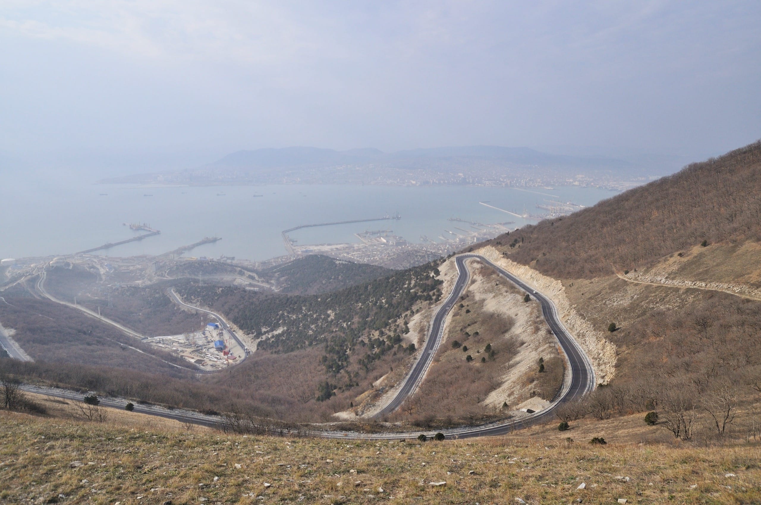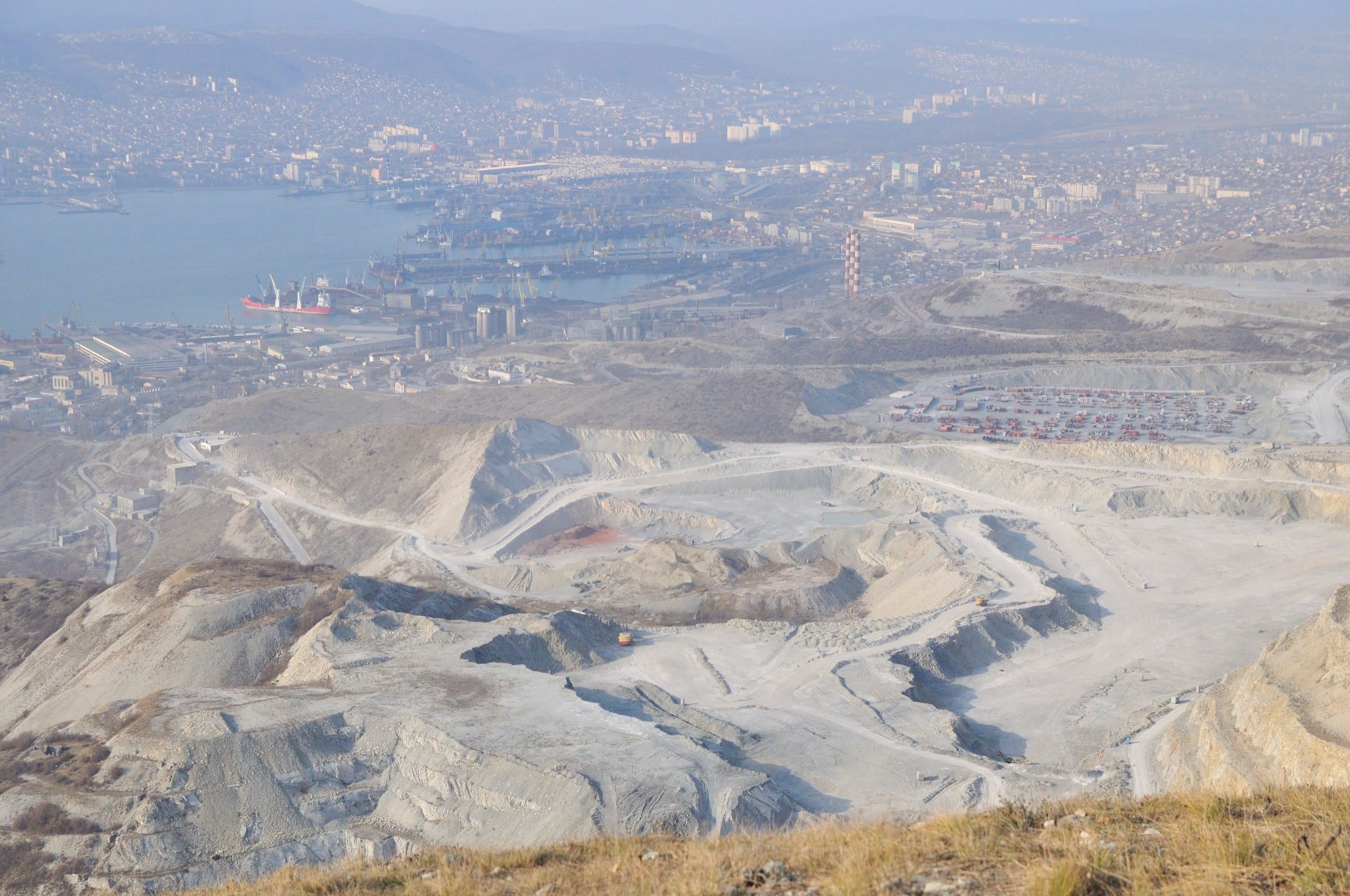 Карьеры будто чуждая жизни мёртвая планета, населённая бескровными механизмами. Как букашки, бегают машины по пепельной пустыне и грызут её, грызут, грызут. За карьерами территория порта: от военной базы слева до обширных грузовых терминалов справа. У причалов и на рейде многочисленные корабли: от мелких буксиров до огромных танкеров. Основная же часть города на другой стороне бухты, стоит прикрытая лёгкой сизой дымкой. Должно быть невероятно красиво посмотреть этот же вид ночью, когда город вспыхнет огнями.