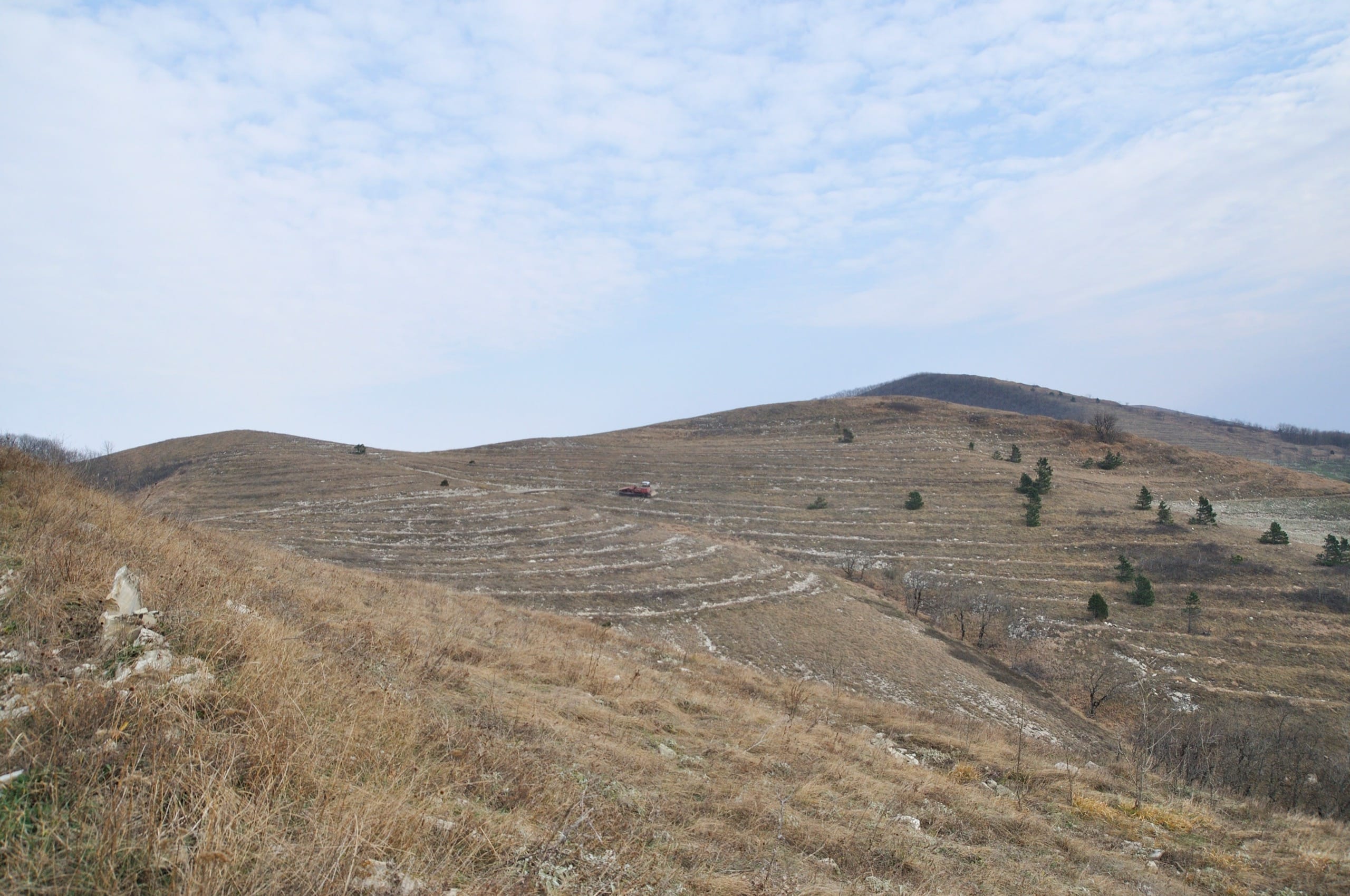 За 639-й высотой, когда мы вышли из очередной полосочки леса перед нами предстал склон, нарезанный аккуратными кругами, почти такие же полосы, о которых я писал чуть выше, только меньше размерами. Что это? Естественность таких аккуратных образований отмели сразу. У меня возникло предположение, что это следы некогда бывших на этих склонах виноградников, однако истина оказалась куда интереснее.