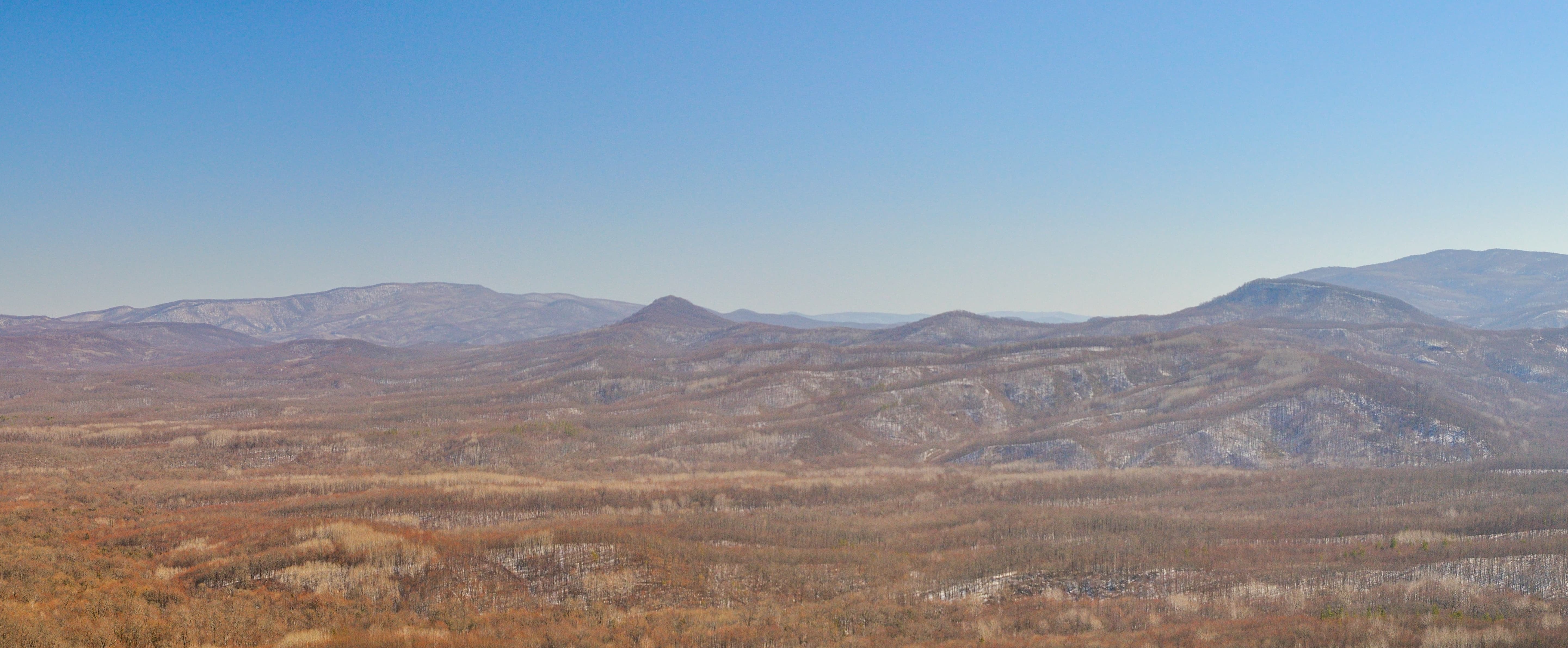 Фото 14. Фрагмент вида с Жёлтых монастырей. Слева направо: гора Хребтовая (649 м), высота 432 м, высота 347 м, высота 557 м, гора Щётка (776 м).