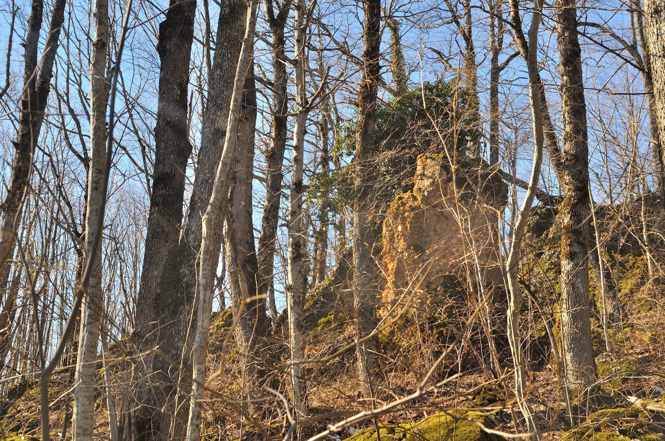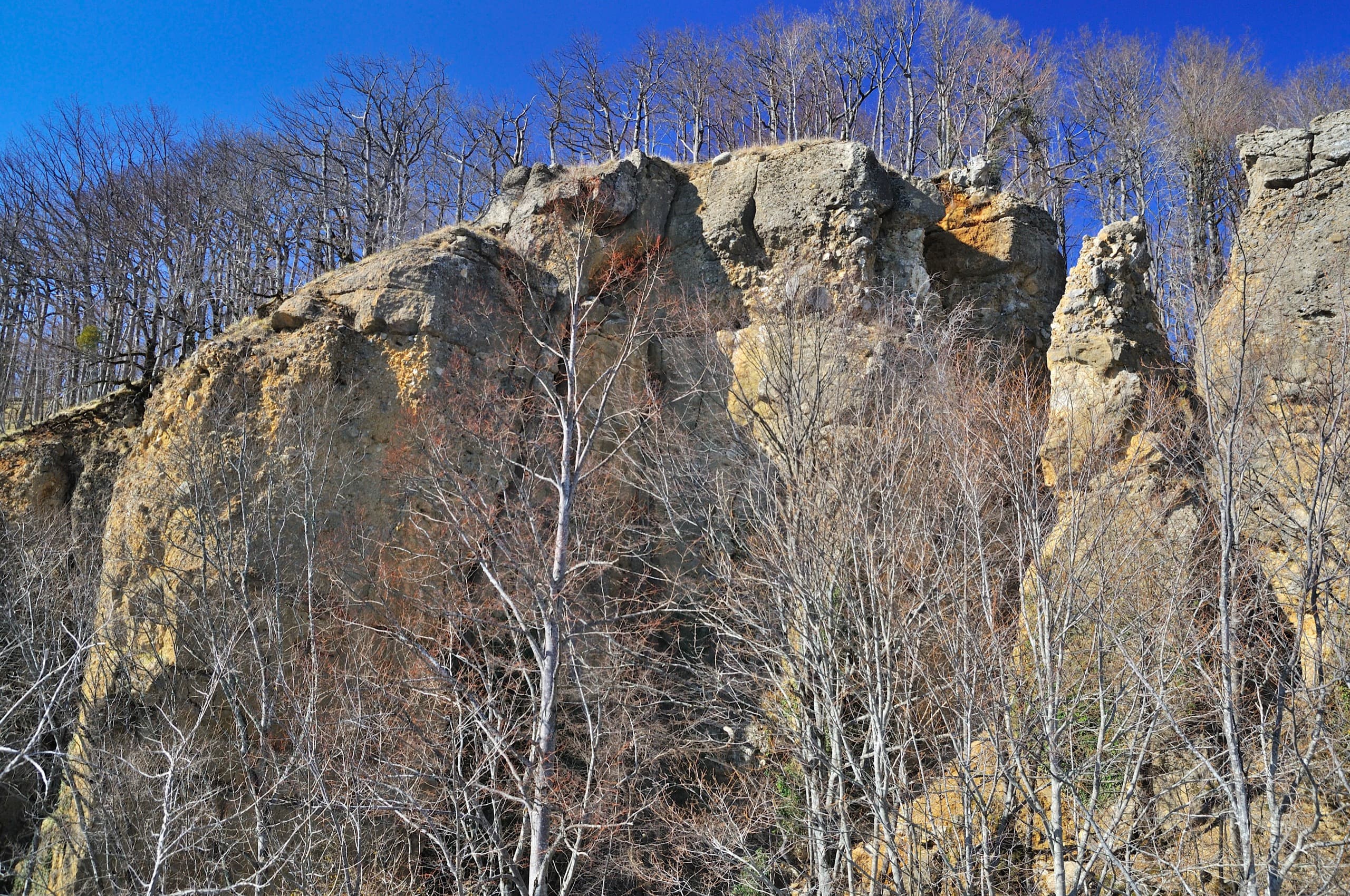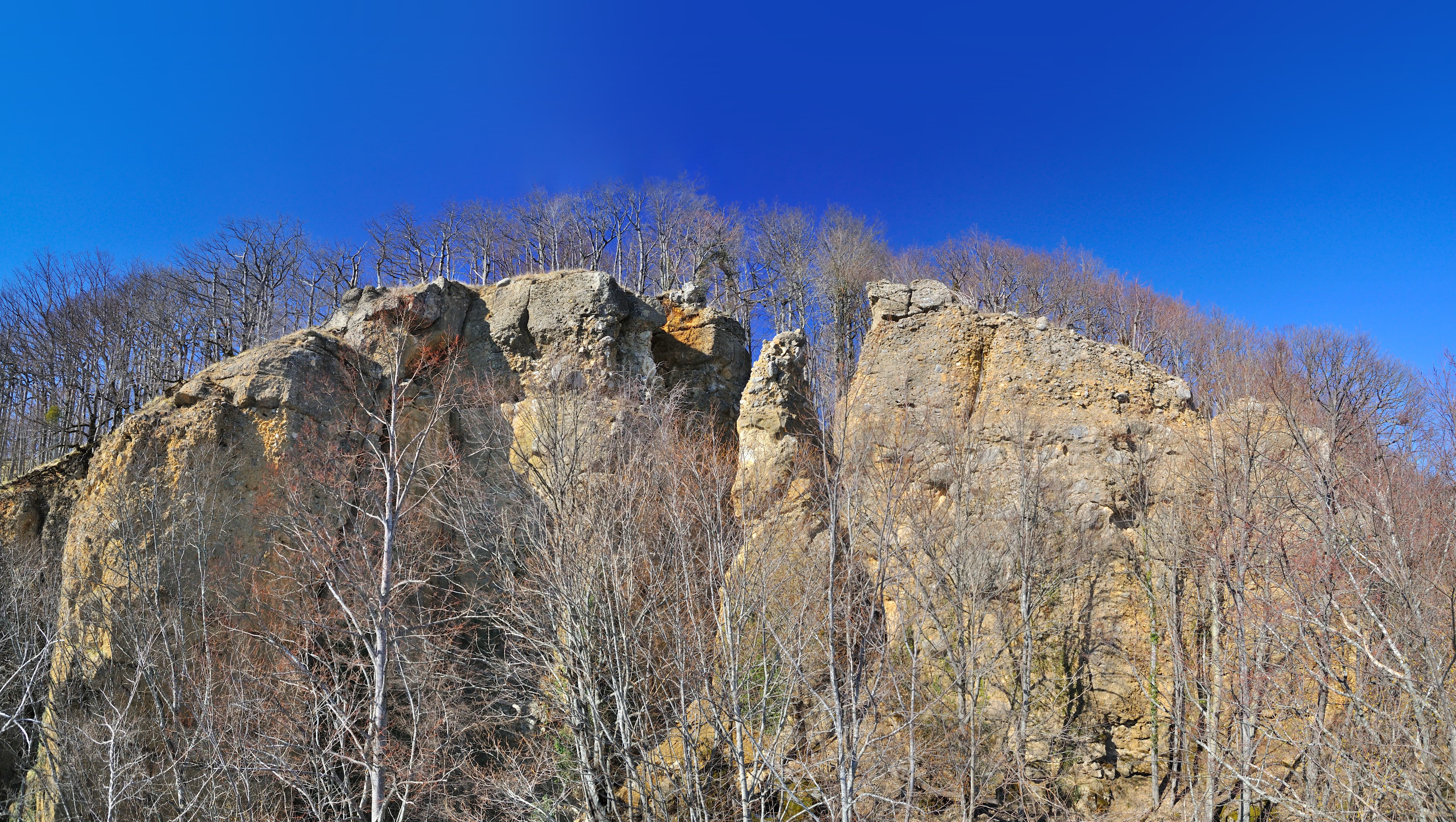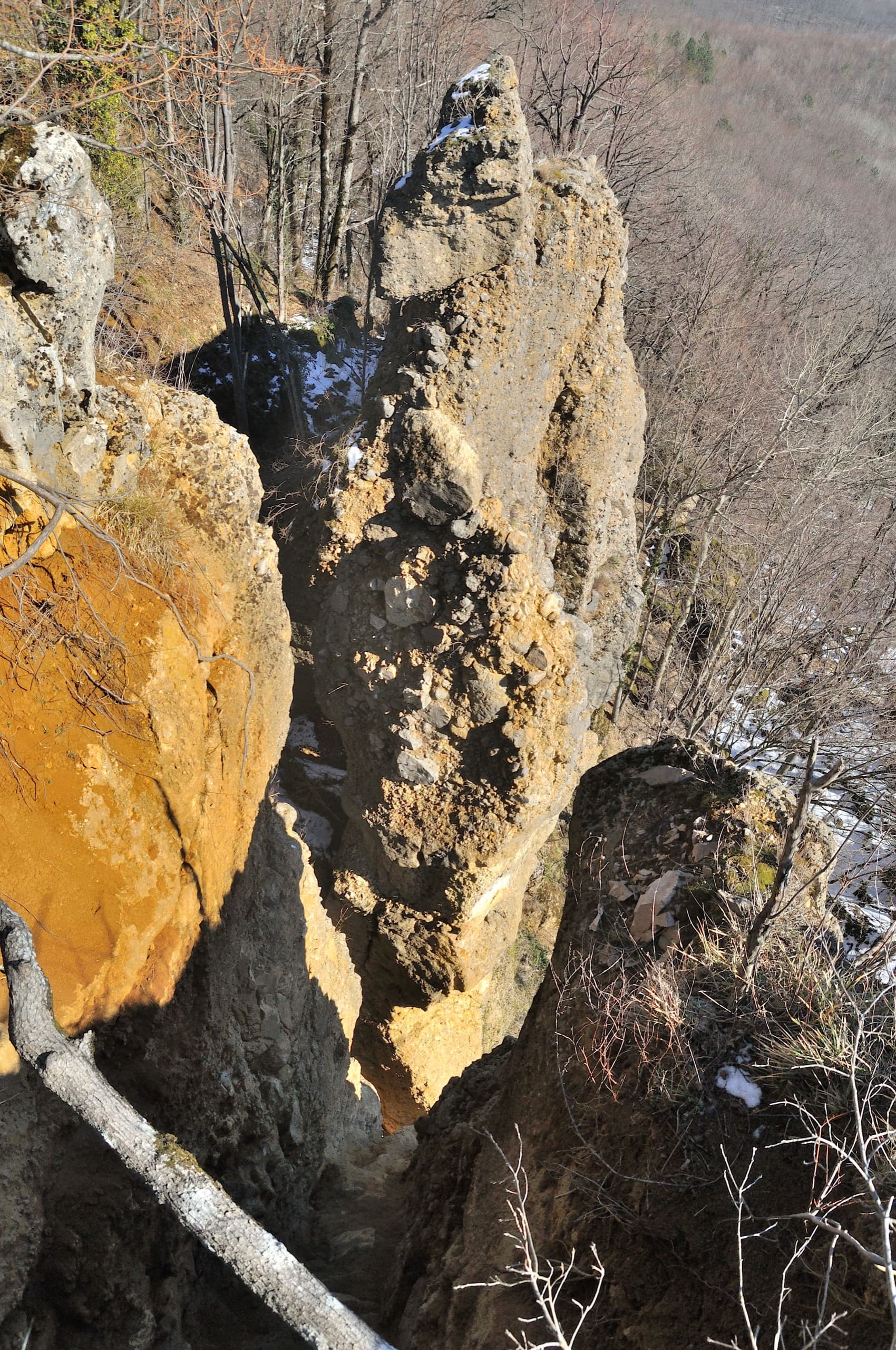 Наслаждаемся видом, обедаем. Пока мы едим, снизу подходит ещё группа в четыре туриста. Они как раз не стали сразу подниматься и сперва осмотрели скалы снизу. А мы, закончив трапезничать, собираемся и делаем наоборот, после видов панорамных идём смотреть на скалы снизу, для чего спускаемся по крутой тропинке и вскоре оказываемся у подножия. Зимой осматривать скалы хорошо. Большая их часть прикрыта деревьями и летом будет плохо видна из-за зелёных крон, а сейчас, пока нет листвы, можно полюбоваться Монастырями во всём их величии.