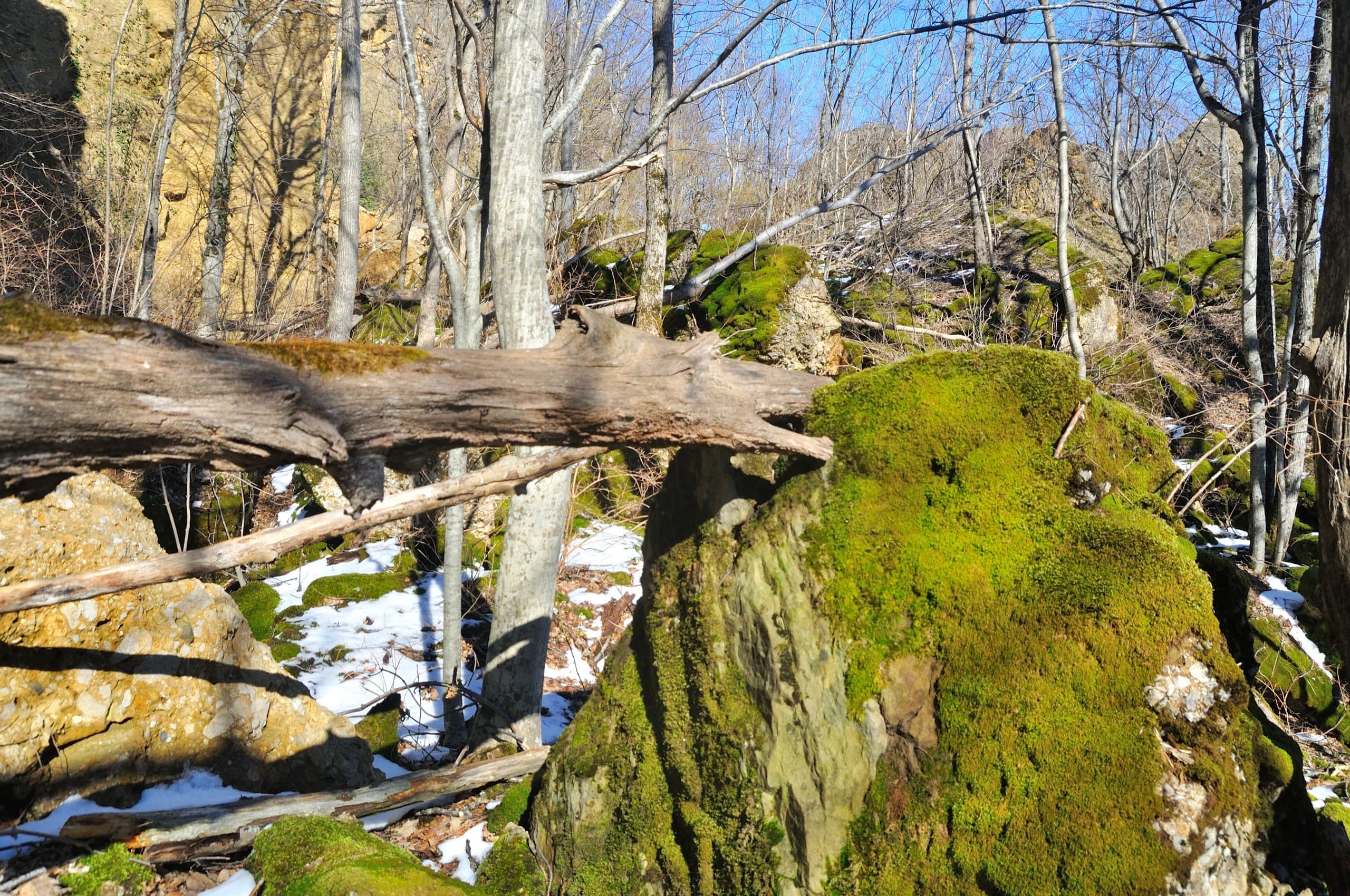 Любуемся, снимаем и отправляемся дальше. Обычно со скал возвращаются тем же маршрутом, однако, я не люблю ходить одной и той же дорогой поэтому мы пошли кольцом. От скал, без тропы начали спуск в юго-западном направлении, спустились к ручью, от него снова пошли вверх и перебрались в соседнюю балку, от которой уже поднялись к лесной дороге. Путь по лесу оказался несложен. Лес чистый, веток мало, склоны балок местами крутоваты, но удобный обход находится быстро. Правда, Женя таки в одном месте прокатился на пятой точке по снежку, не удержавшись на спуске, благо всё обошлось без последствий, только посмеялись с сожалением, что никто не успел снять этот спуск на видео.