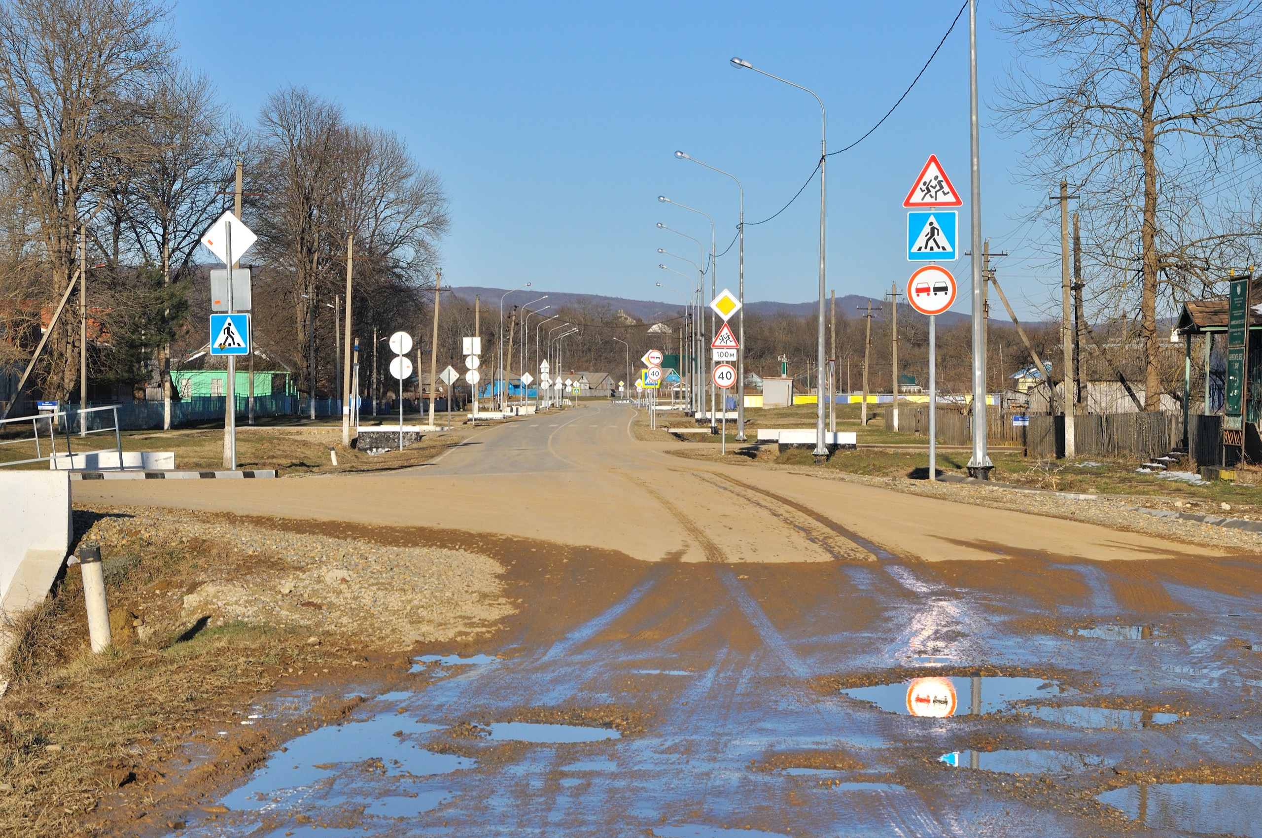 Сначала путь лежит по Новороссийской трассе, у посёлка Афипского сворачиваем в сторону Смоленской. Дорога та же, как и в прошлую поездку к Планческим скалам, только с отличием, что через четыре километра после Смоленской нужно повернуть налево по указателю в сторону Шабановского. Проезжаем безымянный населённый пункт с одной улицей, сразу за ним заканчивается асфальт и начинаются долгие километры в меру разбитого грейдера. Нас ждёт больше 20 километров грунта. Дорога позволяет легко держать скорость в 40–50 км/ч, правда, местами неожиданно возникают ухабы, у которых приходится резко тормозить, но в целом ехать можно на любом авто. Поворот за поворотом, преодолеваем небольшие, но этим холодным утром обледенелые перевальчики, оставляем сбоку посёлок Мирный, поворот на хутор Тхамаха и к половине десятого внезапно снова оказываемся на асфальтированной дороге — въезжаем в Шабановское.