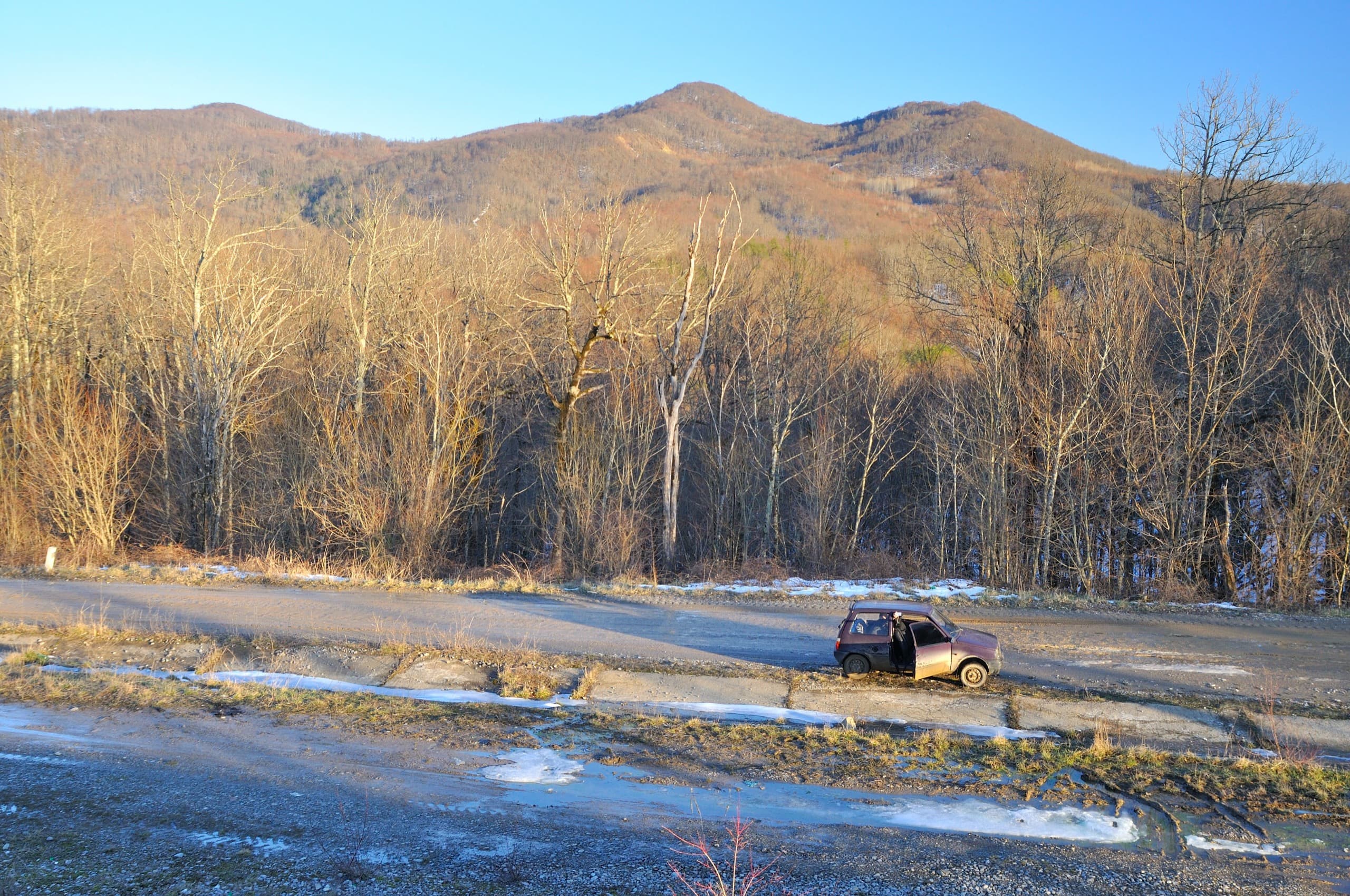 Первые два с половиной километра дорога относительно ровная, подъёмы не тяжёлые, покрытие сносное. Ухабов больше, чем на дороге к Шабановскому, но всё равно гравийка даже лучше той, что ведёт в Планческую щель. Однако дальше начинается самое интересное. Первый знак сообщает о грозных 17% подъёма и тут же за поворотом дорога резко забирает вверх. Вытягиваем, потом ещё один подъём и ещё. И вот за очередным пригорком грейдер уходит вниз длинным спуском за которым начинается затяжной и очень крутой подъём. Разгоняюсь сколько не жалко подвески, начинаю подъём. Сначала всё идёт хорошо, но за поворотом ледяная каша под колёсами становится всё более жёсткой и, не вытягивая каких-то десять метров до верха, машина замирает. Колёса яростно крутятся, но с места сдвинуть авто не могут. Открываю дверь, провожу пальцами по дороге — чистый лёд. Приходится долго и напряжённо скатываться по обледенелому склону. Штурмую второй раз, на этот раз налегке. И снова неудача. После четвёртой попытки решаем не искушать судьбу и останавливаемся остудить двигатель перед обратной дорогой.