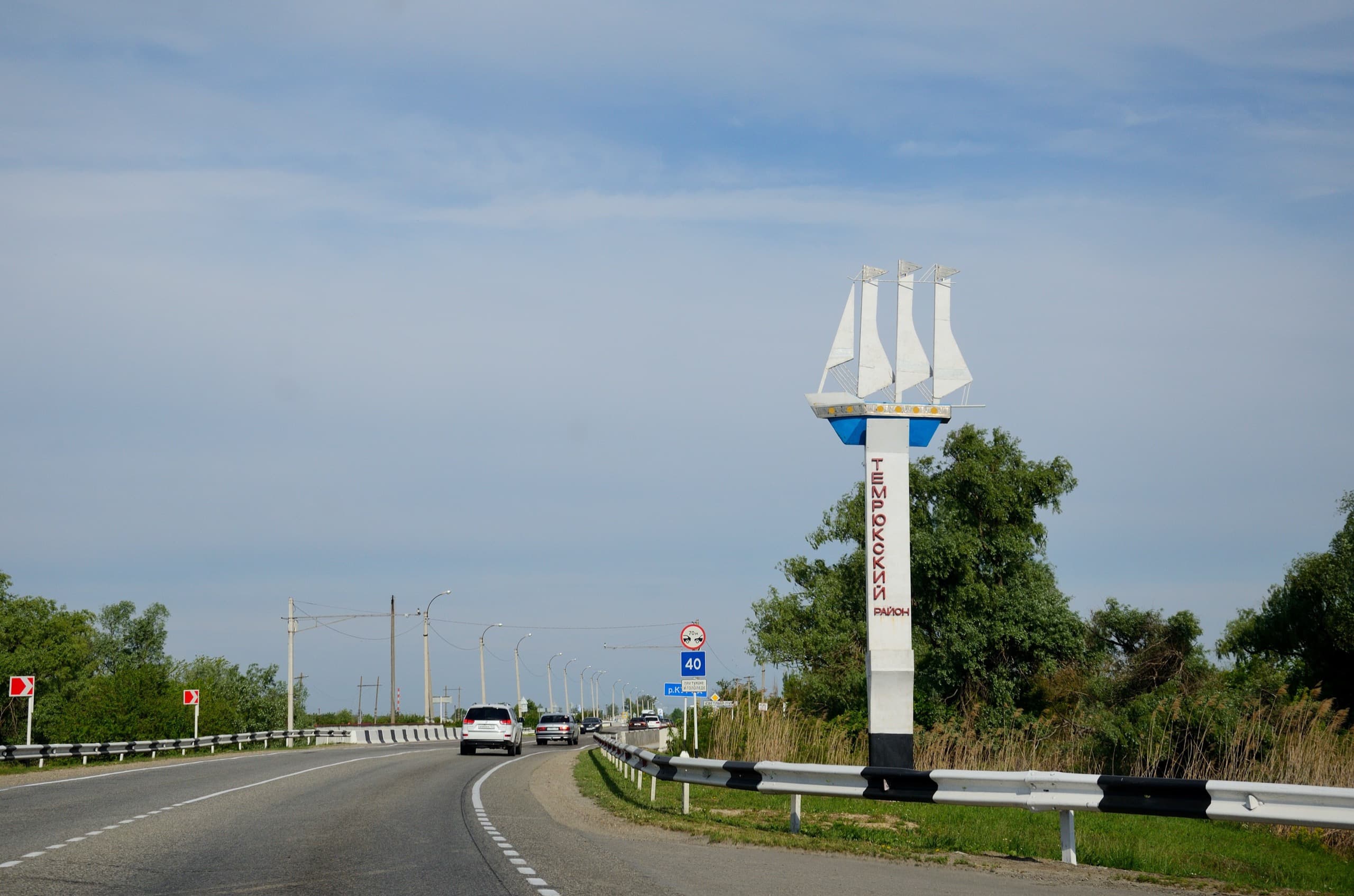 И вот, после полутора часов езды перед глазами появляется стела «Темрюкский район». Кораблик было бы логично заменить или дополнить гроздью винограда, уж слишком великую роль эти плоды играют в жизни района.