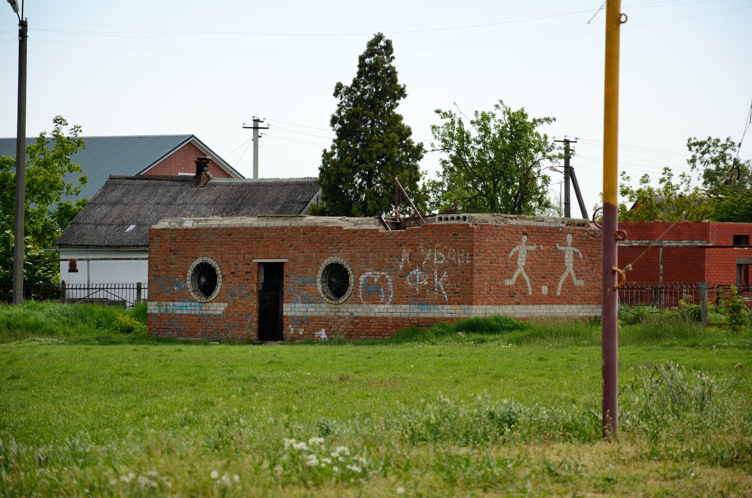 Возле площади футбольное поле с «глазастыми» развалинами, на стене которых кирпичные человечки гоняют мяч.