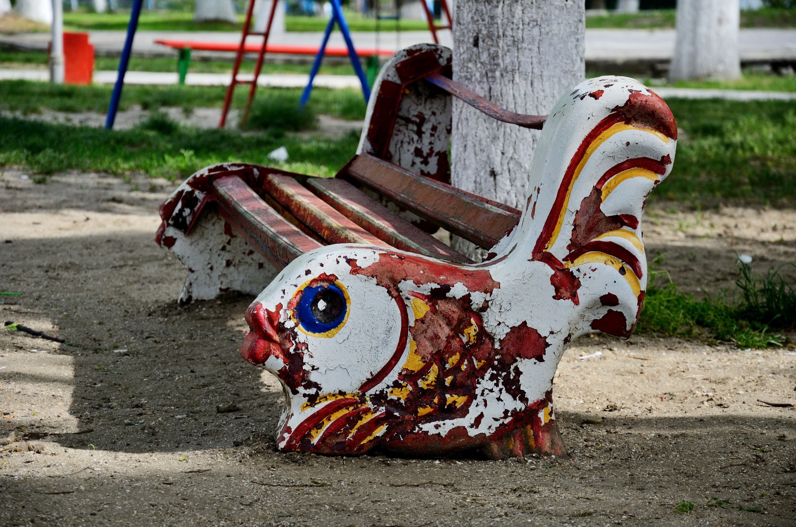 Кривые лавочки, напоминающие жуков-инвалидов.