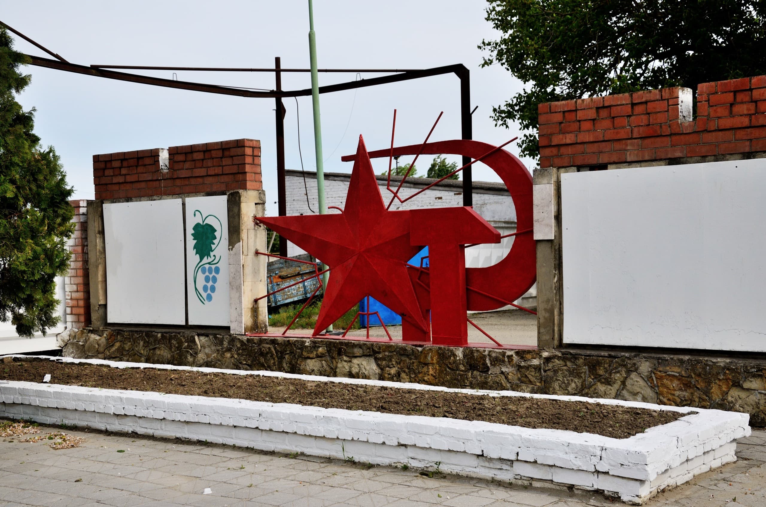 На стене гаража винсовхоза монументальный серп и молот, щедро сдобренный красной краской.