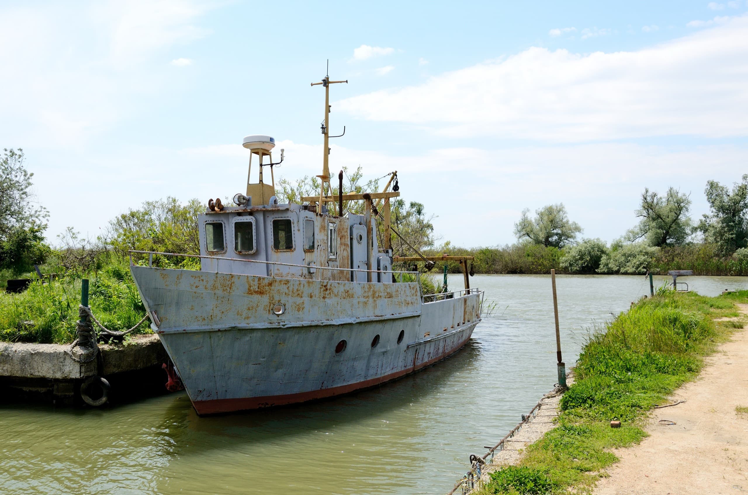 Несколько сот метров и мы оказались у полузаброшенной лодочной станции. На машину набросилась со звонким воем дворняжка — место обитаемо. Остановились. В небольшой заводи стоит маленький кораблик и несколько лодок, другой корабль стоит на стапеле, на суше.