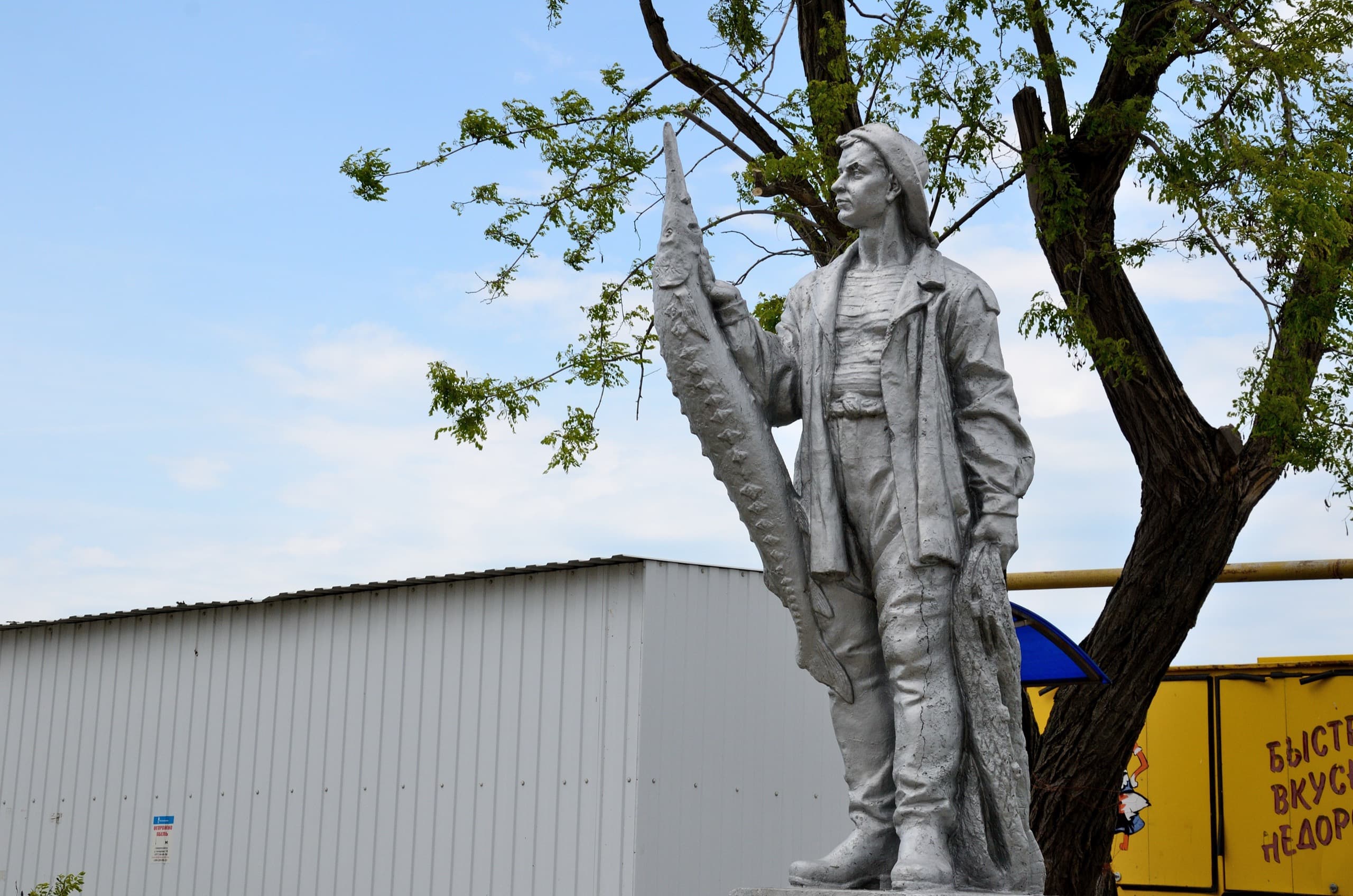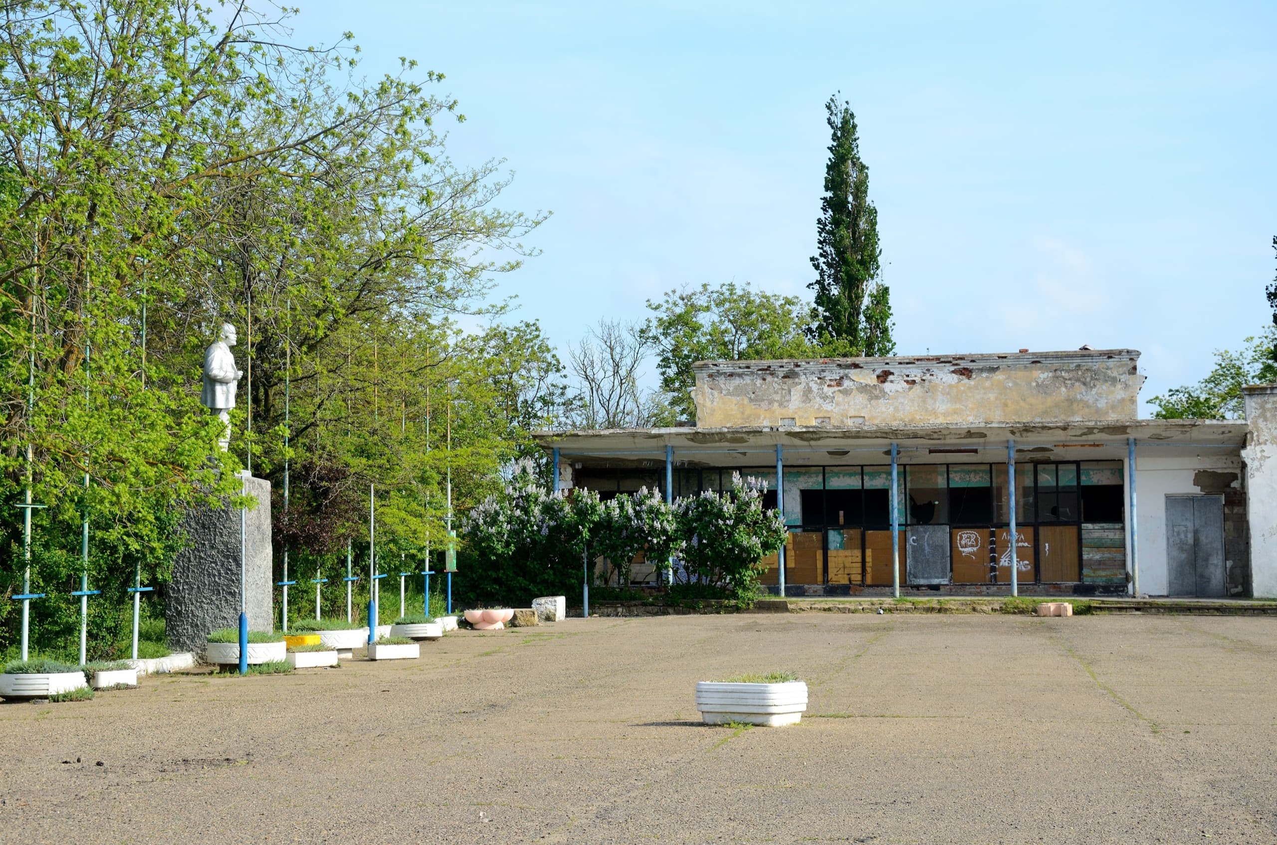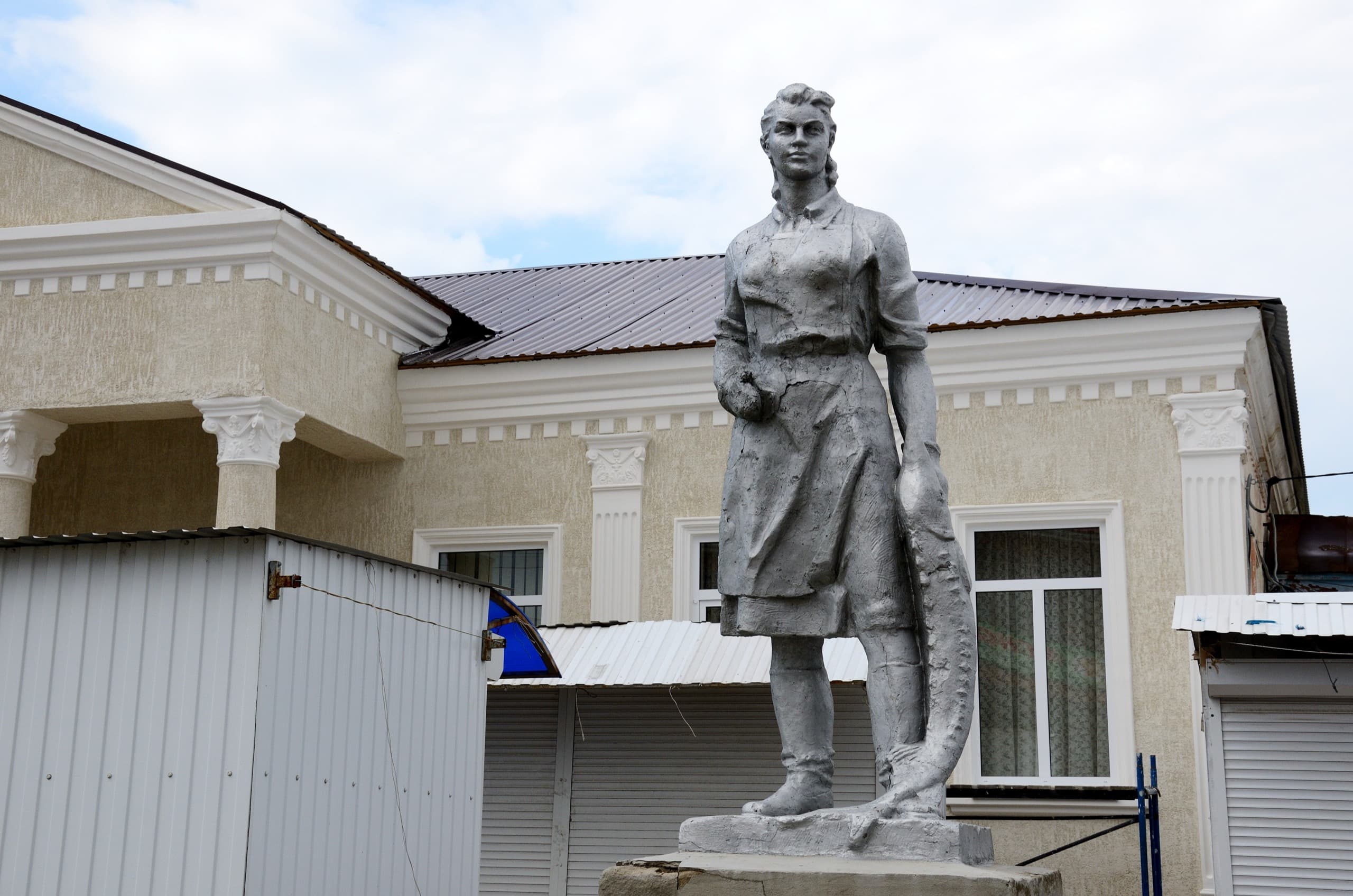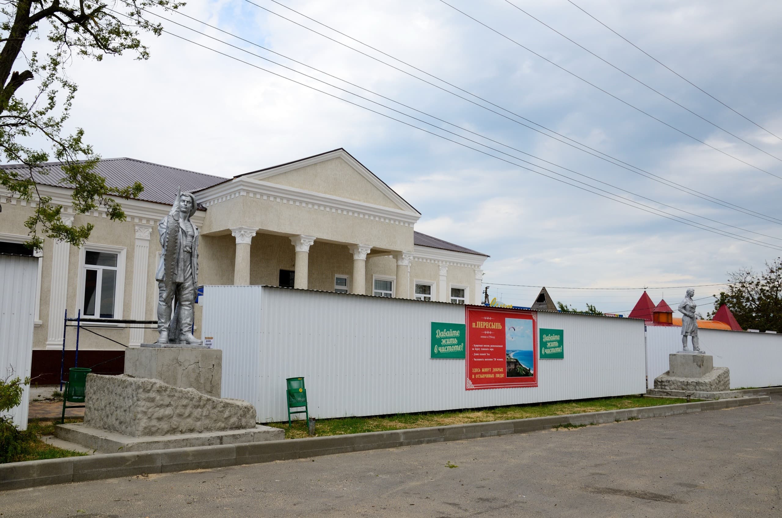 И тут же возле них одно из самых приличных зданий посёлка наглухо закрыто рядком торговых лавок. Это не баннер на фасаде и не пластиковое окно, это безобразие выше всякой меры и плевок в лицо всем, кто когда-то облагораживал Пересыпь, поставил эти прекрасные статуи, построил этот дом.