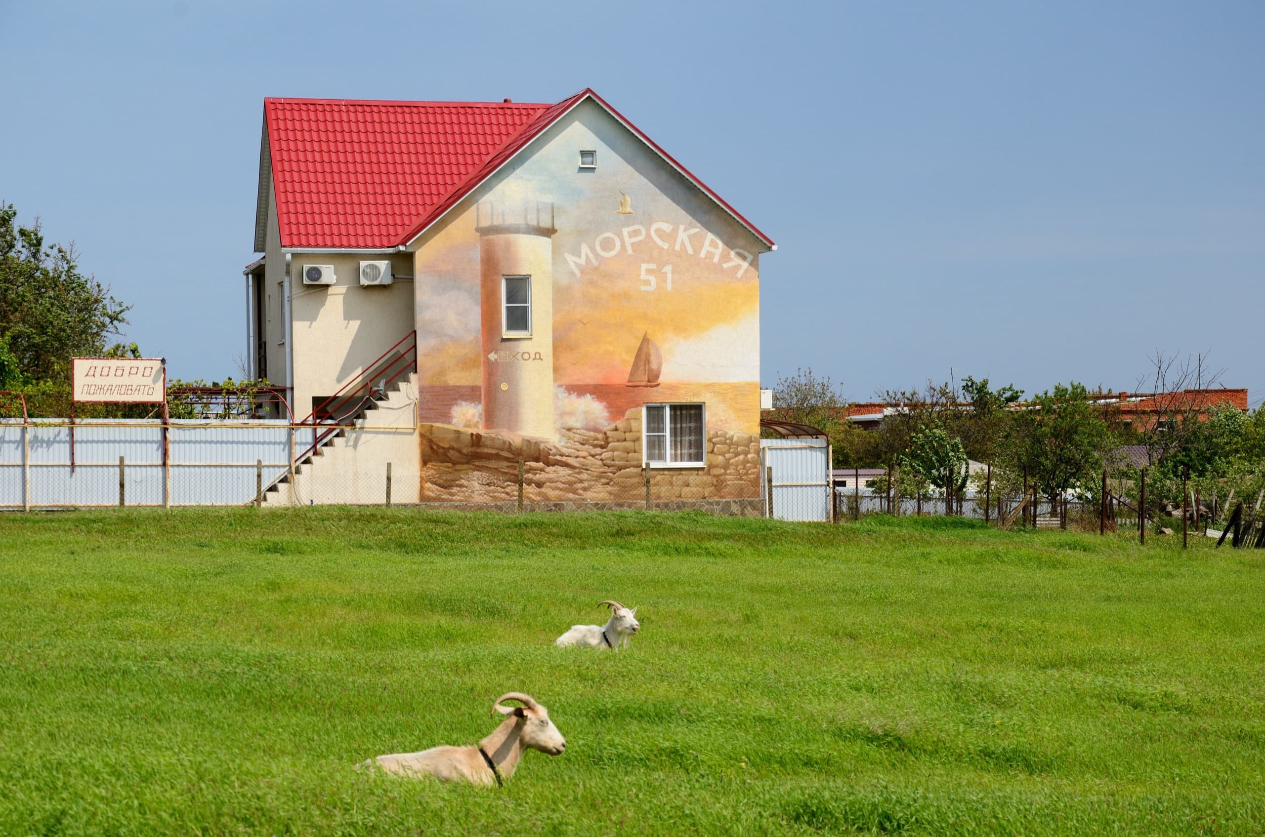 Возвращаясь от вулкана к трассе, увидел вот такой дом. Заборы ужасны — роспись крута. И козы напоминают, что мы всё-таки в деревне, а не на курорте.