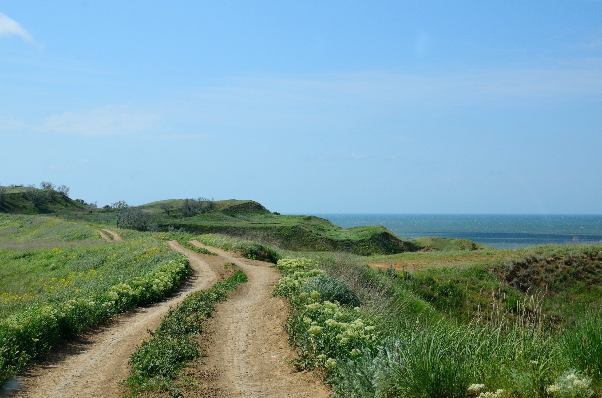 Грунтовая дорога, что идёт вдоль берега, — обычная полевая двуколейка. Качества не самого лучшего, сильно не разгонишься, но оно и лучше. Виды с неё хорошие, неторопливая езда не утомляет. Холмики, зелень, полянки цветов, виноградники, бескрайнее море.