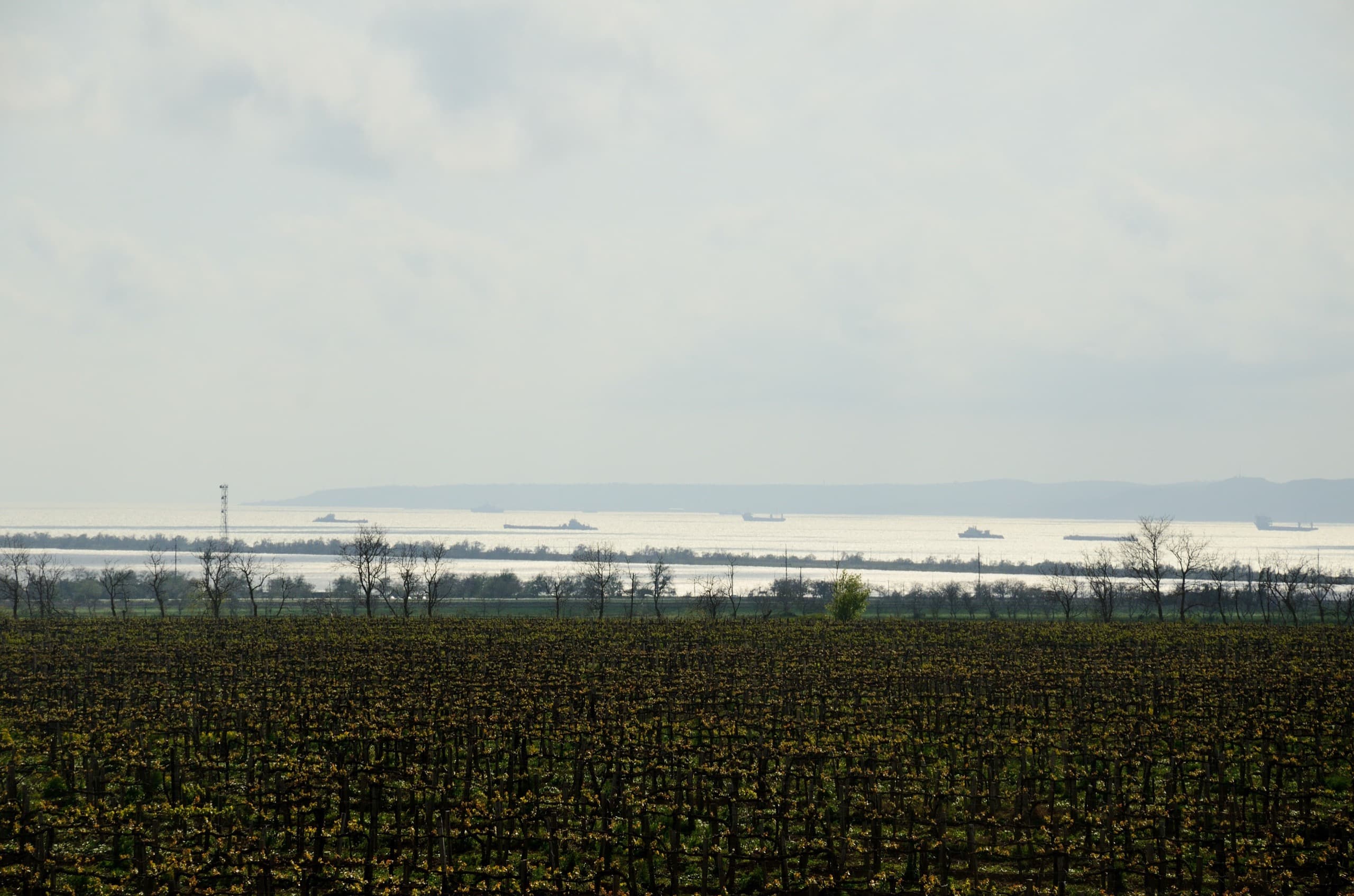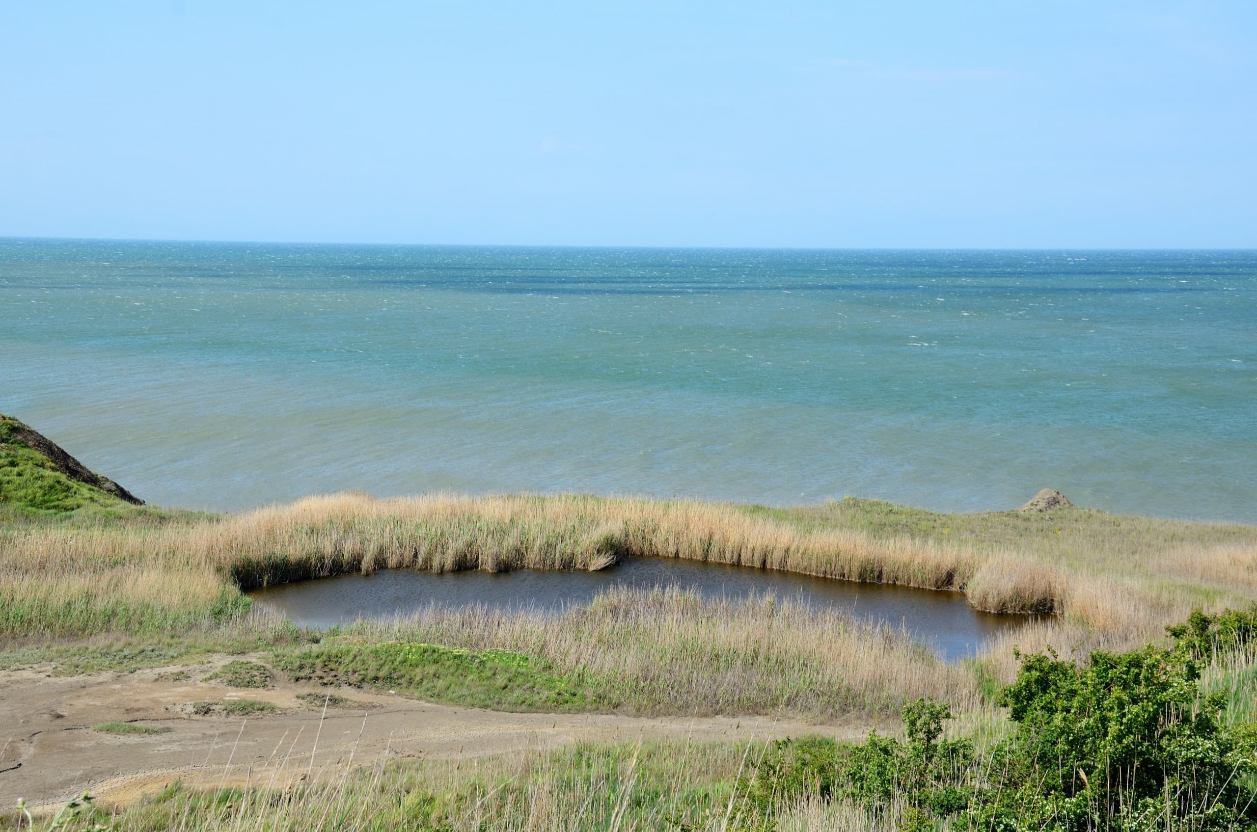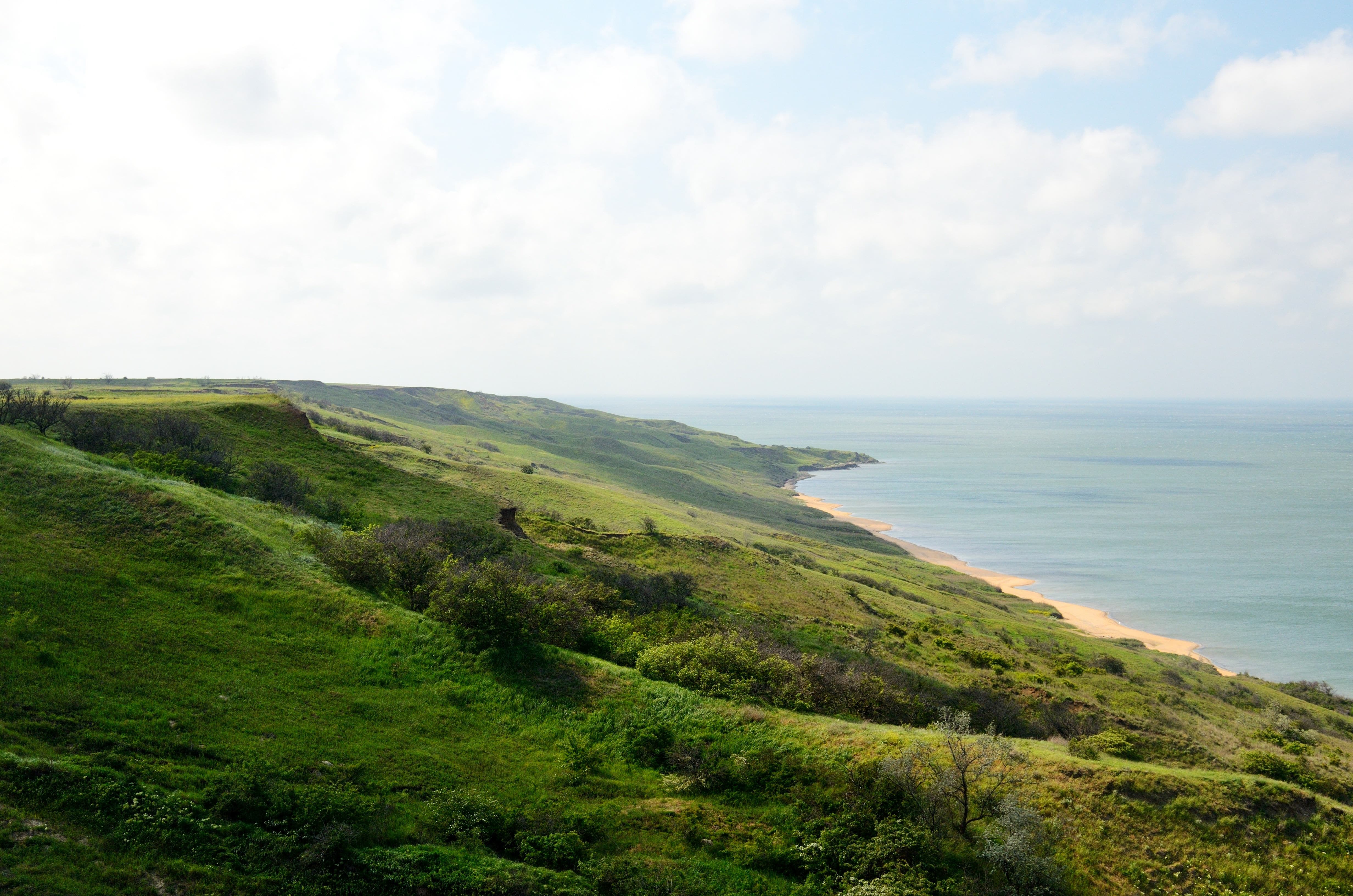 С одного пригорка по пути к Ильичу открывается вид на косу Чушку, Порт-Кавказ и крымский берег.