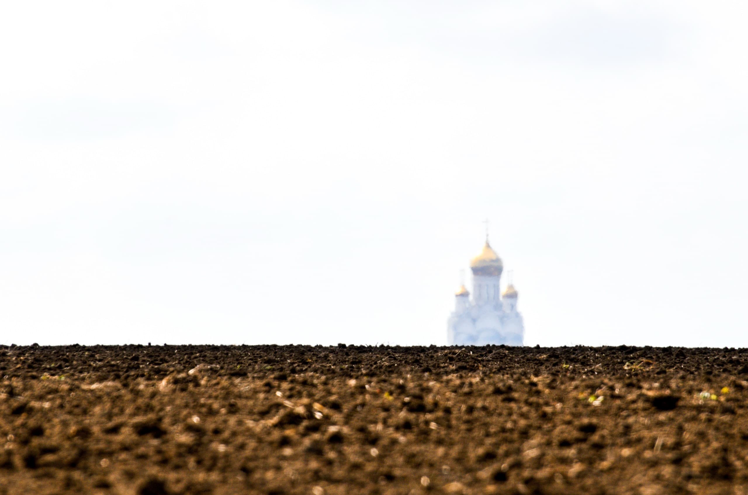 Внезапно из-за холма появляется церковь. Земля, небо и купола.