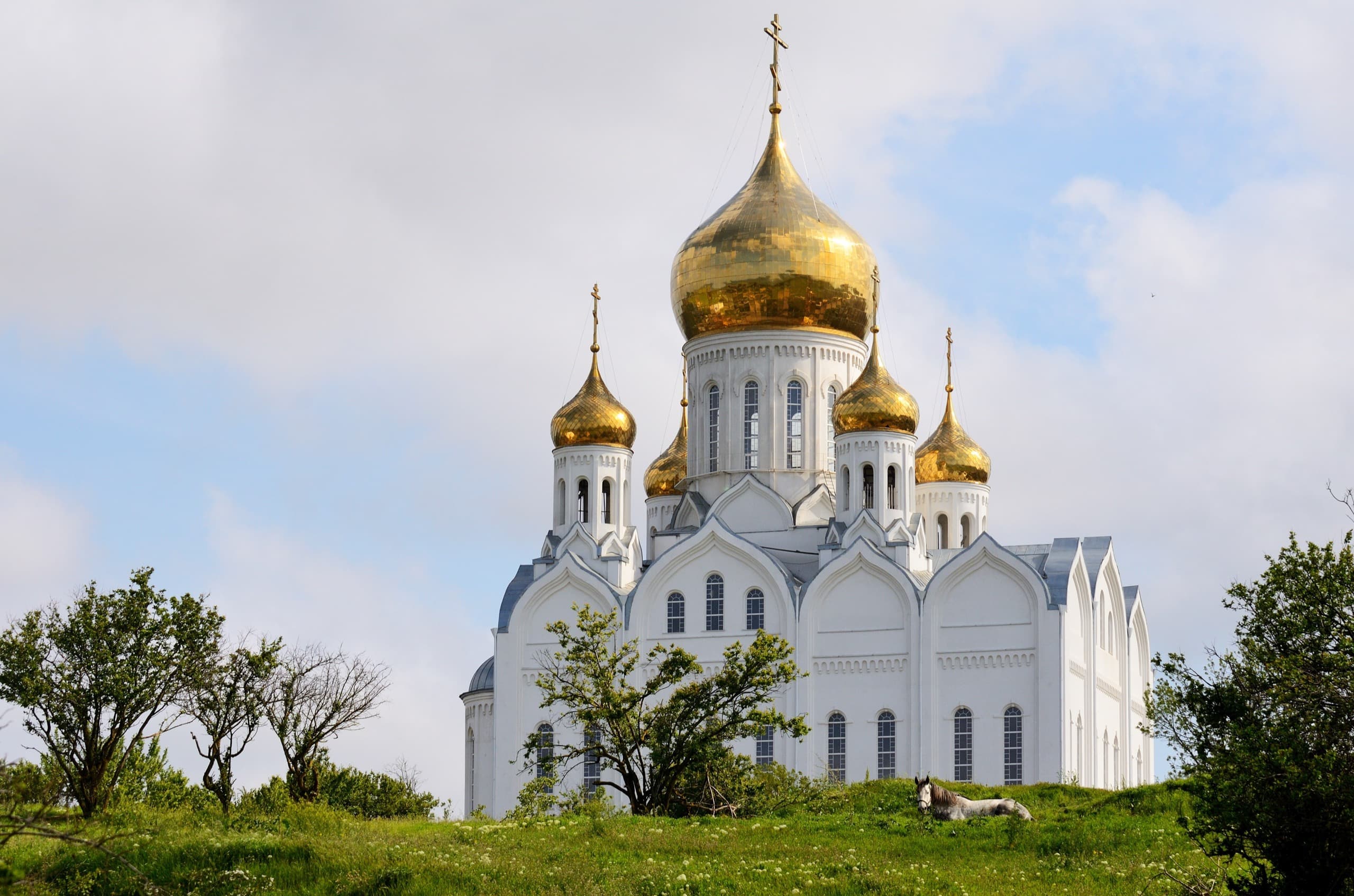 И вот, наконец, мы въезжаем в посёлок Приазовский. Посёлок этот в пару улиц, некогда был центром крупного винсовхоза, а сегодня здесь расположилось подворье Саввино-Сторожевского монастыря и храм Святой Троицы. Один из самых крупных храмов юга России, его видно за многие километры. Что примечательно, церковь выдержана в духе прекрасных монастырских церквей XVI — XVII веков. Такие творения в современности скорее исключение, чем правило.
