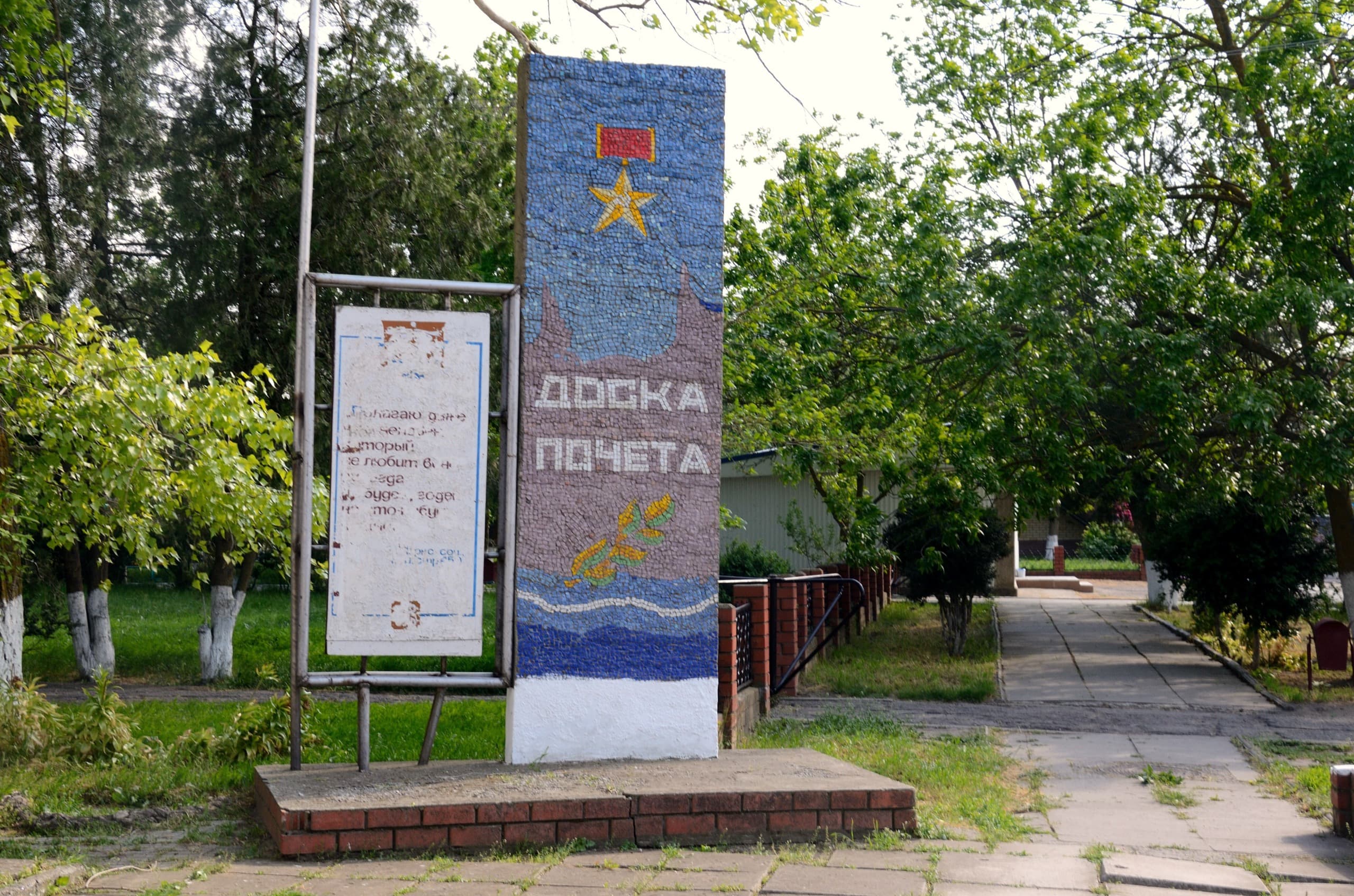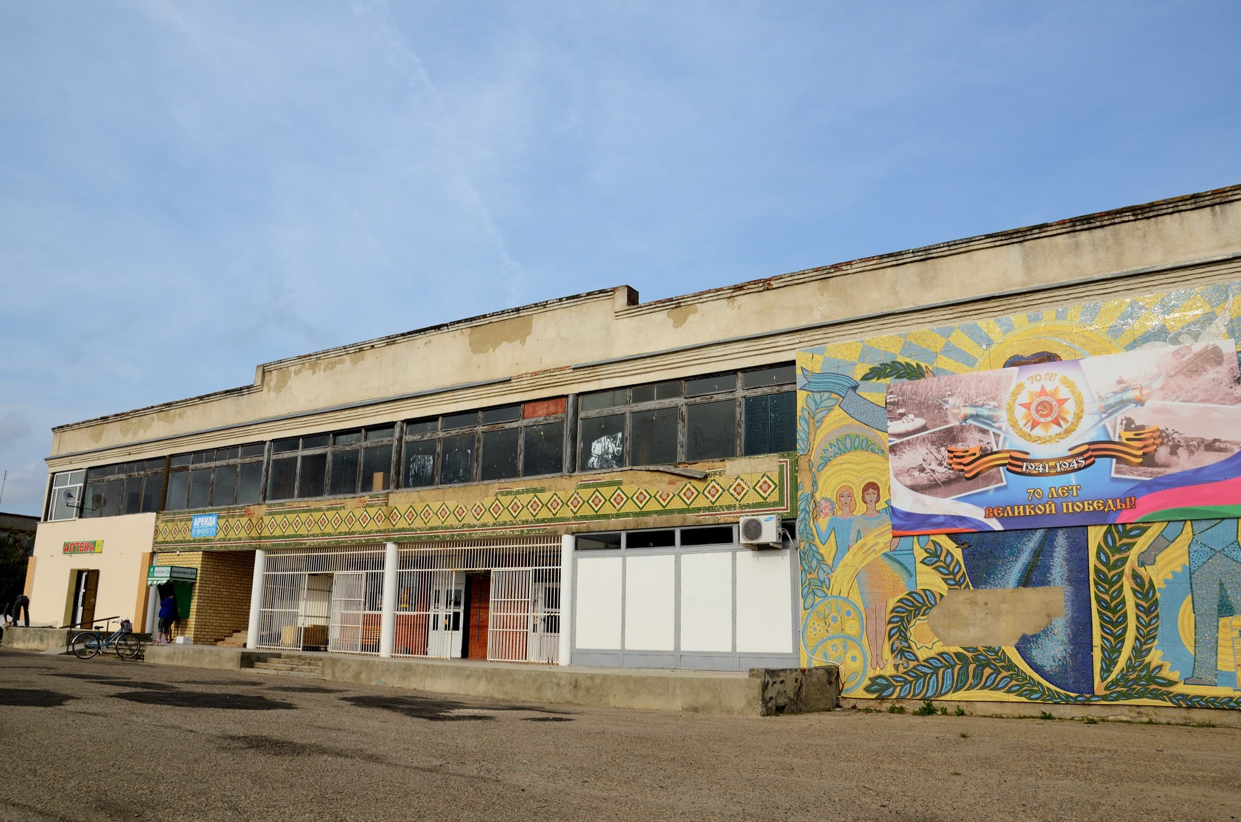 На страшном-страшном здании есть красивая мозаика, я помнил её и хотел сфотографировать, однако она оказалась заклеена уродским баннером. Да, я говорил уже об этом в записи про Темрюк насколько велика сама победа, настолько ущербны баннеры и прочая рекламная кампания, посвящённая её 70-й годовщине. Криворукость впервые увидевшего фотошоп, хотя нет, скорее корел, горе-дизайнера помножена втрое криворукостью чиновников, для этих баннеров подбиравших места.