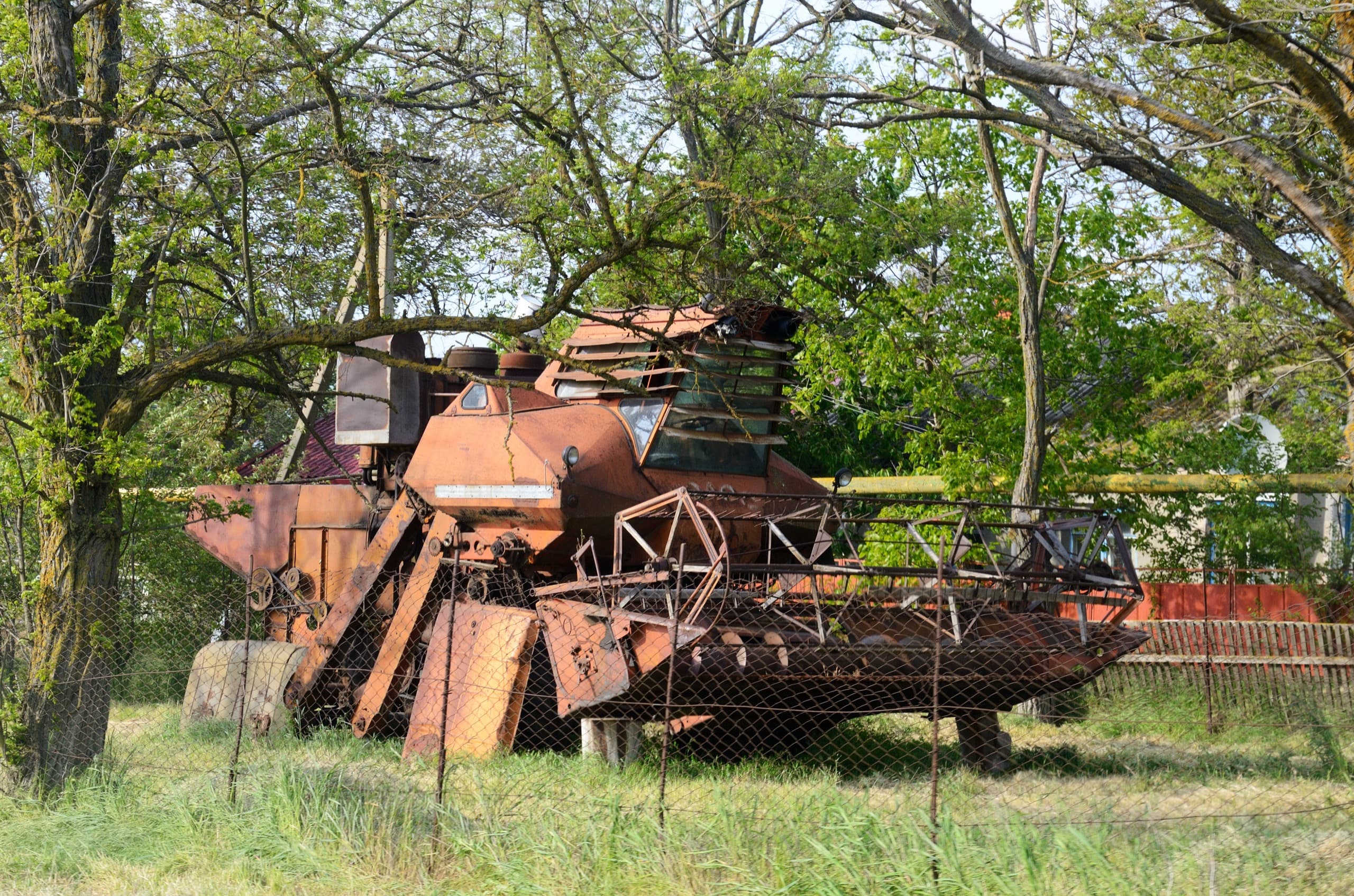 И ржавый комбайн в огороде.