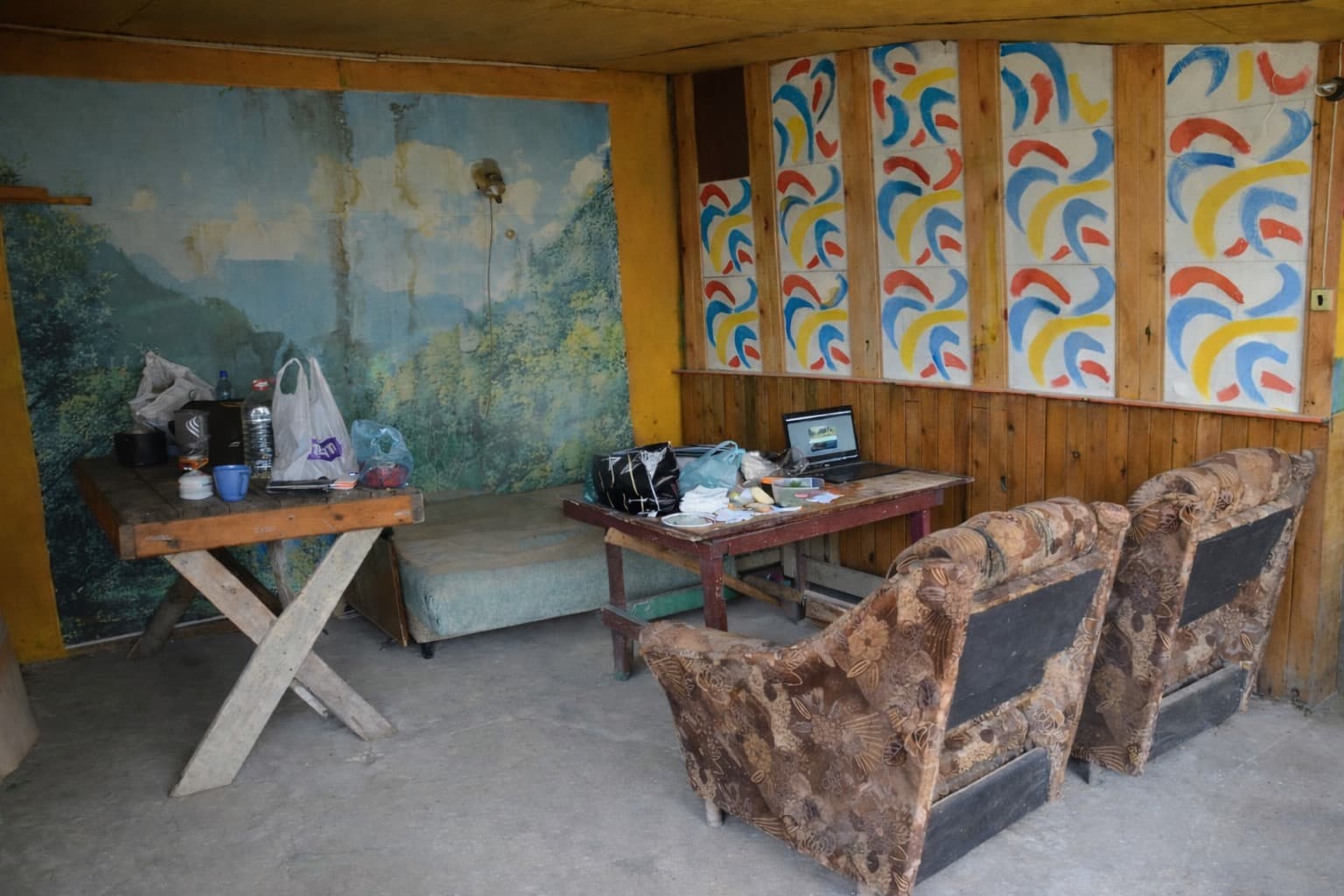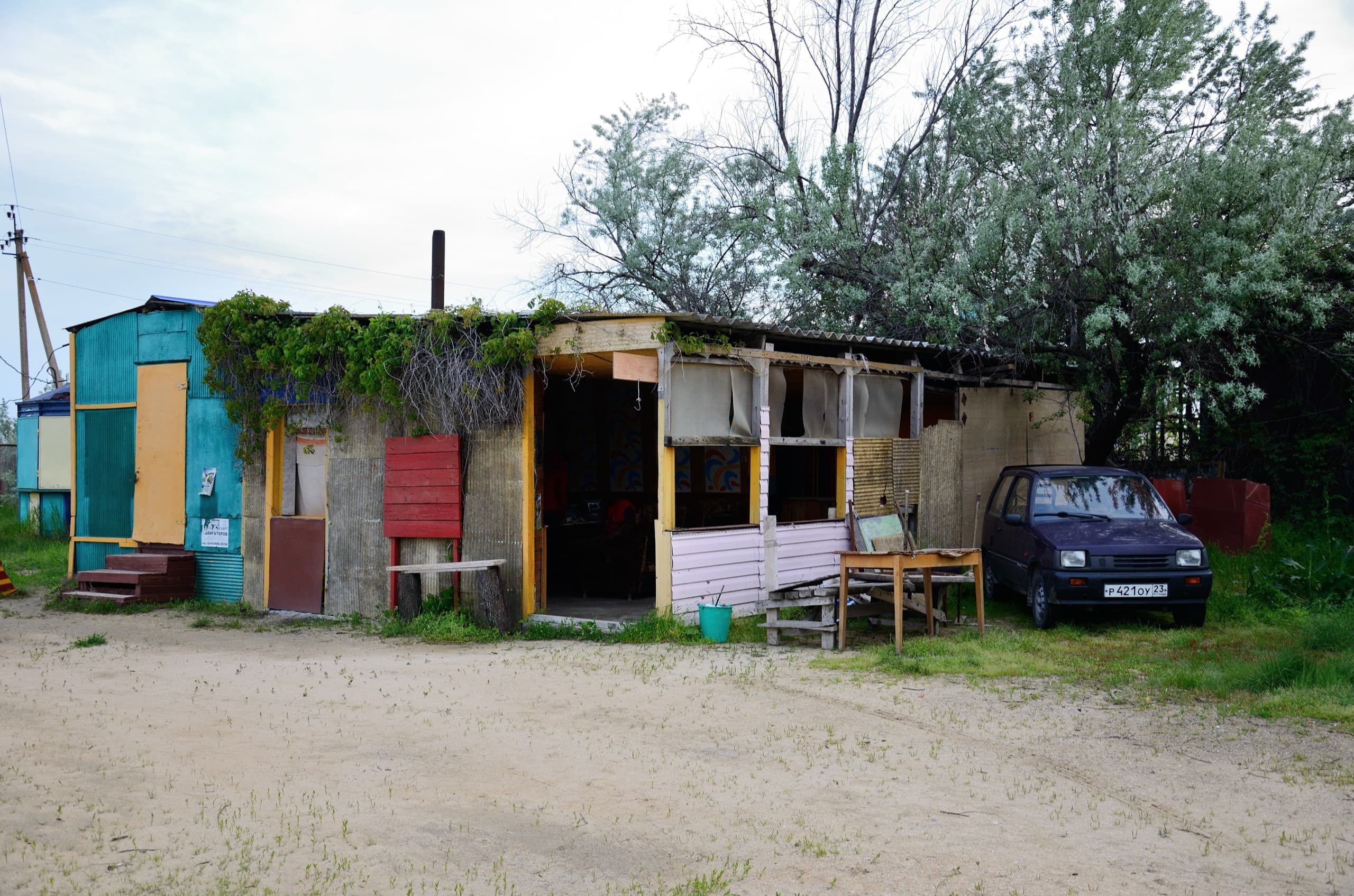 После Юбилейного возвращаемся в Голубицкую на ночлег. Мы планировали ночевать в палатке, на берегу моря, для этого стали искать автокемпинги. Естественно, что в середине мая все они бездействуют. Сначала мне пообещал место хозяин кемпинга «Теремок» за 400 рублей (150 рублей с человека, без разницы сколько палаток и 100 рублей машина), однако на месте никого не оказалось и нам пообещал открыть сосед, который за «Теремком» приглядывает. Мутная схема — едем дальше. В автокемпинге «Дружба» оказались открыты ворота, хозяева начинают приводить в порядок территорию. Они сказали, что мы первые постояльцы в кемпинге и сговорились на 300 рублей. Нам оставили ключ от ворот, на случай если вдруг мы не застанем их вечером и предложили не раскладывать палатки, а заночевать в их сарайного вида веранде, в которой есть два старых кресла, ещё более старый диван и стол. Так мы и поступили, разложив на диване, как в палатке коврики-пенки и спальные мешки.