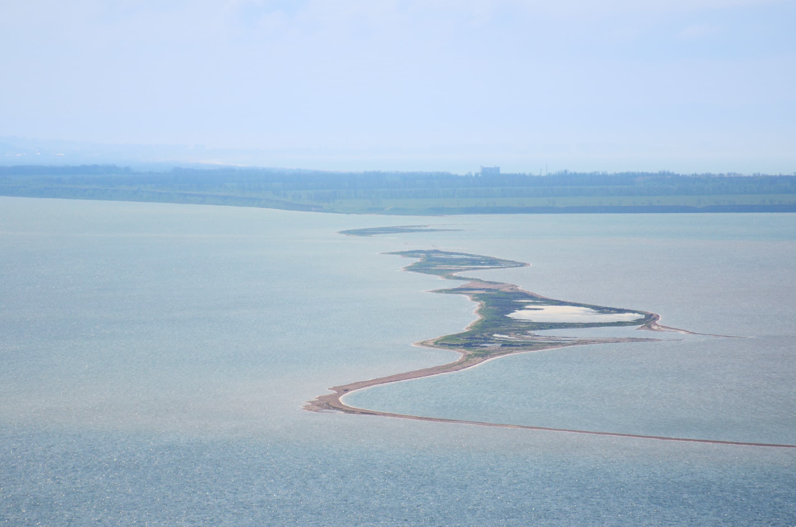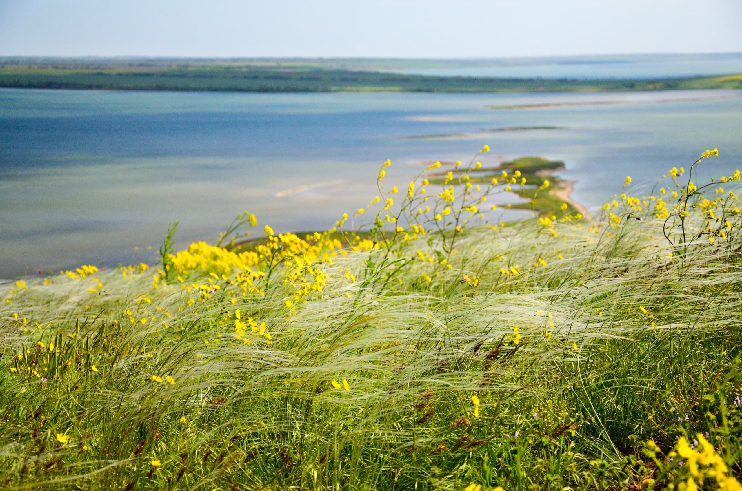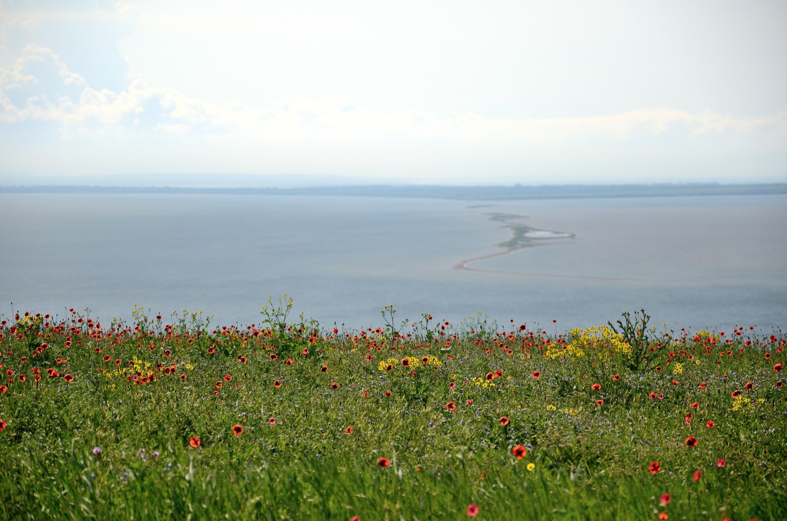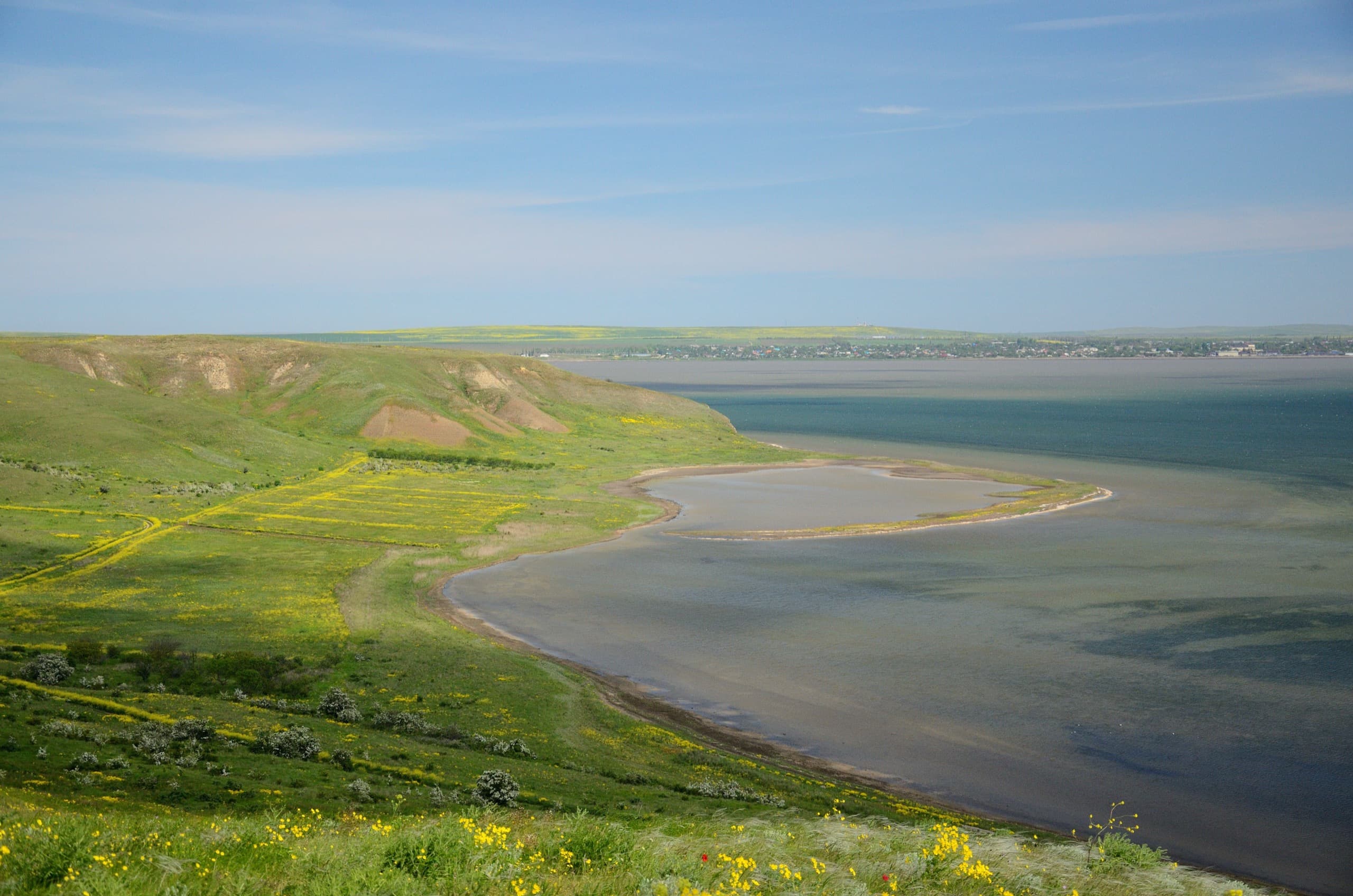 На вершине Поливадина цвели маки и много других цветов. Вот мы с этой же точки видим Голенькую косу. Справа от неё Бугазский лиман, слева Кизилташский. На самом заднем плане можно увидеть Благовещенскую.