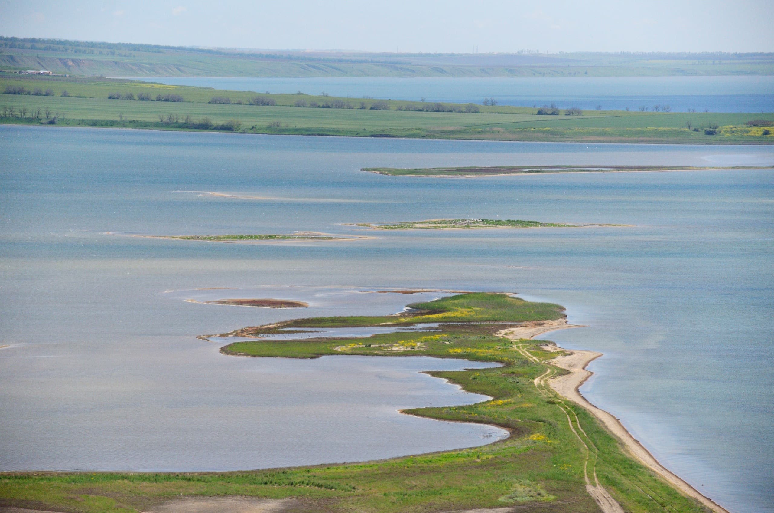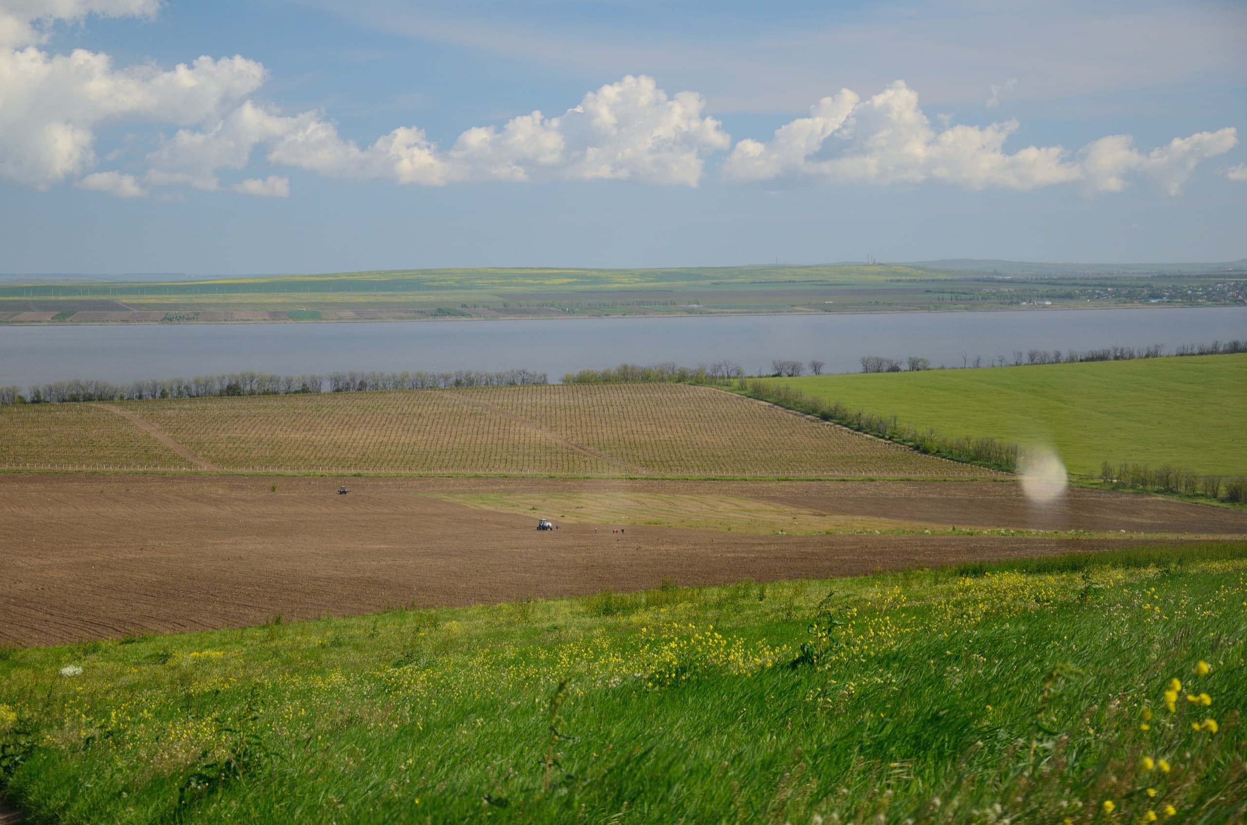 На спуске с горы Поливадина. Чётко разграничивается степь дикая и освоенная человеком. На заднем плане лиман Цокур.