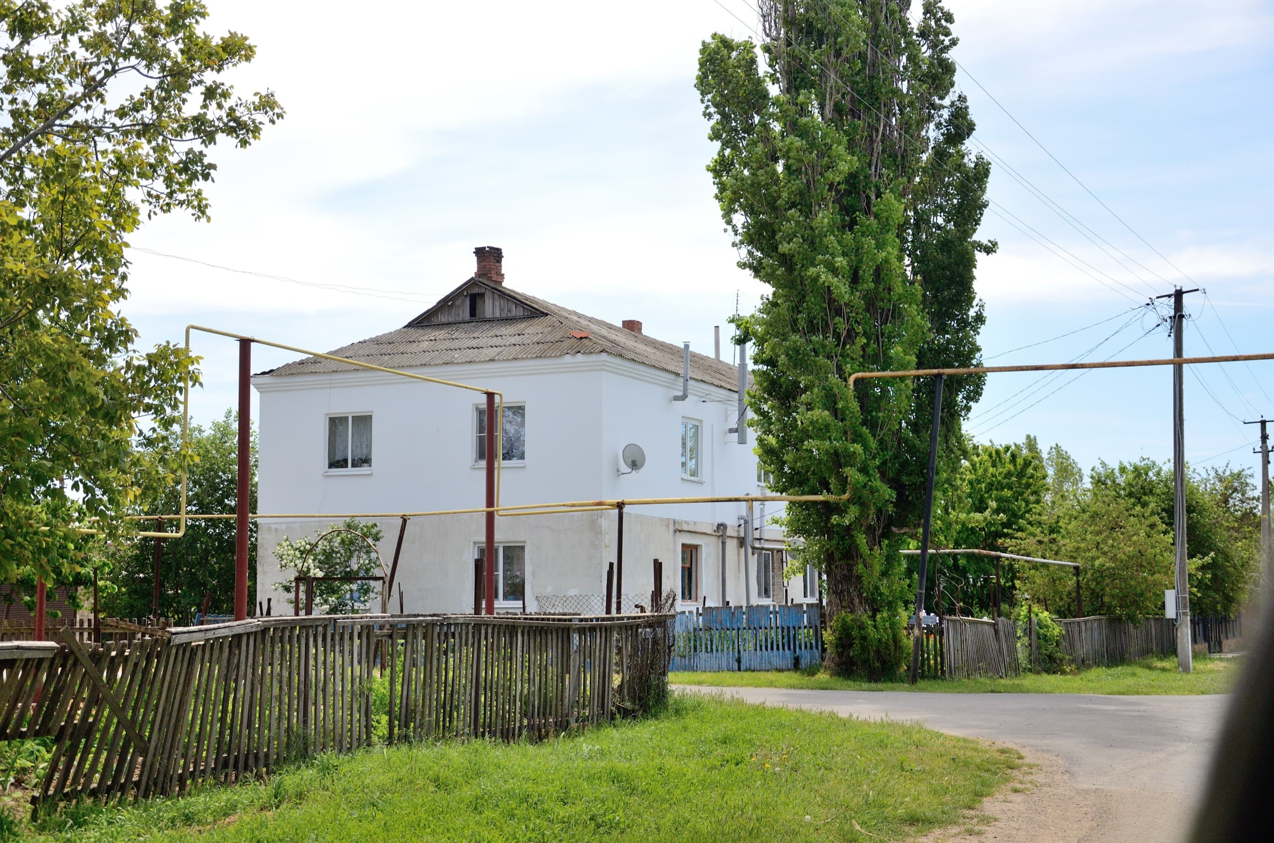 Хороший подвид двухэтажного дома, только почему-то побелили на нём лишь второй этаж. Кстати, проведите эксперимент — уберите мысленно заборы или сделайте их в два раз ниже, чтобы собаки таки не топтали священные для сельского жителя огороды. Лучше?