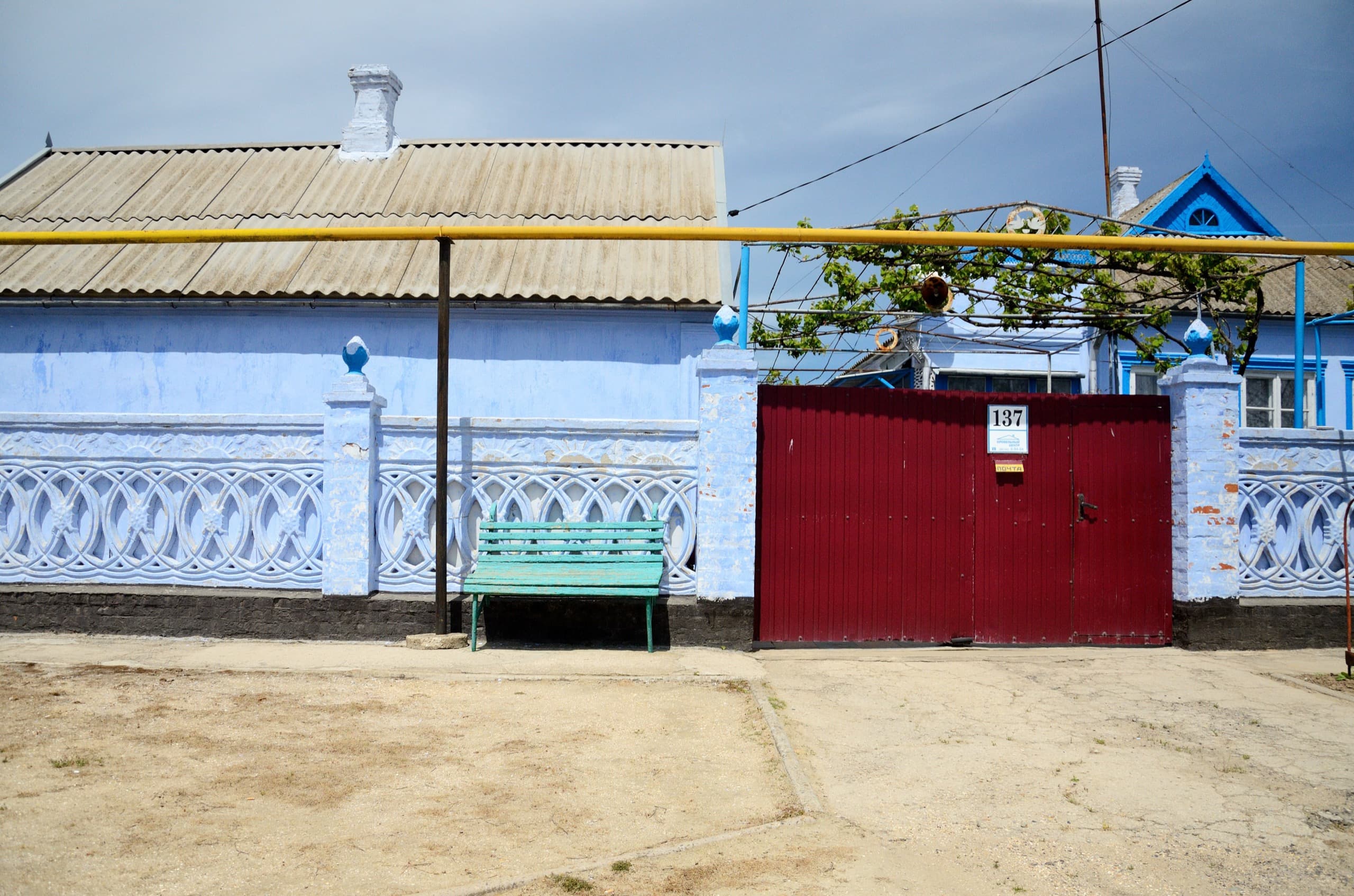 Есть и двухэтажные коробки. В этом примере приятно видеть карниз. Забору минус, надо бы съездить местным коммунальщикам в Береговой и посмотреть как можно симпатично покрасить этот страшненький подвид таманского бетонного забора.