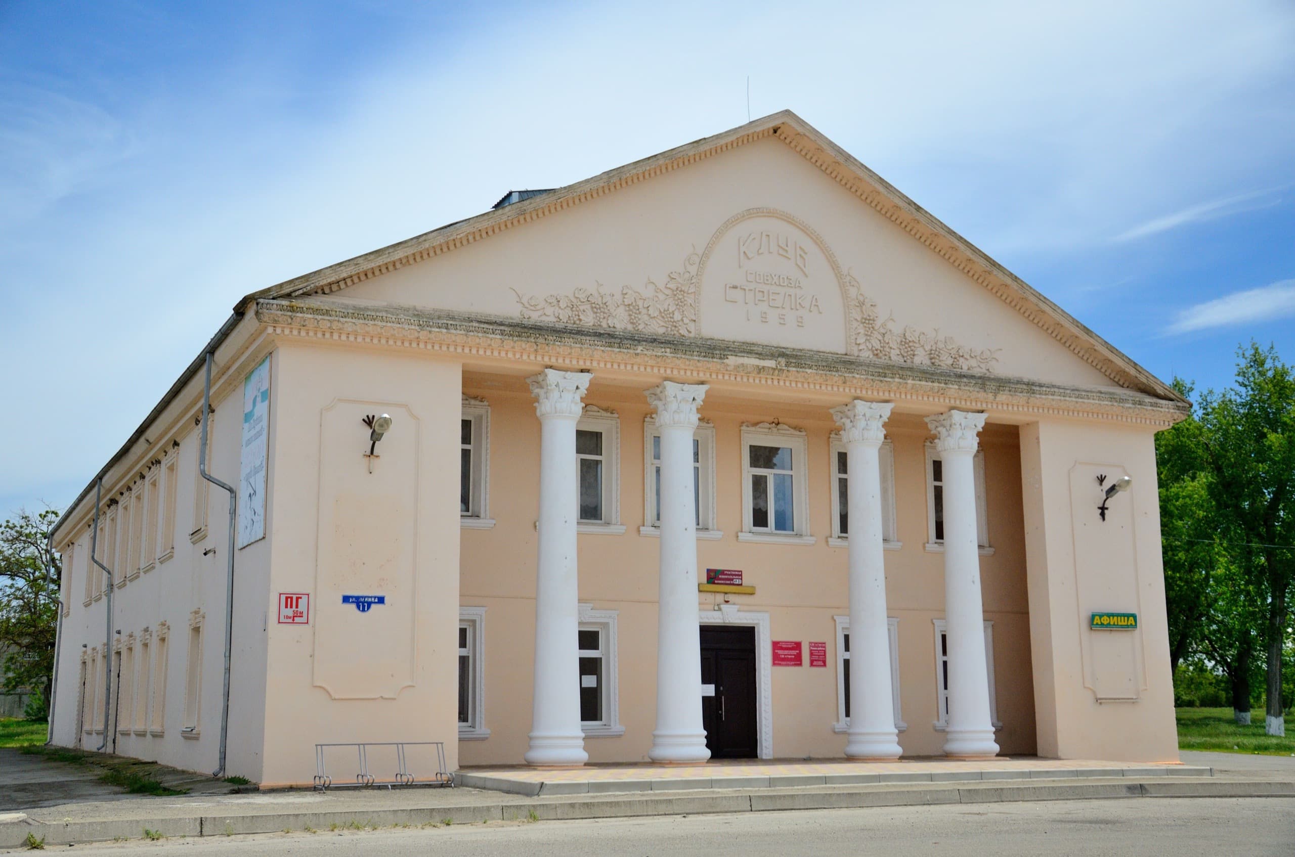 В Стрелке есть ещё один крутой дом культуры. Третий подряд. Здесь баннер присутствует, но его хотя бы не стали лепить на лицо здания, и на том спасибо.