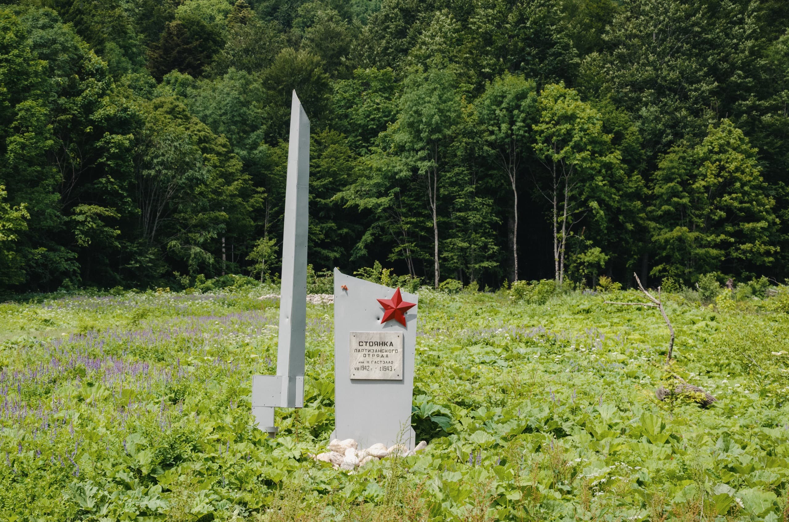 Первые километры были скучными. Каменистая и ухабистая дорога петляла по лесу без особых видов по сторонам. Старт она взяла круто: за два с половиной километра набрала пятьсот метров высоты. После лесной хайвей стал более пологим и прямым. Ещё несколько километров и мы приехали к поляне с неприметным памятником партизанам. В простонародье его зовут «Штык».