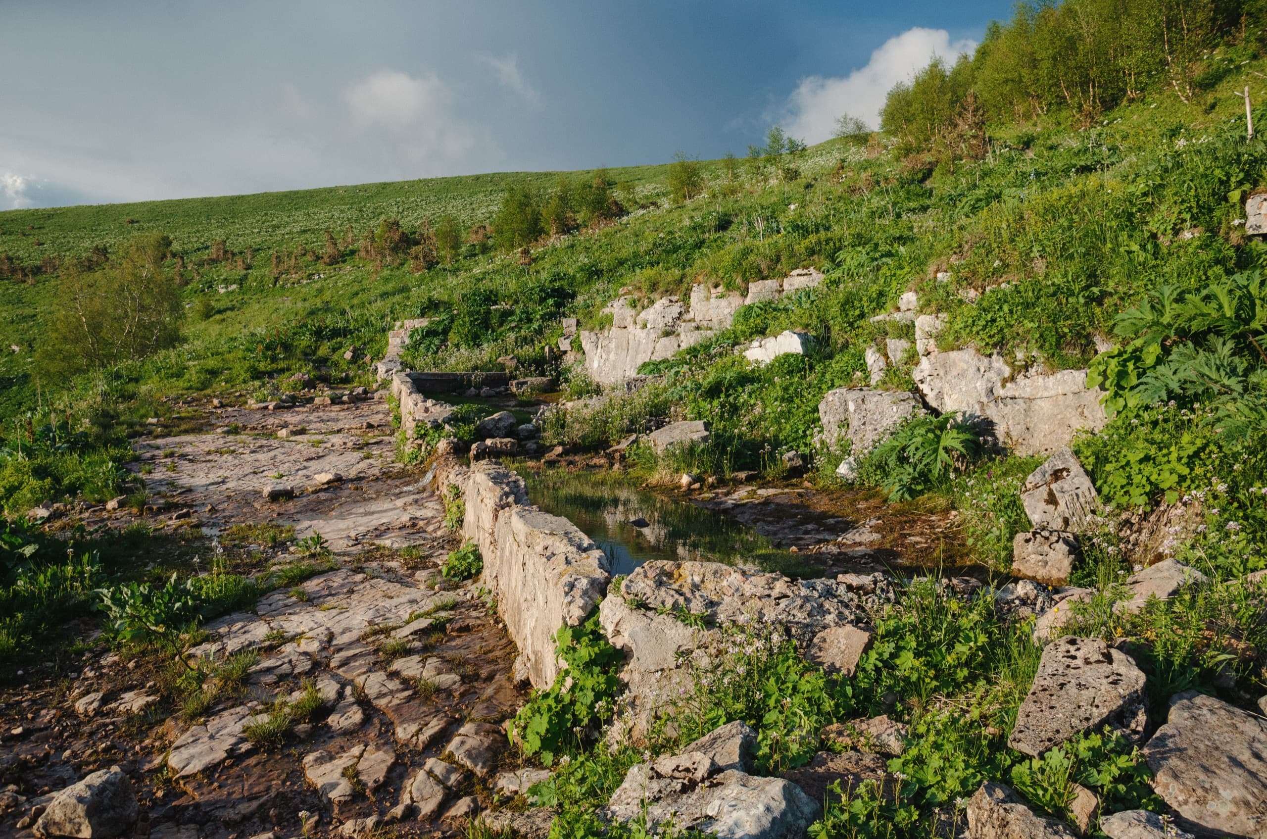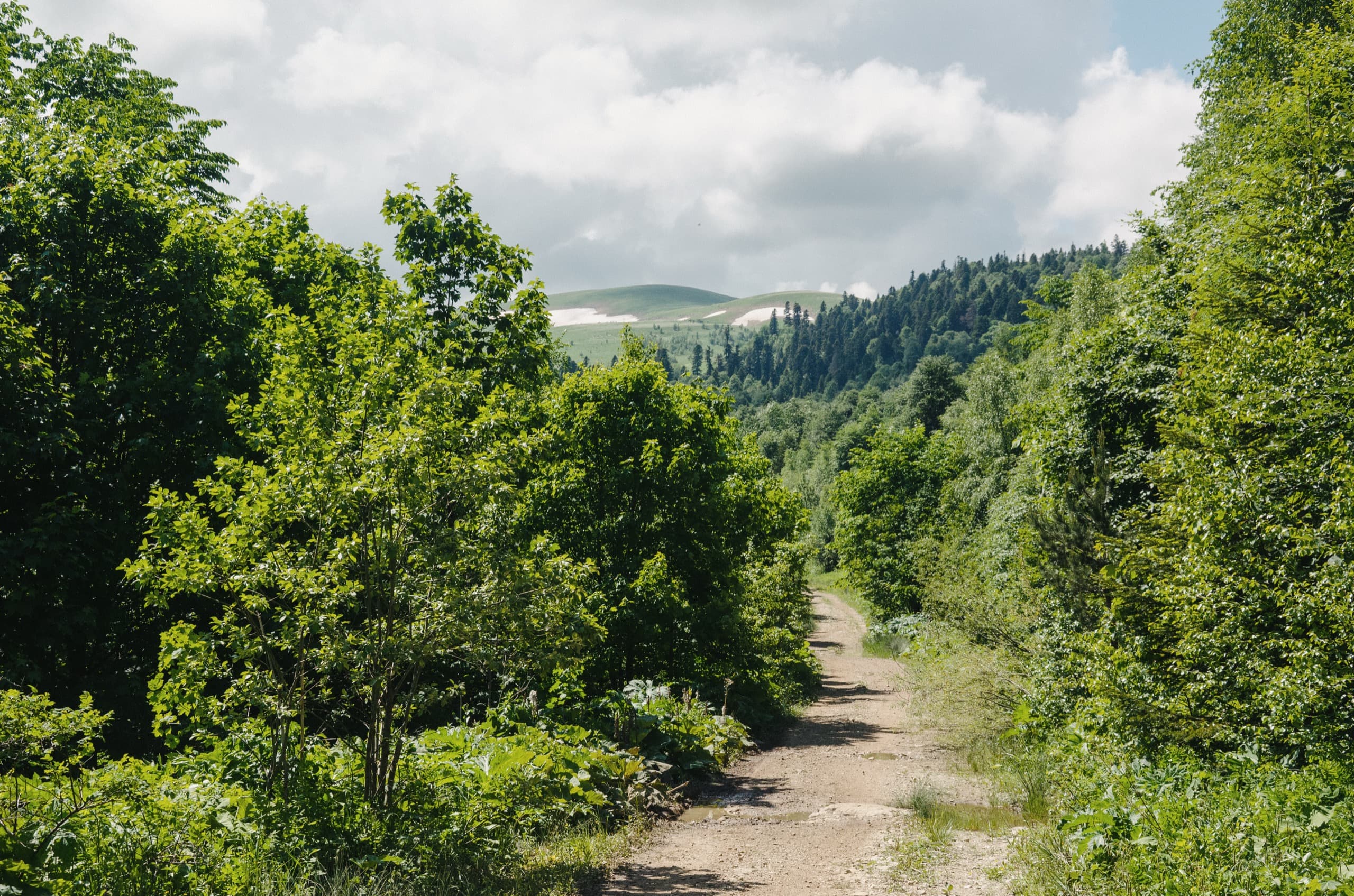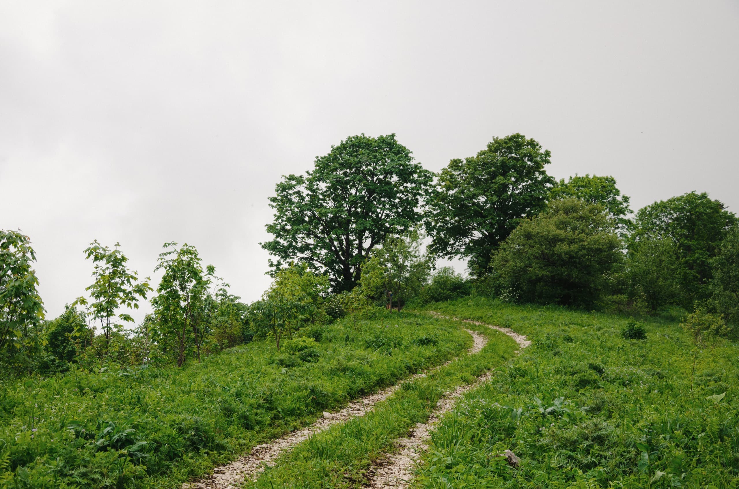 Первые три километра пешей части маршрута продолжали идти в лесу. Каменистая дорога под ногами плавно набирала высоту. Через какое-то время по обочинам начали появляться первые поляны. Большинство из них стояли заросшие высокой, по грудь и выше травой.