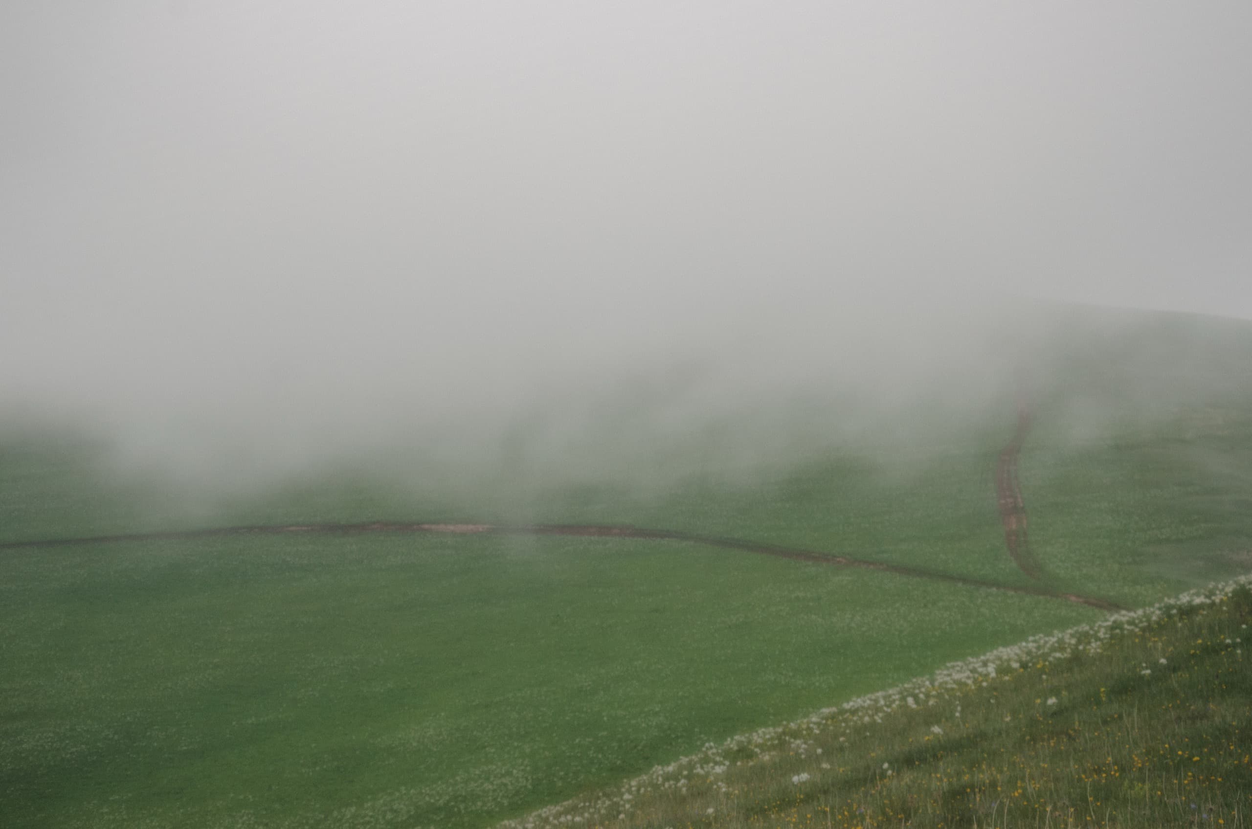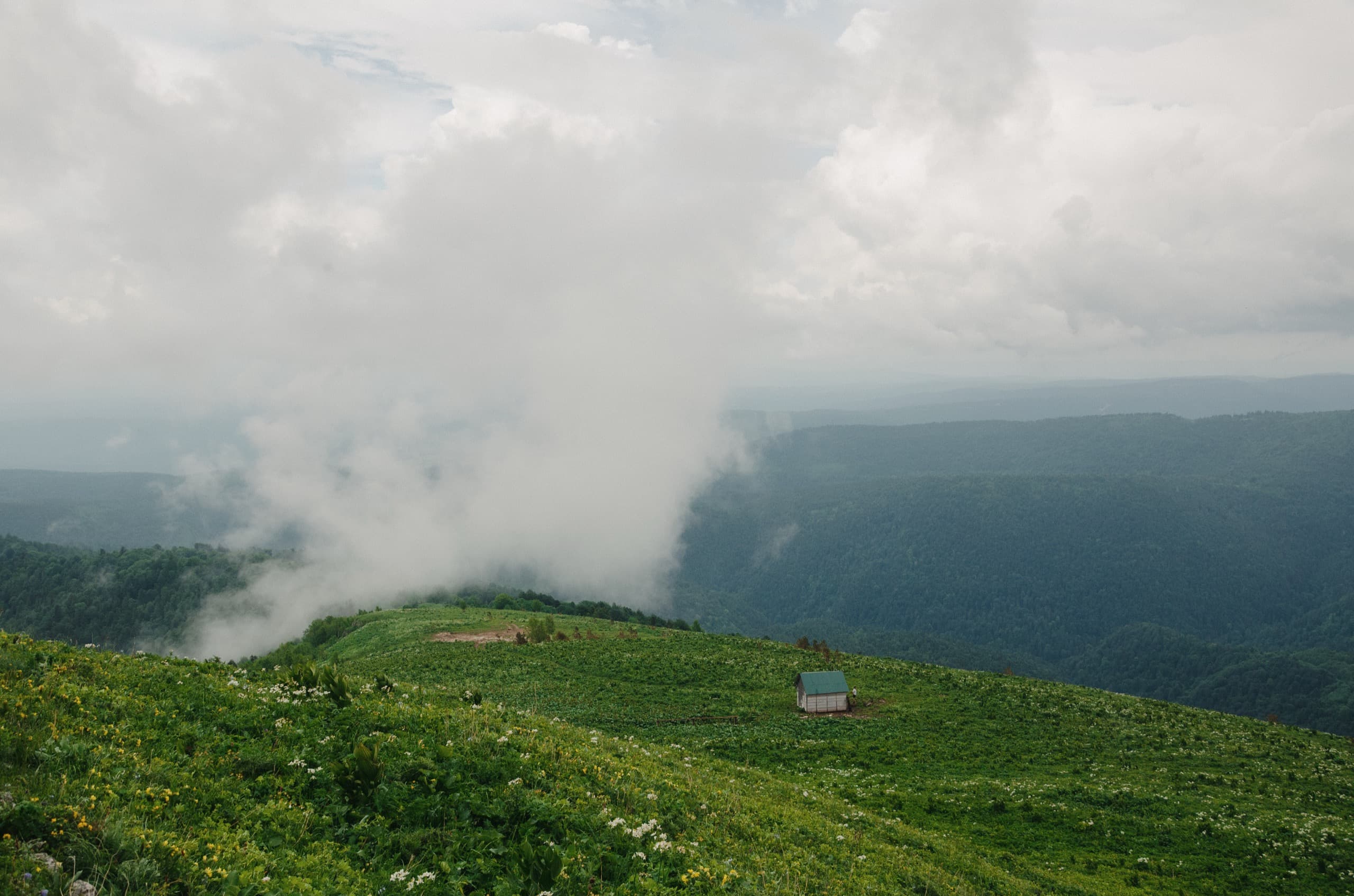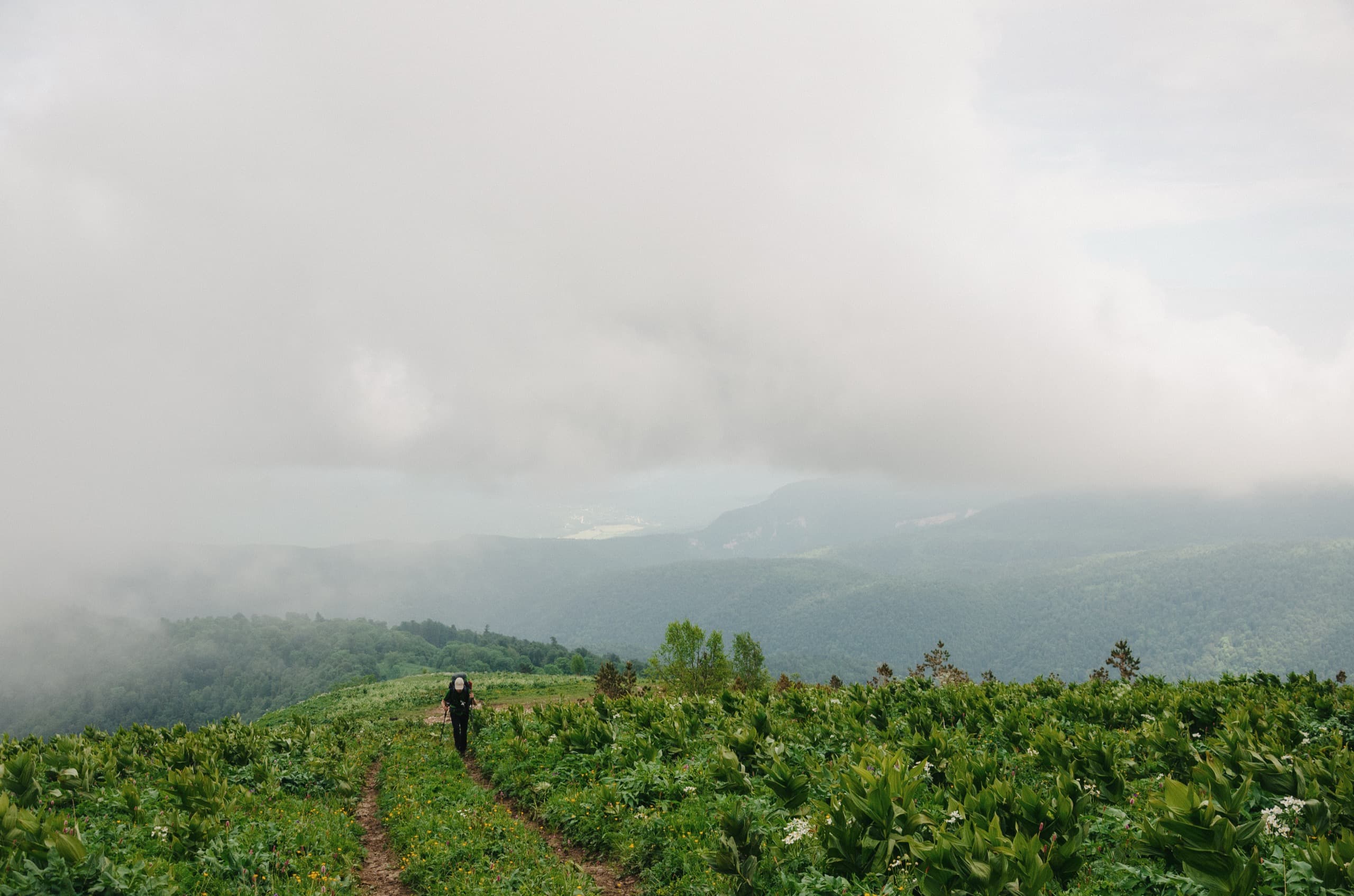 А тем временем небо вокруг начало стремительно хмуриться. К моменту, когда мы вышли в зону лугов, окружающие просторы съела налетевшая облачность. Низкие облака плотным занавесом укрыли все возвышенности, оставив глазу только то, что располагалось ниже нас.