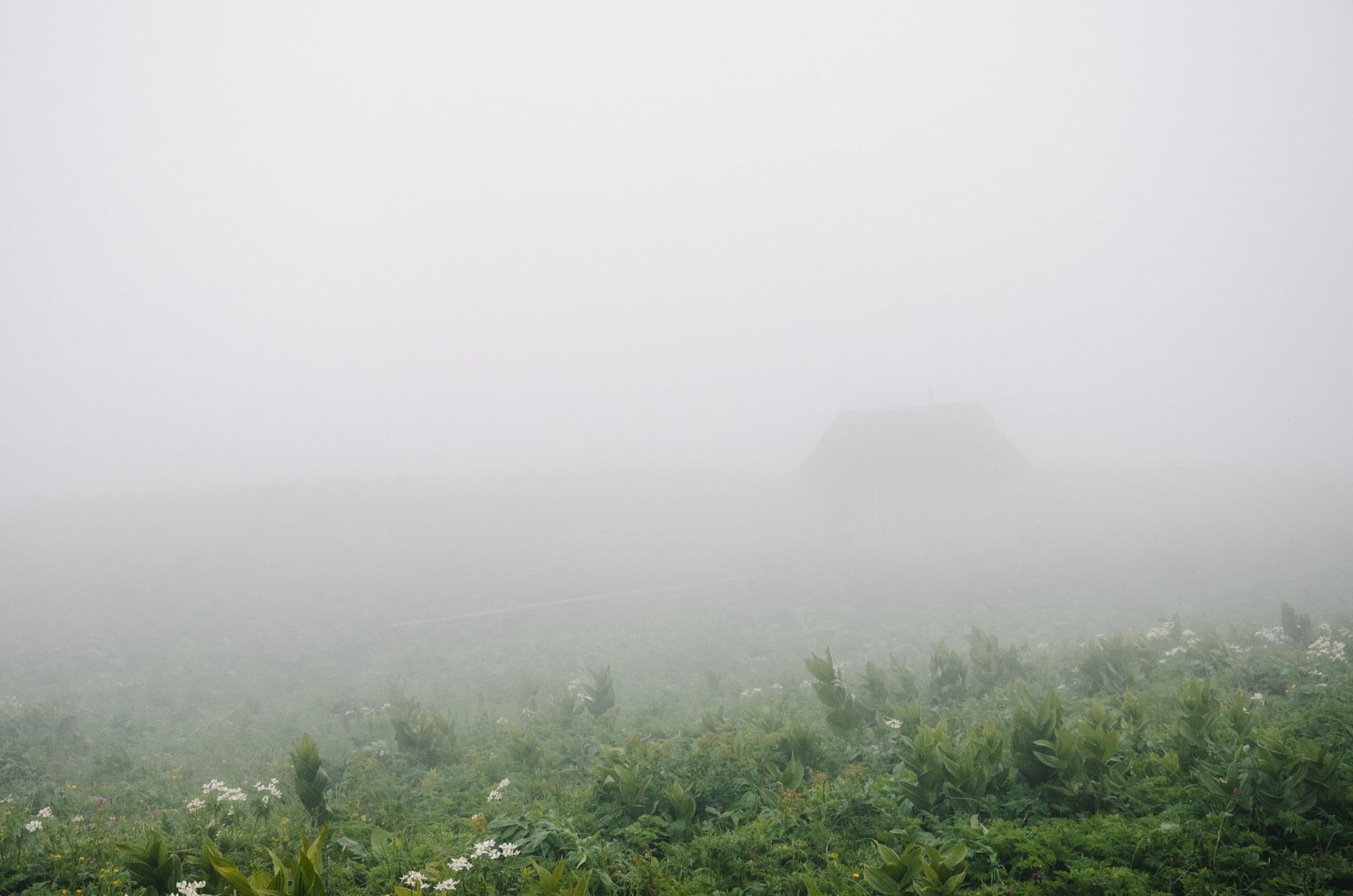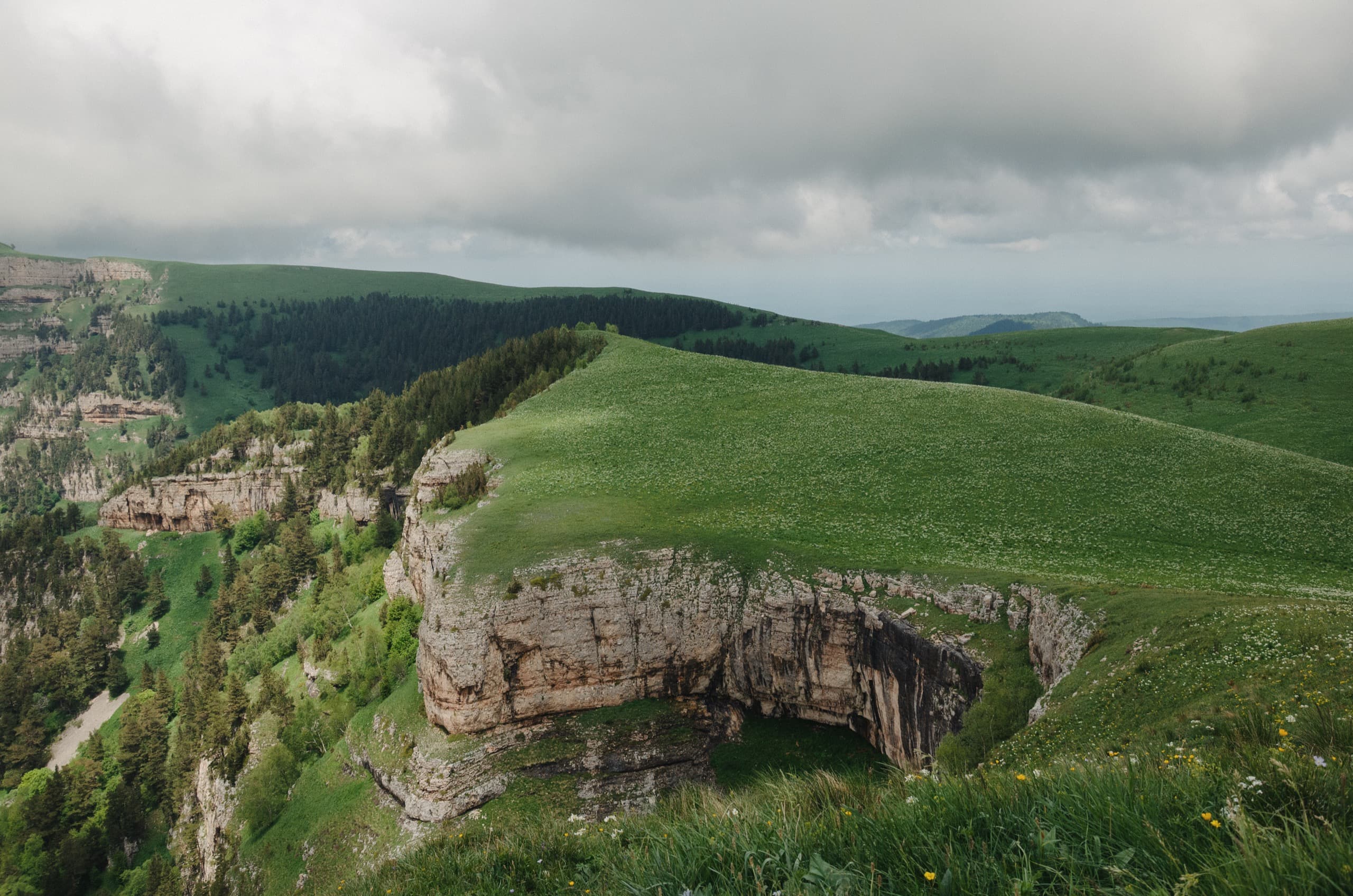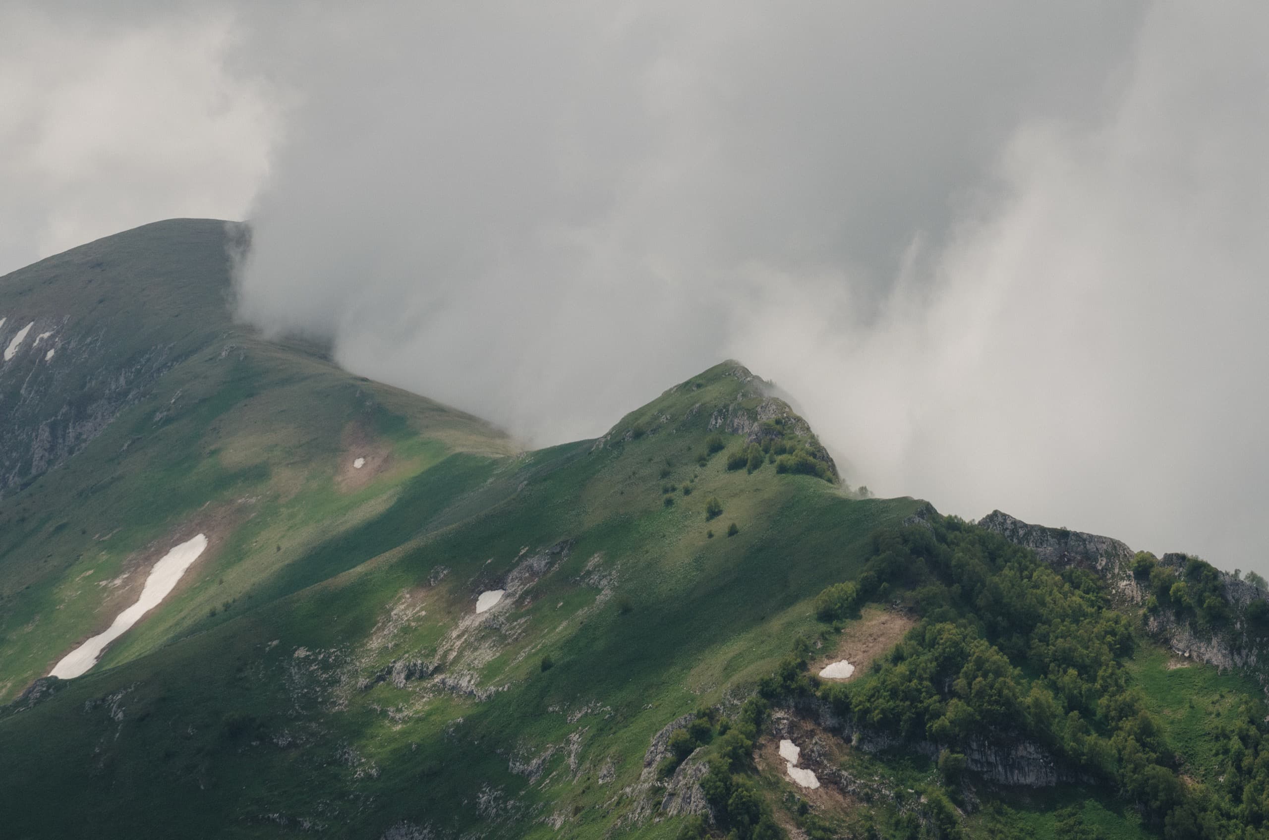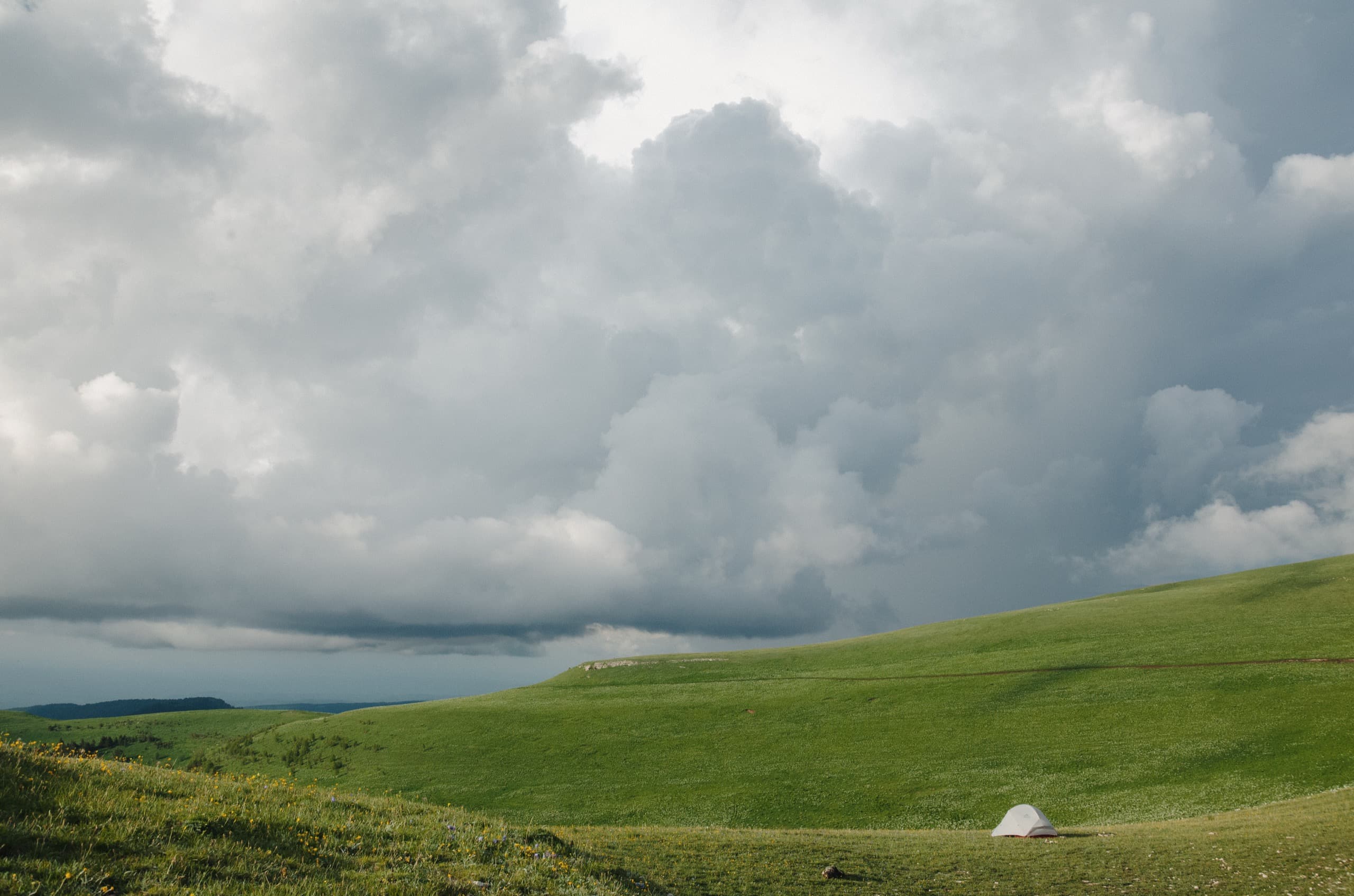 А тем временем небо вокруг начало стремительно хмуриться. К моменту, когда мы вышли в зону лугов, окружающие просторы съела налетевшая облачность. Низкие облака плотным занавесом укрыли все возвышенности, оставив глазу только то, что располагалось ниже нас.