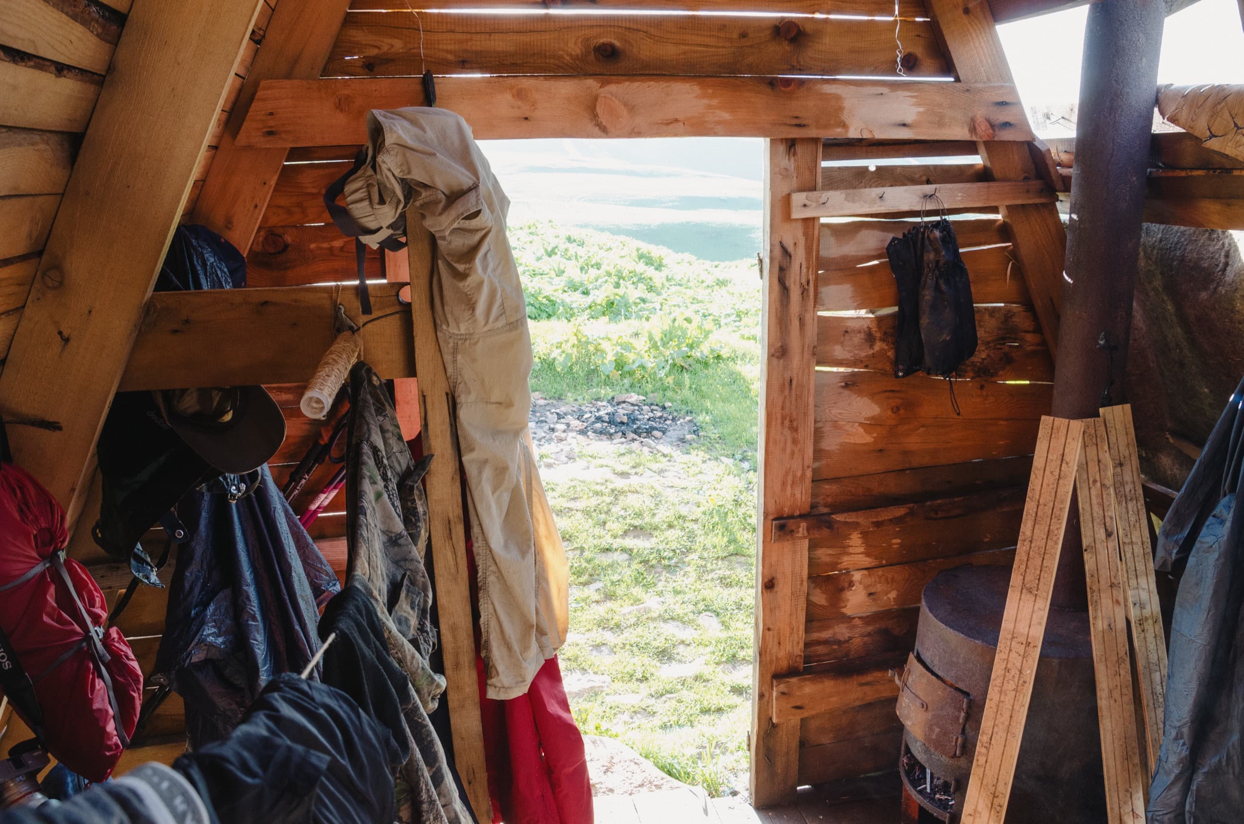 В домике свалили все вещи на одну сторону. Полка там была сухой, а значит домик заливает не весь. Распаковались, попробовали просушиться. Печка была в наличии, но с дровами проблемы. Какие-то мелочи нашли, но их явно не хватало для хорошего жара. А ботинки — болото, штаны хоть выжимай.