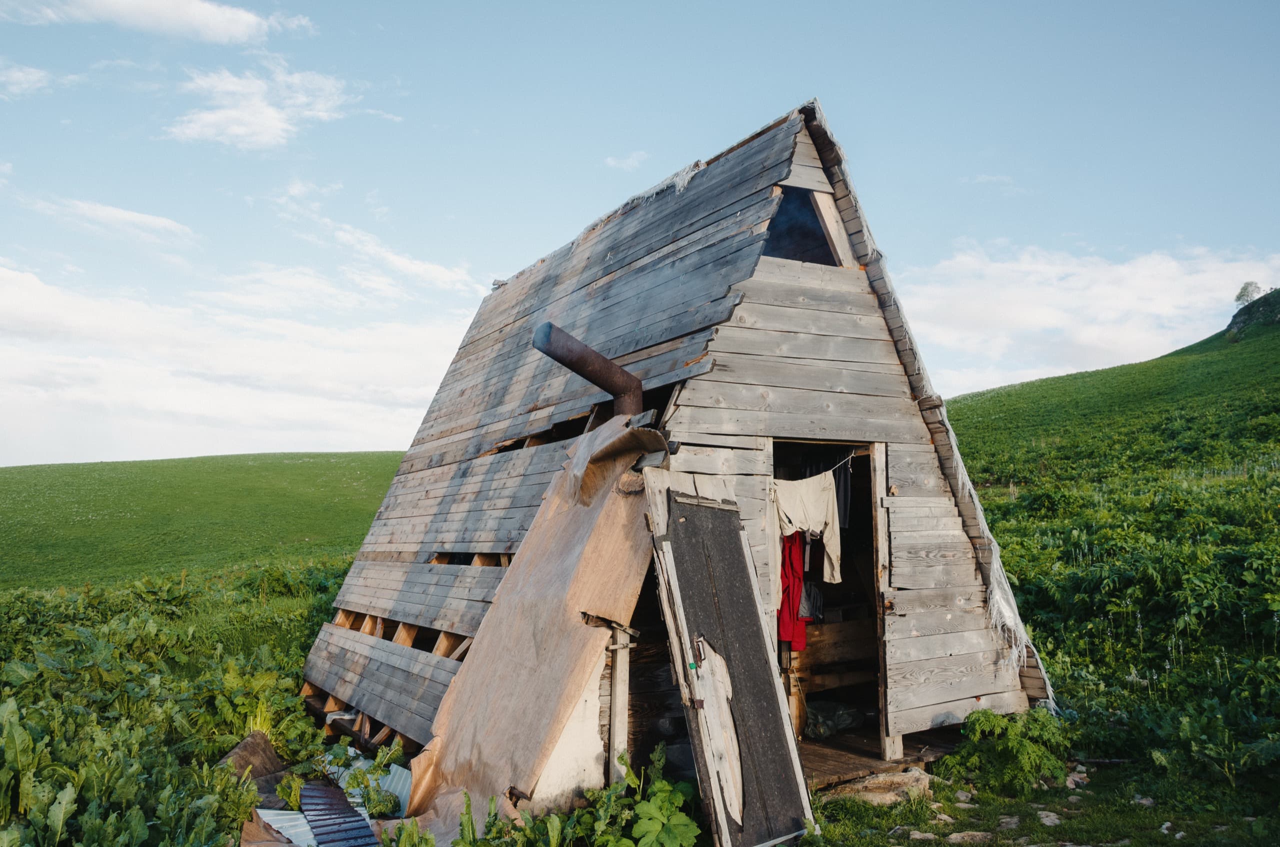 Домик под Житной сильно уступал кошу у Буквы. В крыше зияли бреши, конёк отсутствовал, дверь сорвана с петель. Рядом стоял вагончик, но он был занят. Там расположился Сергей, пастух.