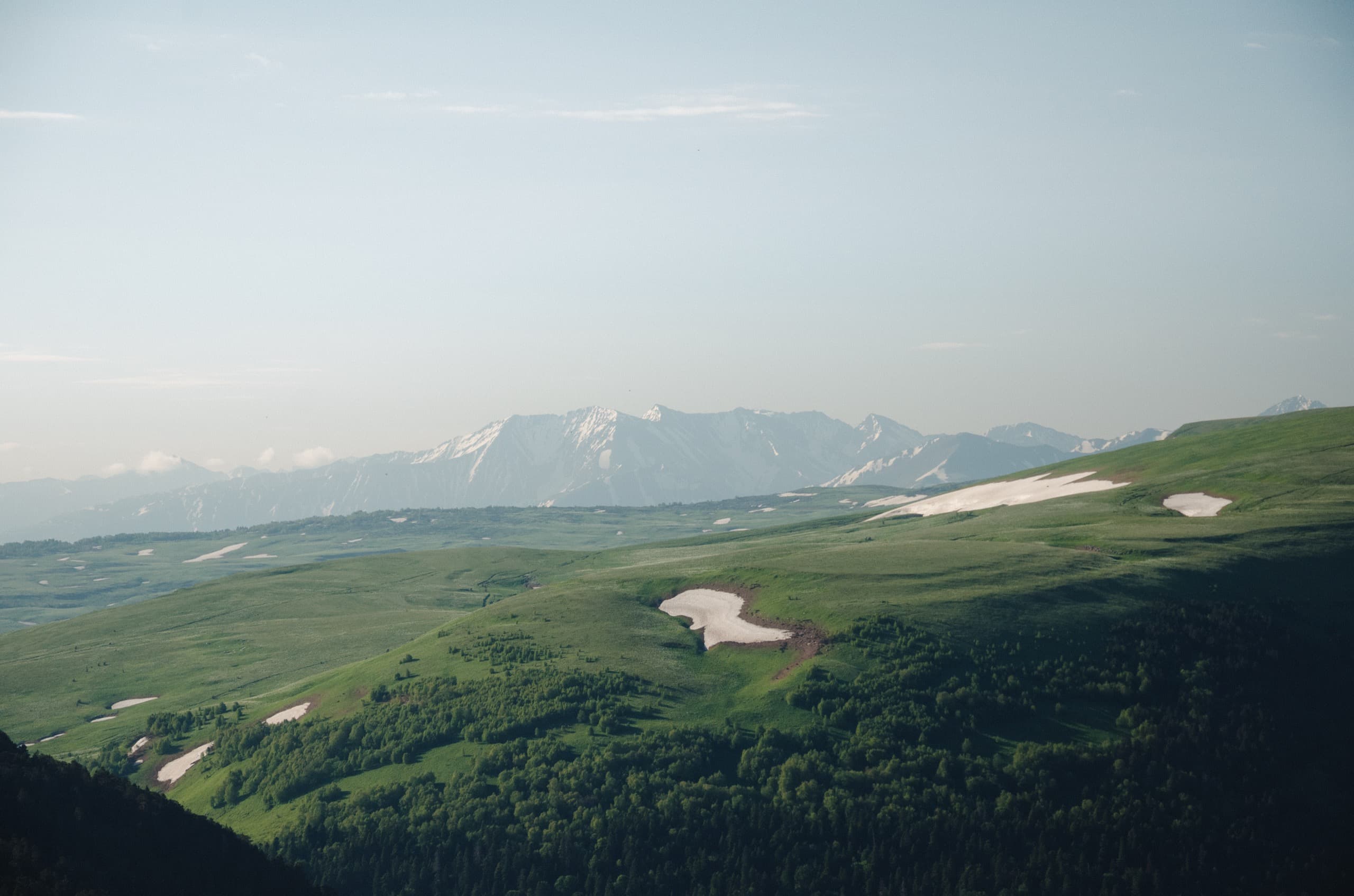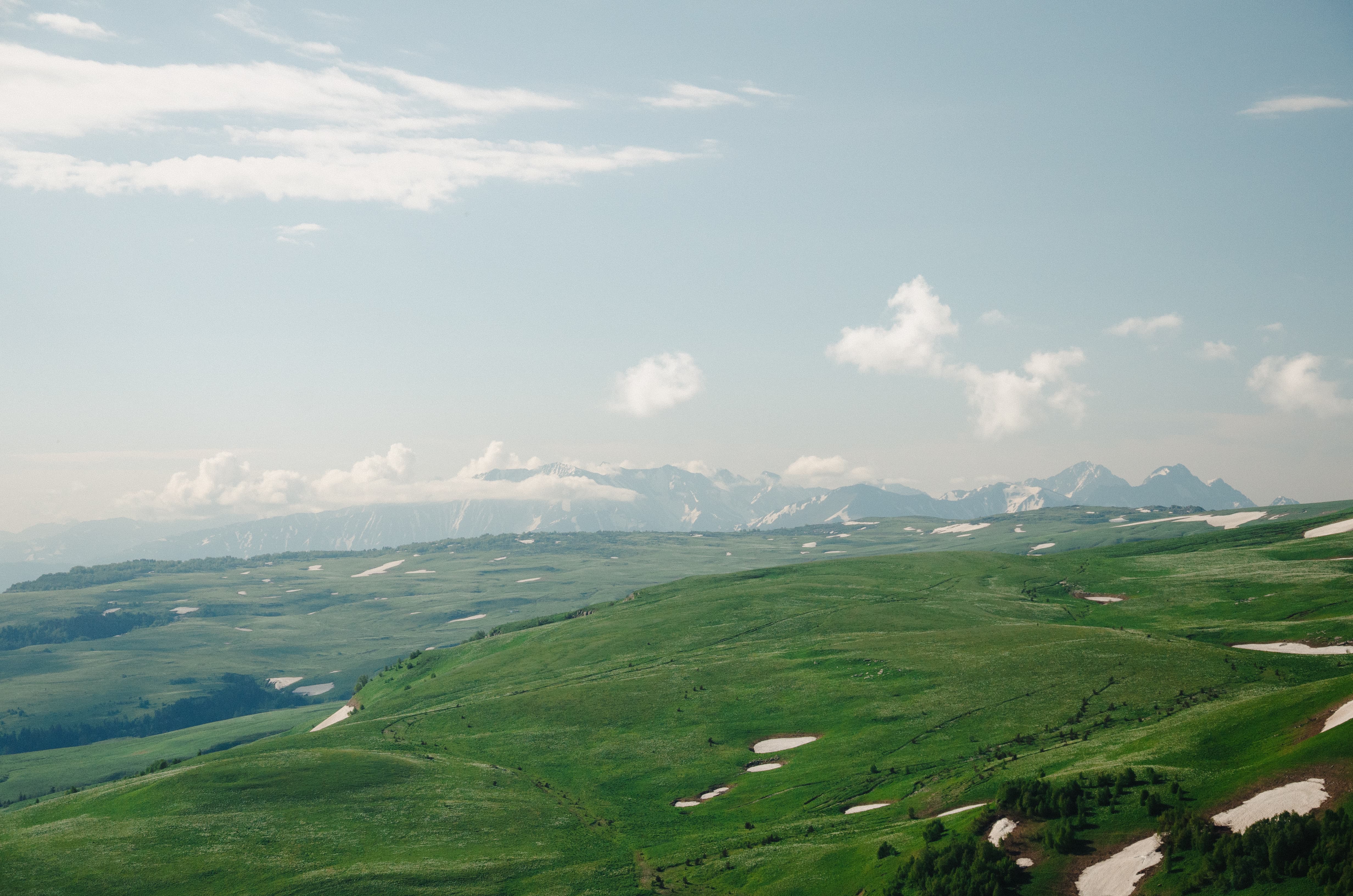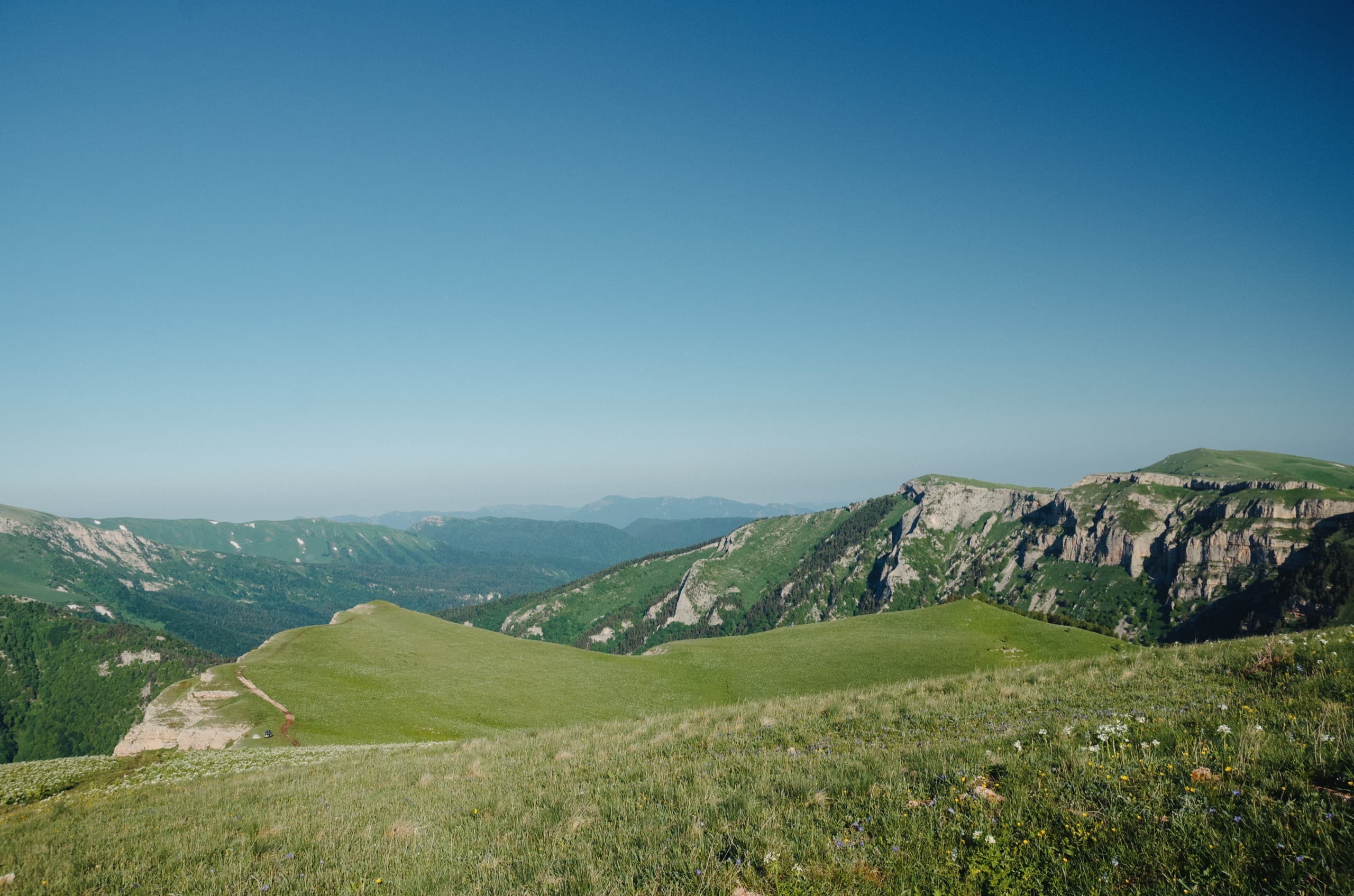 На мгновение по правую руку открылся хороший вид на Фишт-Оштеновский массив, но вскоре он скрылся за склонами горы Уриэль, которая с этой стороны выглядела невзрачным зелёным холмиком. За Уриэлью взору предстала равнина, как раз тот самый участок нагорья, который можно назвать плато. А за всем этим великолепием поднимались известные мне лишь по картам массивы Чугуша.